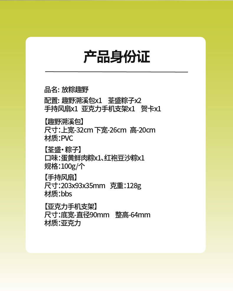 端午从不只是怀旧的仪式,它亦是夏日的序章 以「生长」为笔,将时节的光影揉进礼包 向山野借一缕风,让粽叶包裹的不仅是糯米的温润 更是对自然与生活的赤诚向往 端午安康,不止于祈愿,愿这份「放粽趣野」 陪你攀过烈日与骤雨,于奔赴中织就自由的模样 更愿你如夏花绚烂,心向之处,万物可期 内配: 配置一:趣野溯溪包x1 配置二:荃盛粽子x2 配置三:手持风扇x1 配置四:亚克力手机支架x1 配置五:贺卡x1