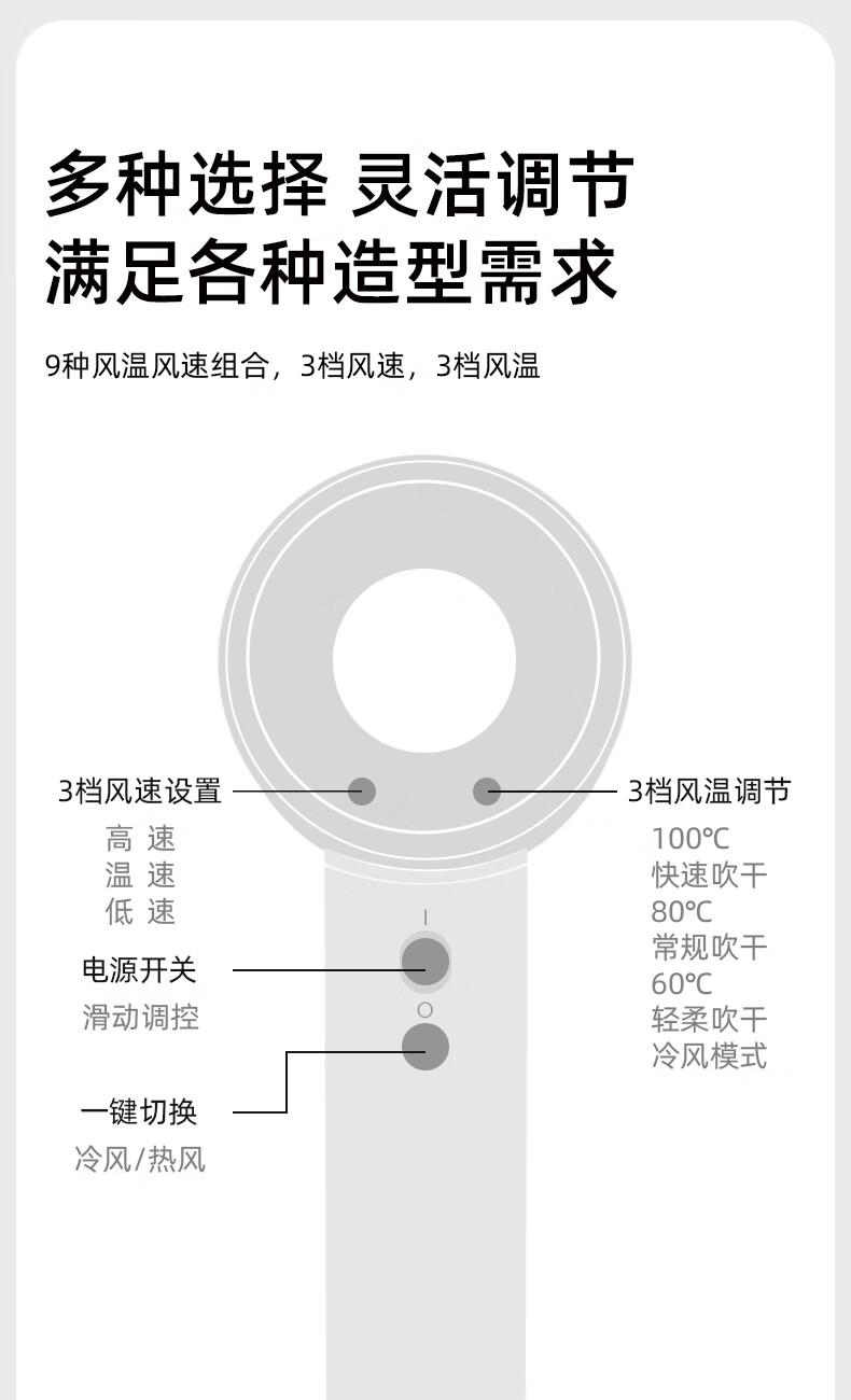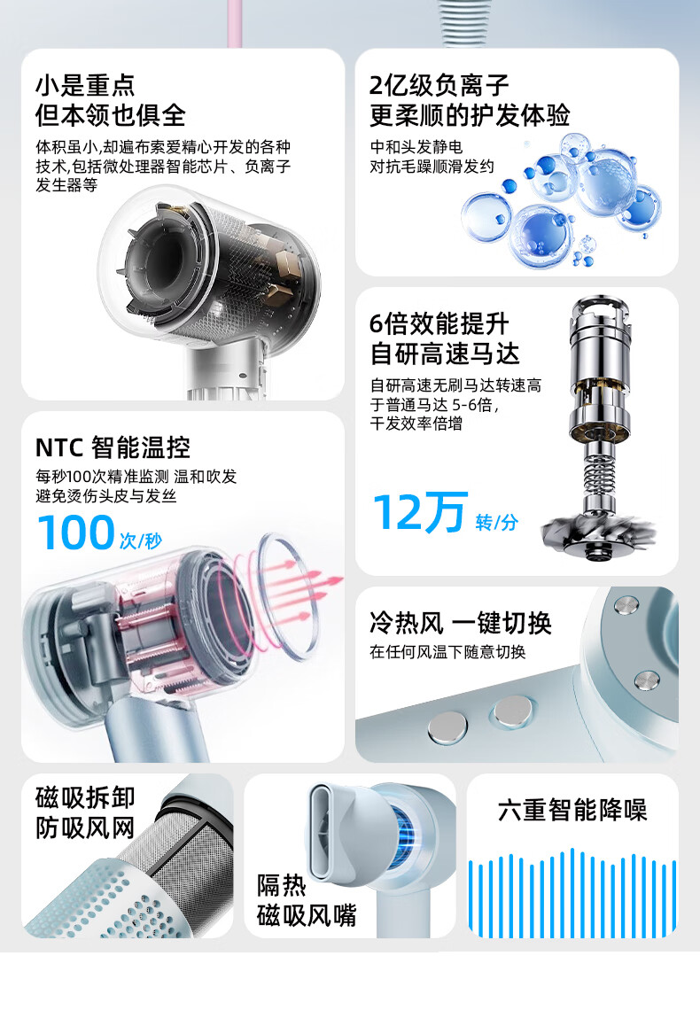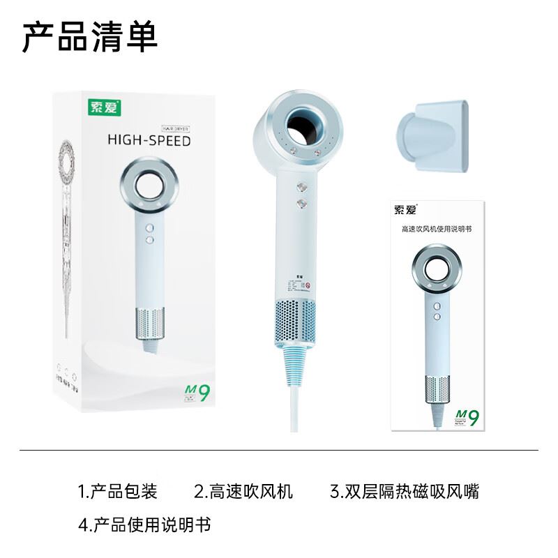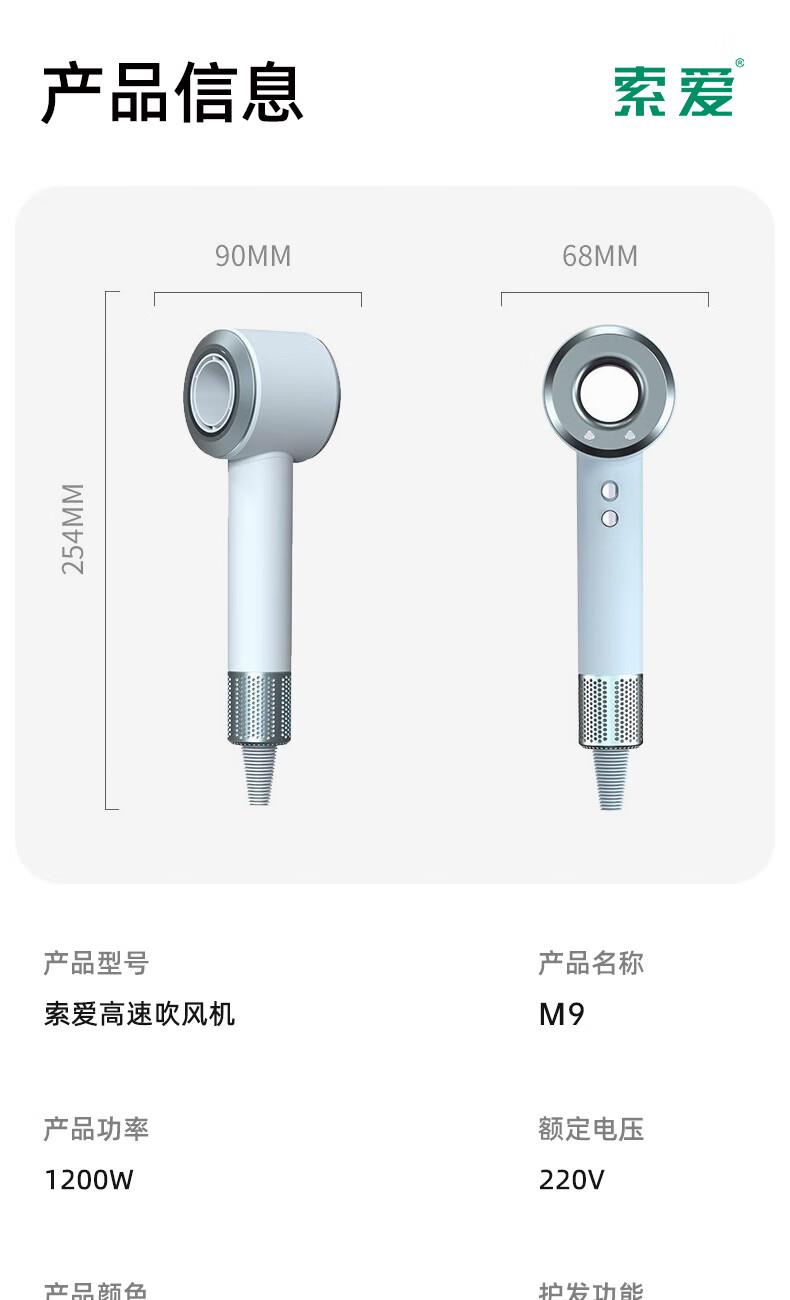 索爱M9高速智能无叶中空负离子智能变频速干冷热风大功率电吹风】 附加功能:功率1450W 智能变频控温,智能过热自动断电保护 2亿负离子,速干/冷热/滋养护发更柔顺 智能无叶搭载高速2万转升级马达,送双层防烫磁吸吹风嘴,不可折叠手柄,六档调节 电线外露2米.线加粗加长,三脚扁插,礼盒天地盖塑封包装