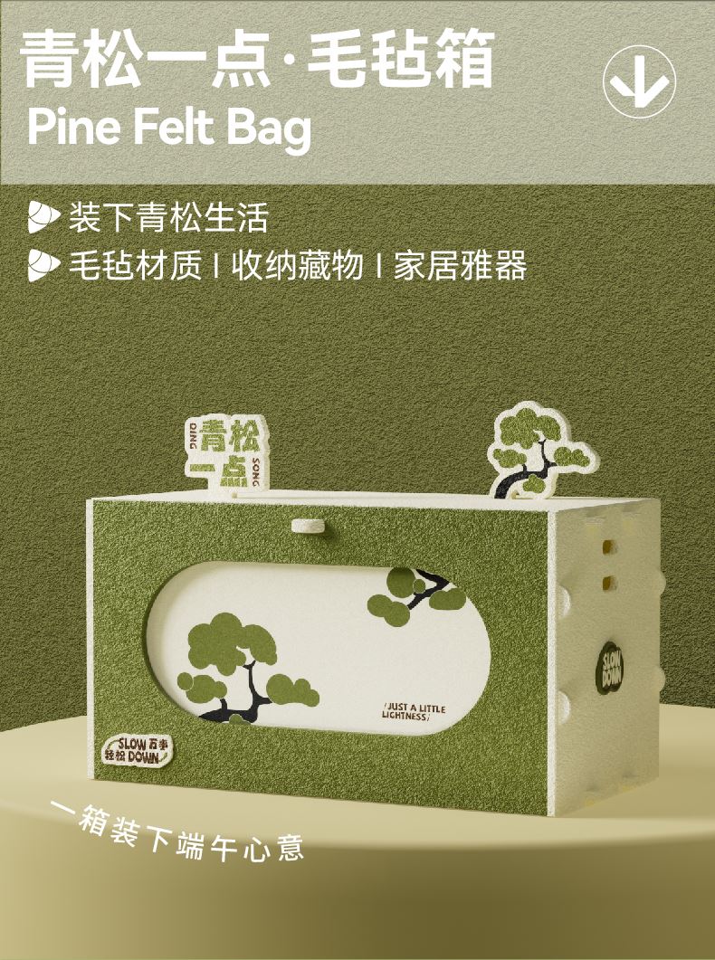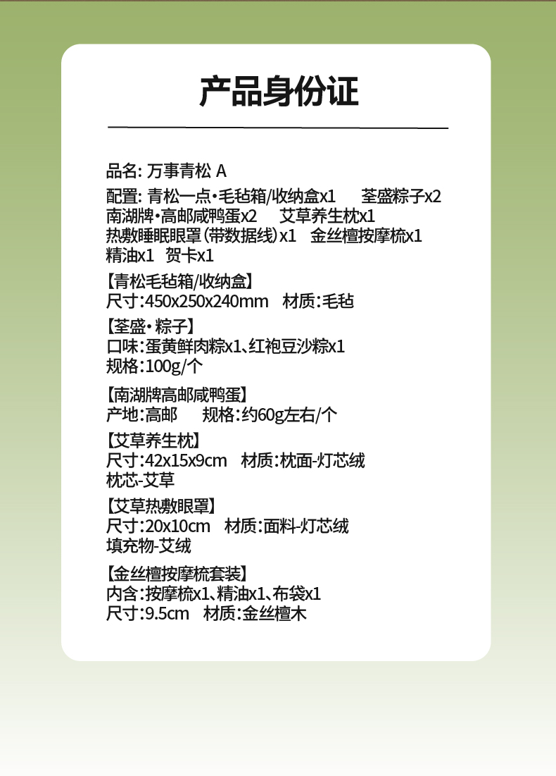 万物繁茂的时节,,愿你的生活有一棵自己的松。 不必太用力,该生长时生长,该停歇时停歇。 风吹过针叶的细响,是日子在轻声应和 万事青松,自在从容 这一季,祝你:心有苍翠,步履轻盈 内配: 配置一:青松一点·毛毡箱/收纳盒x1 配置二:荃盛粽子x2 配置三:南湖牌·高邮咸鸭蛋x2 配置四:艾草养生枕x1 配置五:热敷睡眠眼罩(带数据线)x1 配置六:金丝檀按摩梳x1 配置七:精油x1配置八:贺卡x1