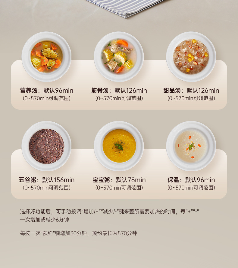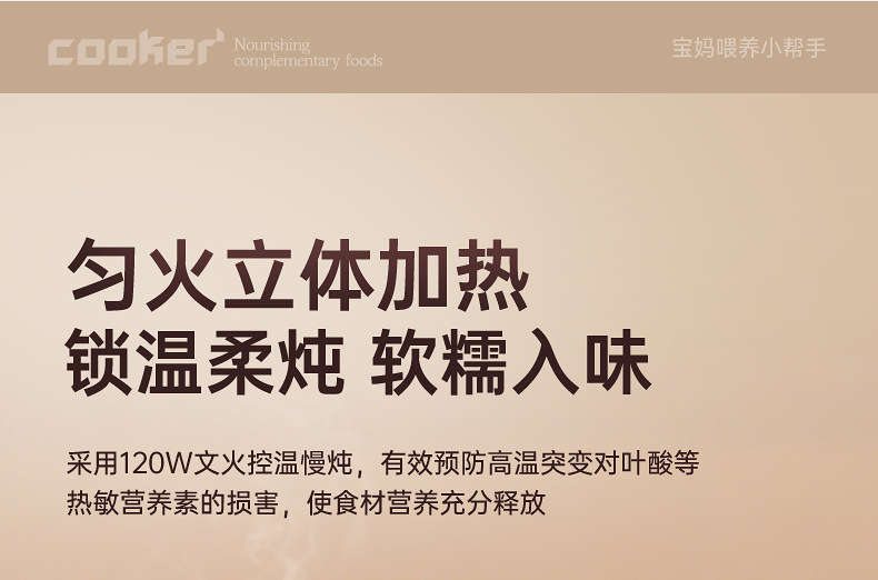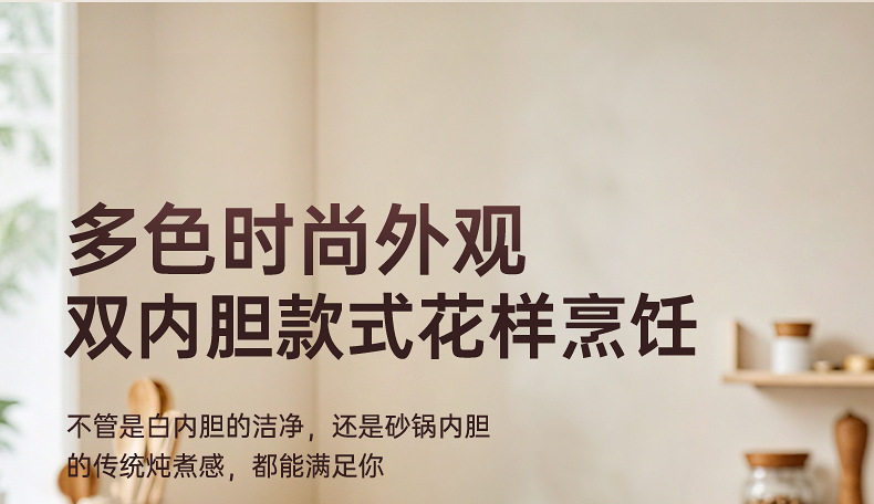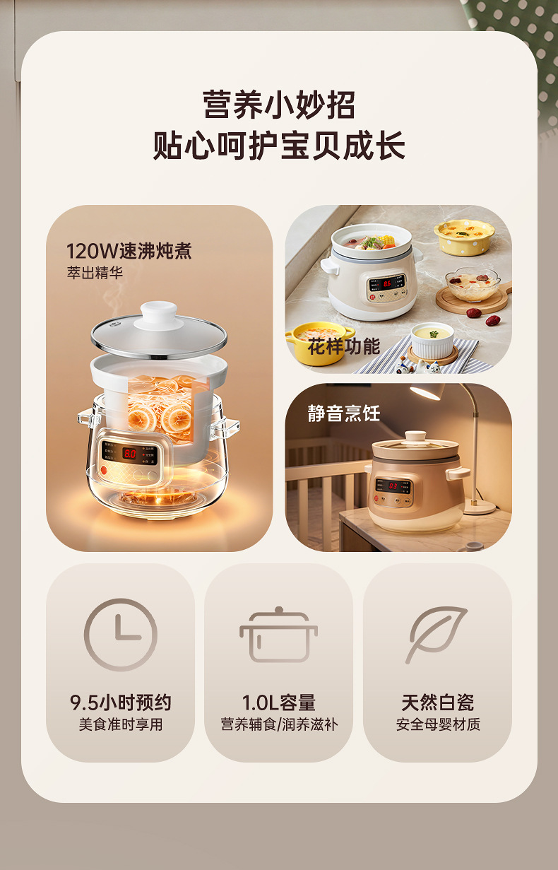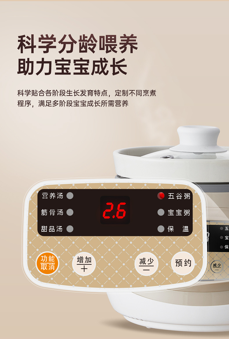 额定功率:120W 额定电压:220V 产品颜色:少女粉粉/天空蓝蓝/魅力杏 主机容量:1L 产品款式:微电脑智能 包装清单:主机、透明盖、蒸格、电源线、说明书 特色功能 1、智能免看管;可视化锅盖,白瓷内胆; 2、6大功能,可预约定时;铝锅发热盘,导热快; 3、PP防烫把手,防止防烫双手; 4、自动断电,防干烧功能;一机多用;