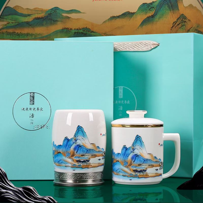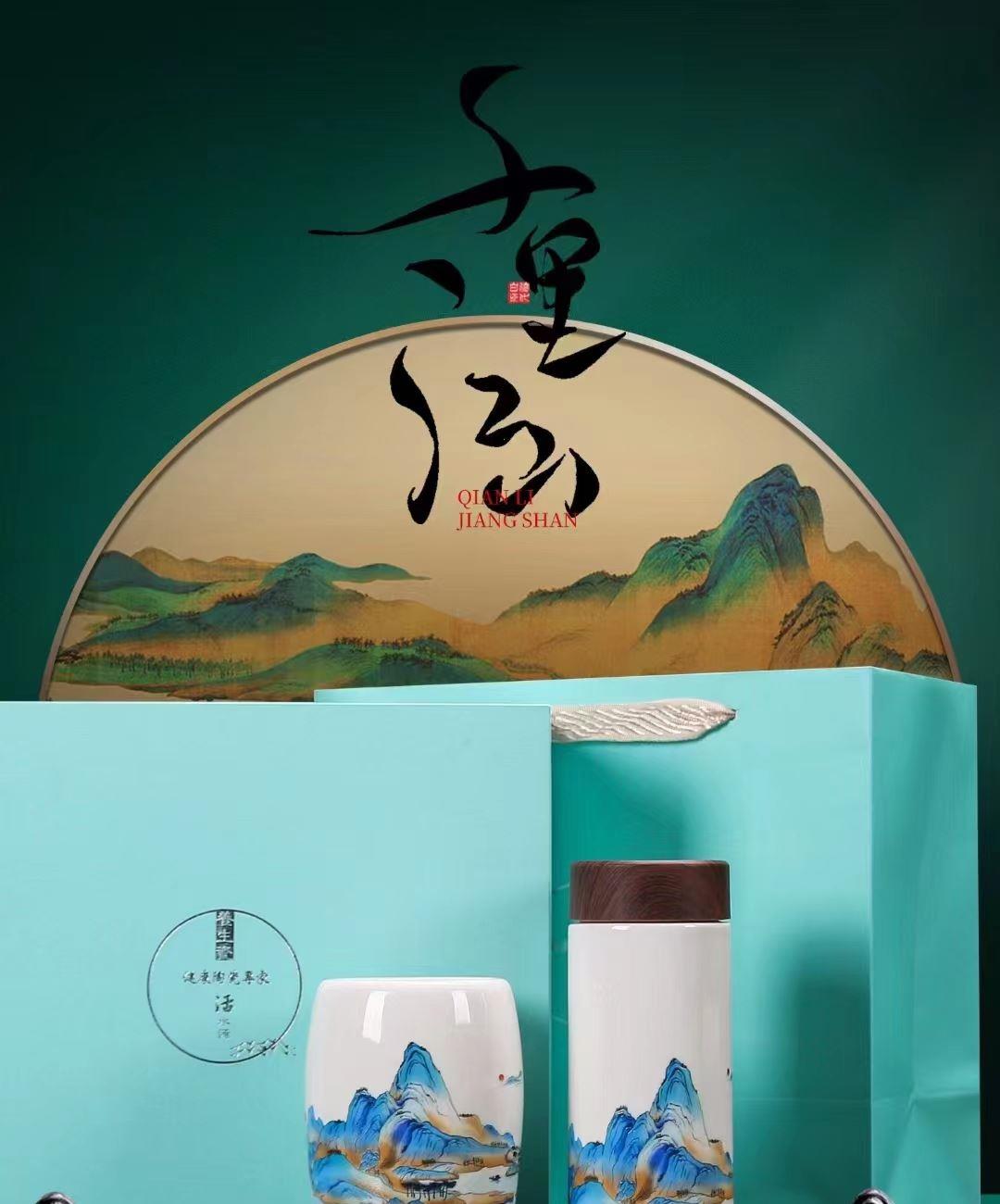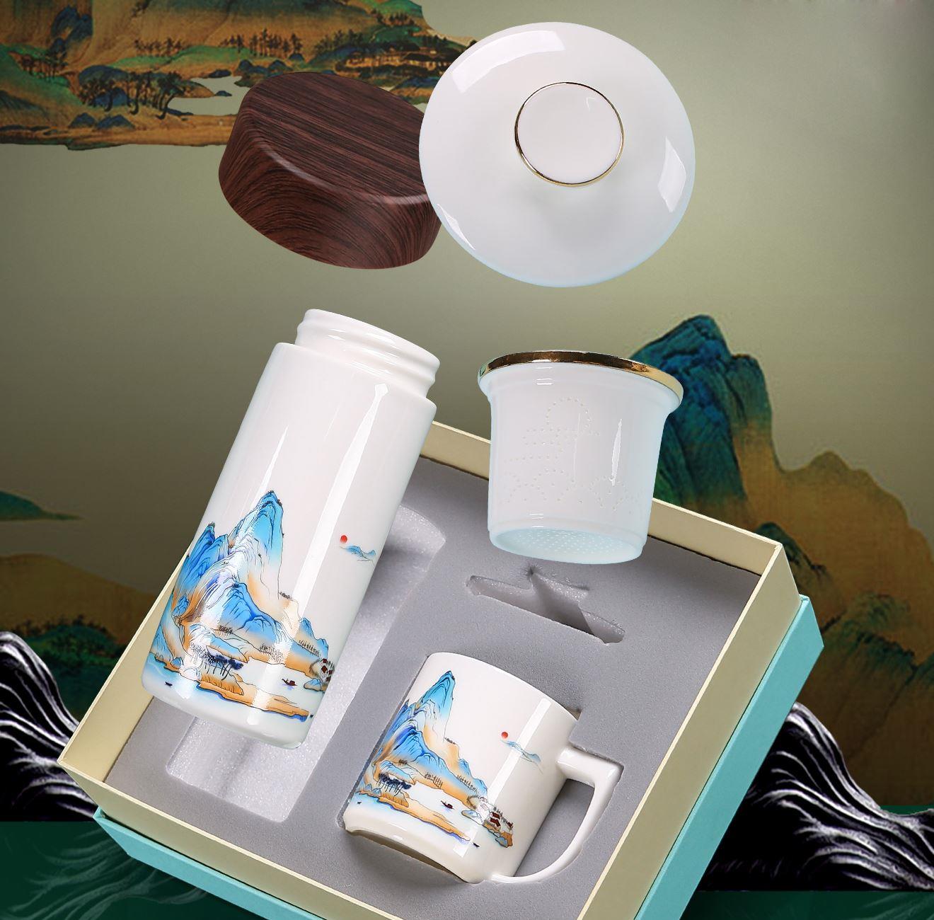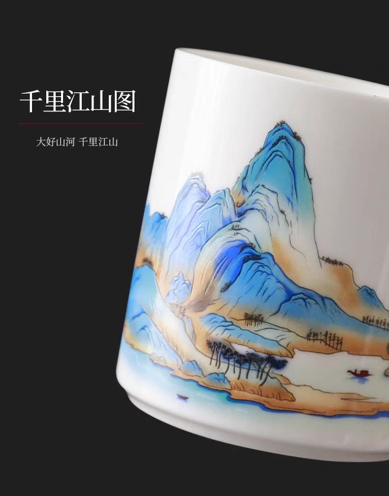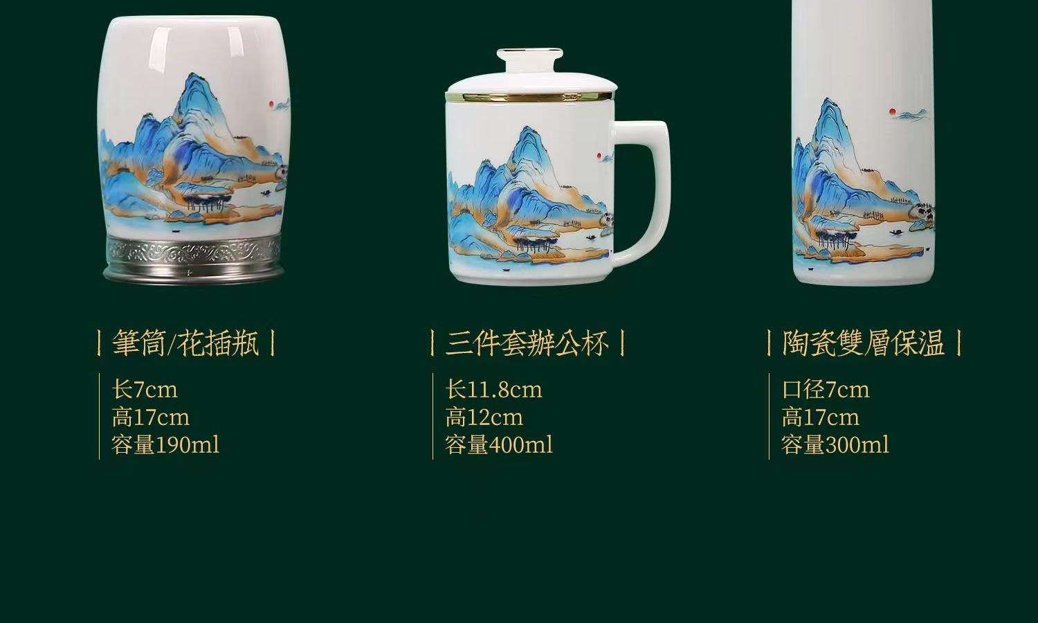 配 制: 1杯 1盖 1过滤+1合金笔筒 或 1杯 1盖 1过滤+1保温杯或 1保温杯+1合金笔筒 1礼盒手提袋 规格: 办公杯:12*11.5cm 双层保温杯:17.5*7cm 合金笔筒:12.5*9cm 材质:羊脂玉瓷 描24K真金 珐琅彩花面 合金底座笔筒 工艺:羊脂玉瓷茶具,描金装饰,做工精致,品质非凡。中国崛起,万里江山如此多娇。杯身可定制图案LOGO,盖顶可激光雕刻。