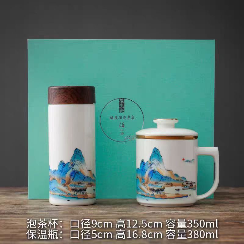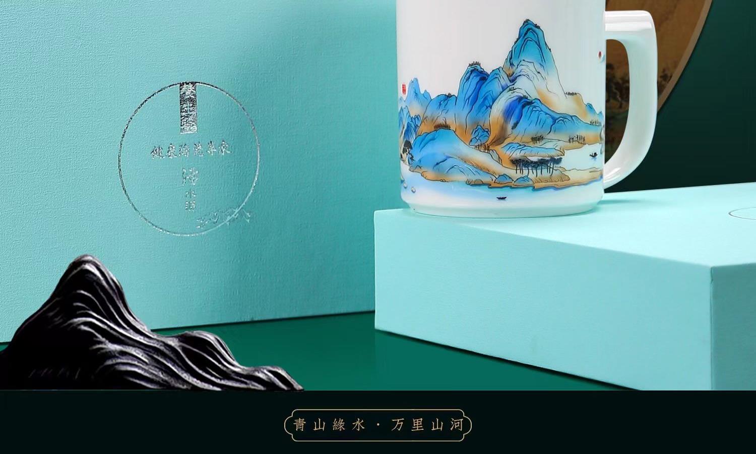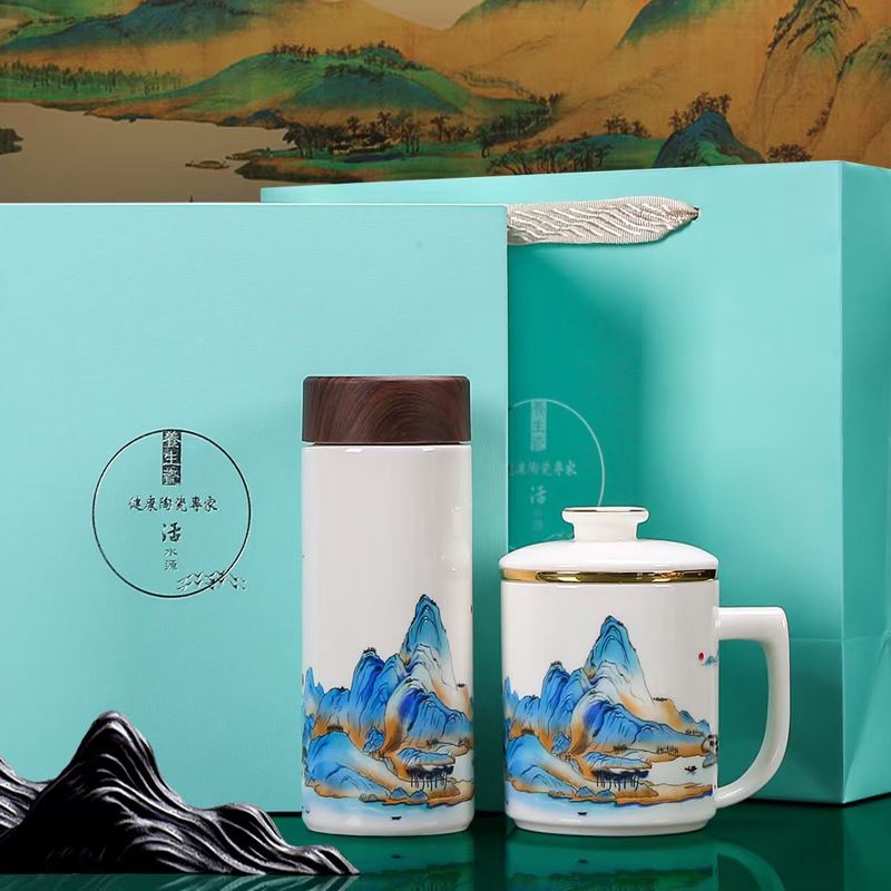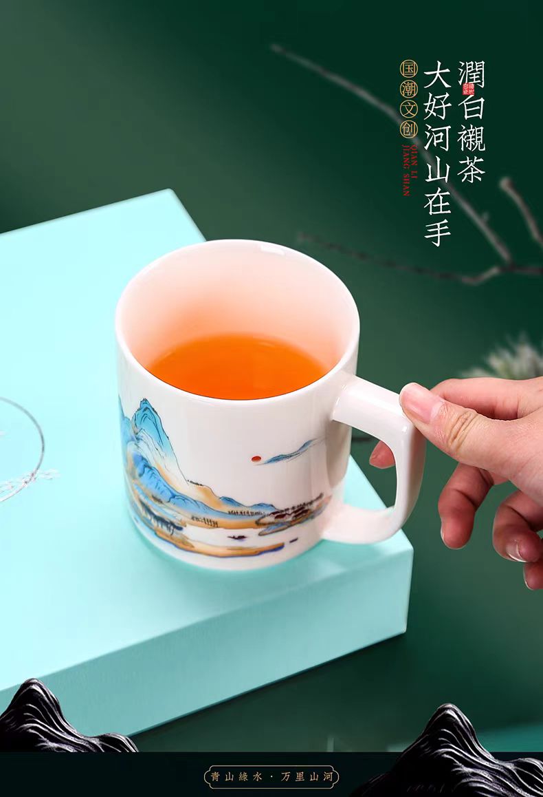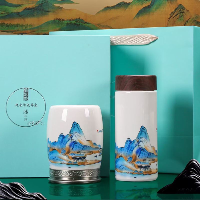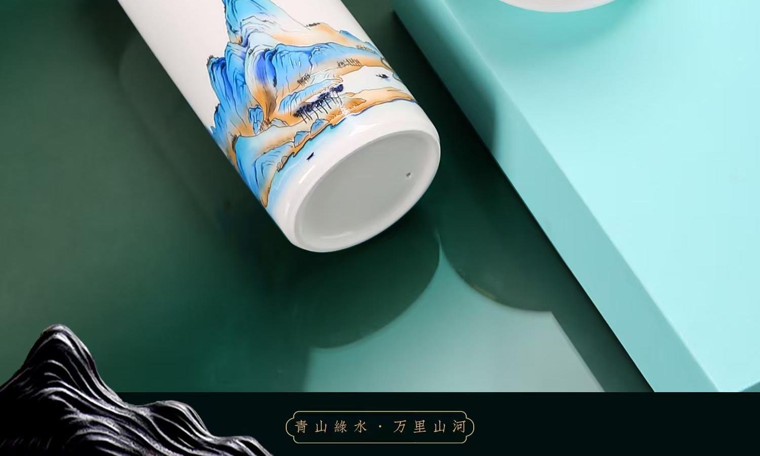配 制: 1杯 1盖 1过滤+1合金笔筒 或 1杯 1盖 1过滤+1保温杯或 1保温杯+1合金笔筒 1礼盒手提袋 规格: 办公杯:12*11.5cm 双层保温杯:17.5*7cm 合金笔筒:12.5*9cm 材质:羊脂玉瓷 描24K真金 珐琅彩花面 合金底座笔筒 工艺:羊脂玉瓷茶具,描金装饰,做工精致,品质非凡。中国崛起,万里江山如此多娇。杯身可定制图案LOGO,盖顶可激光雕刻。