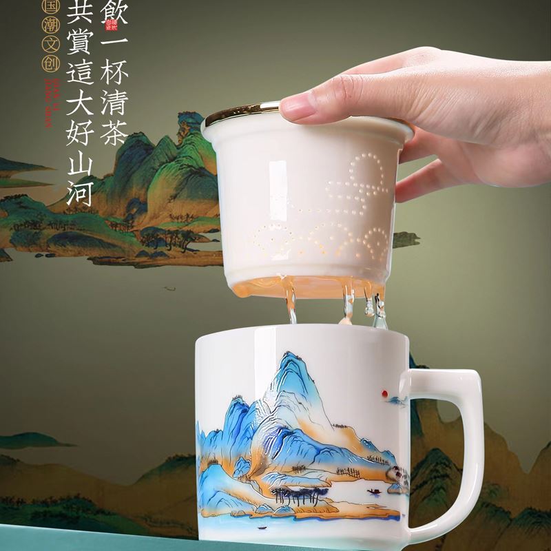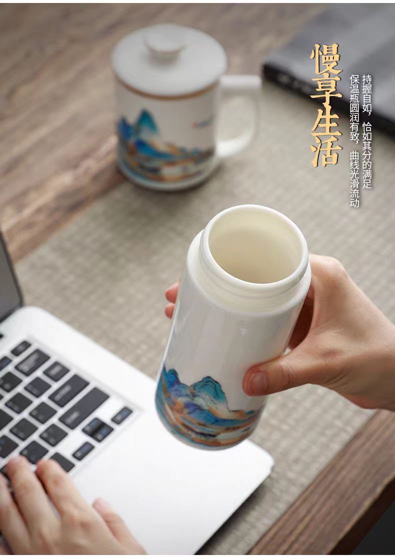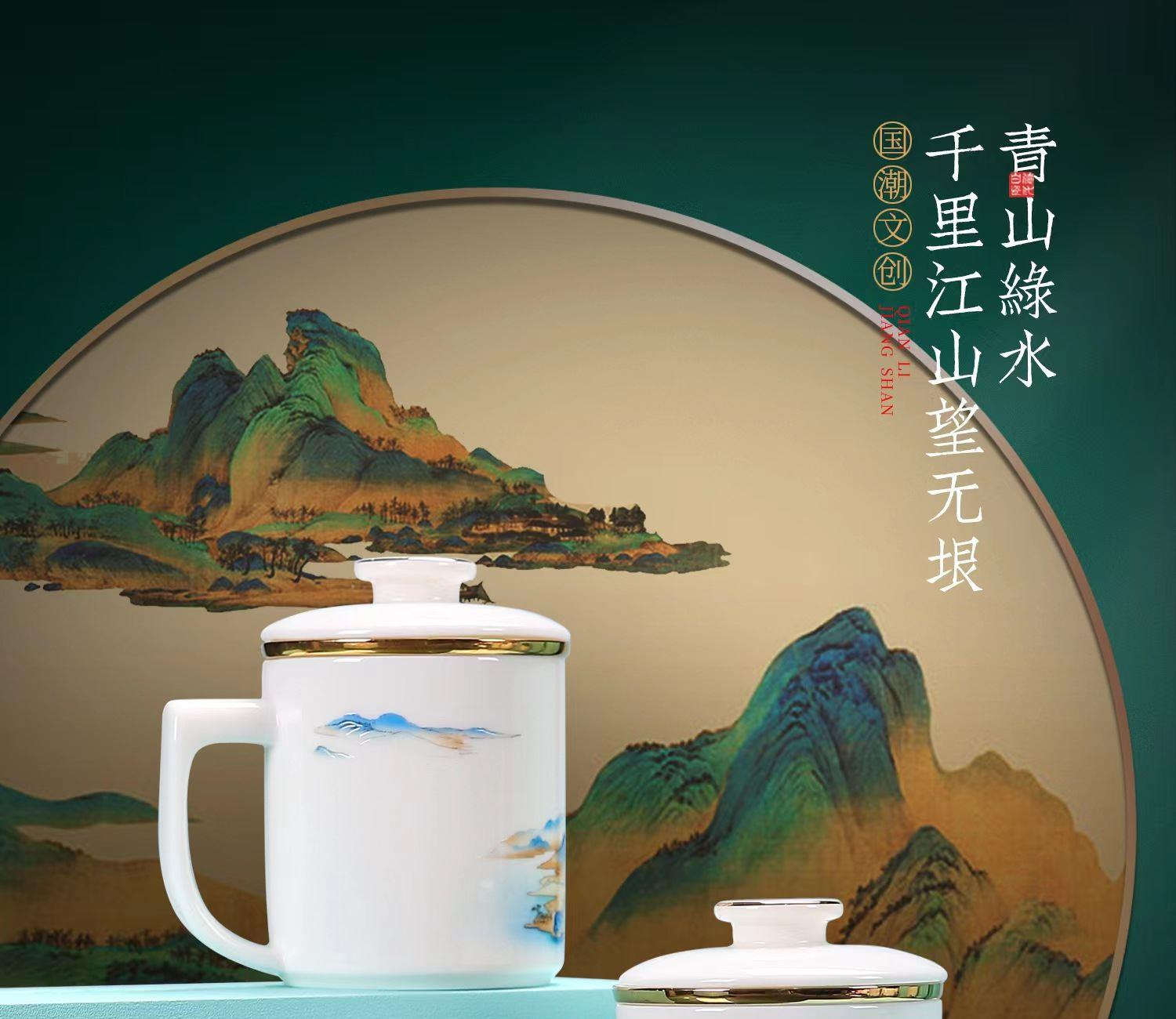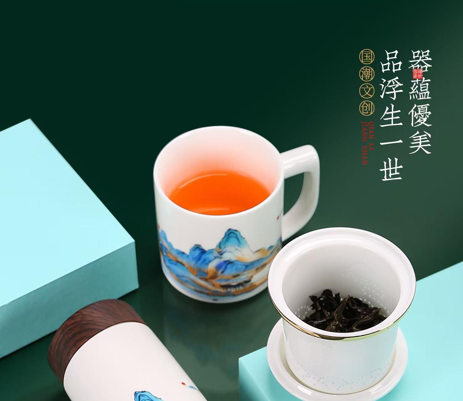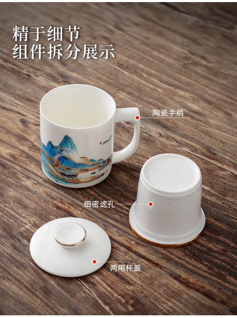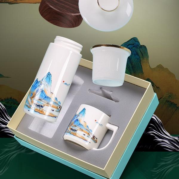 配 制: 1杯 1盖 1过滤+1合金笔筒 或 1杯 1盖 1过滤+1保温杯或 1保温杯+1合金笔筒 1礼盒手提袋 规格: 办公杯:12*11.5cm 双层保温杯:17.5*7cm 合金笔筒:12.5*9cm 材质:羊脂玉瓷 描24K真金 珐琅彩花面 合金底座笔筒 工艺:羊脂玉瓷茶具,描金装饰,做工精致,品质非凡。中国崛起,万里江山如此多娇。杯身可定制图案LOGO,盖顶可激光雕刻。