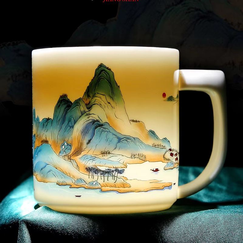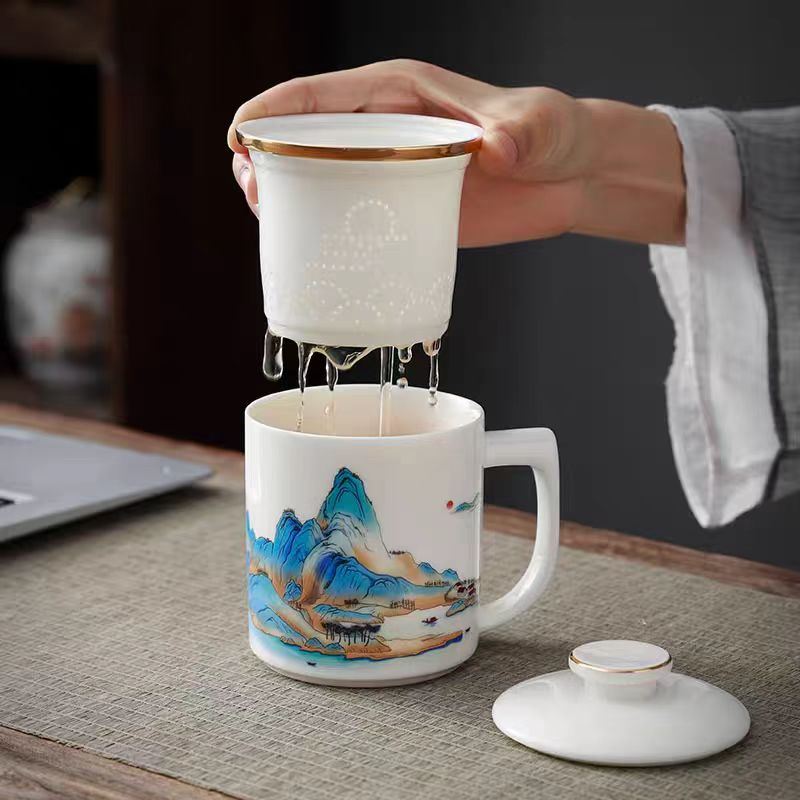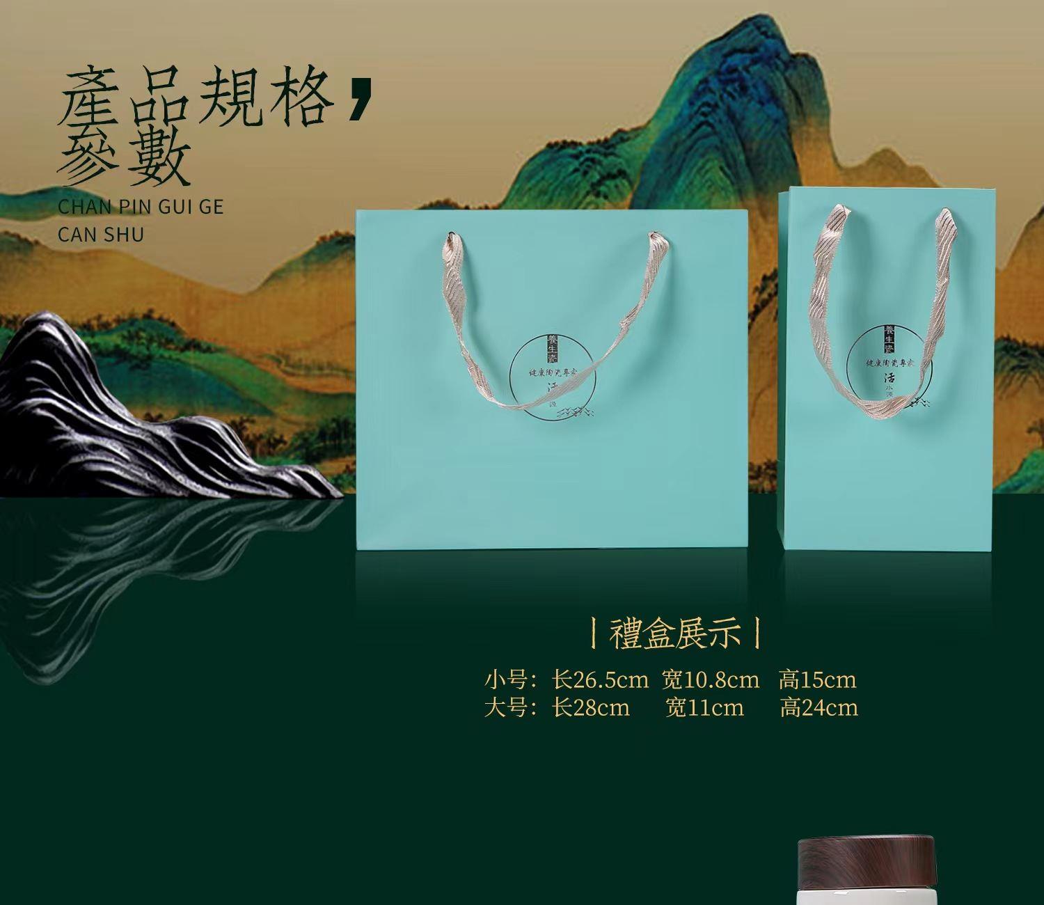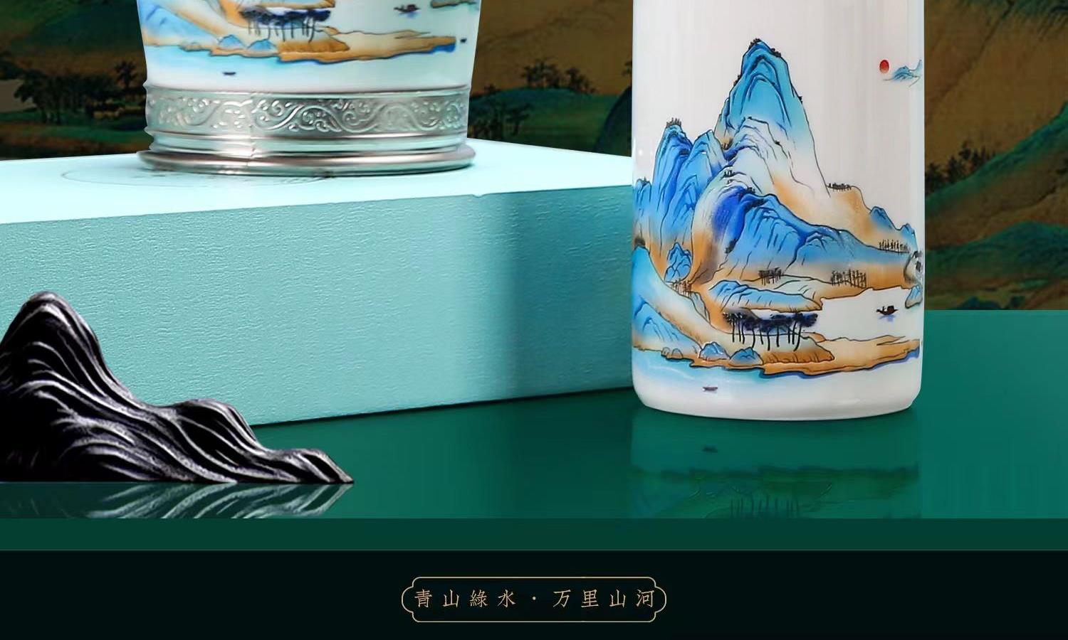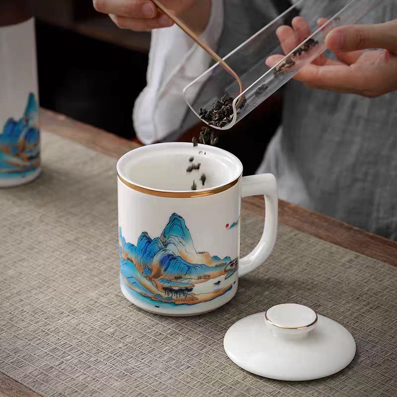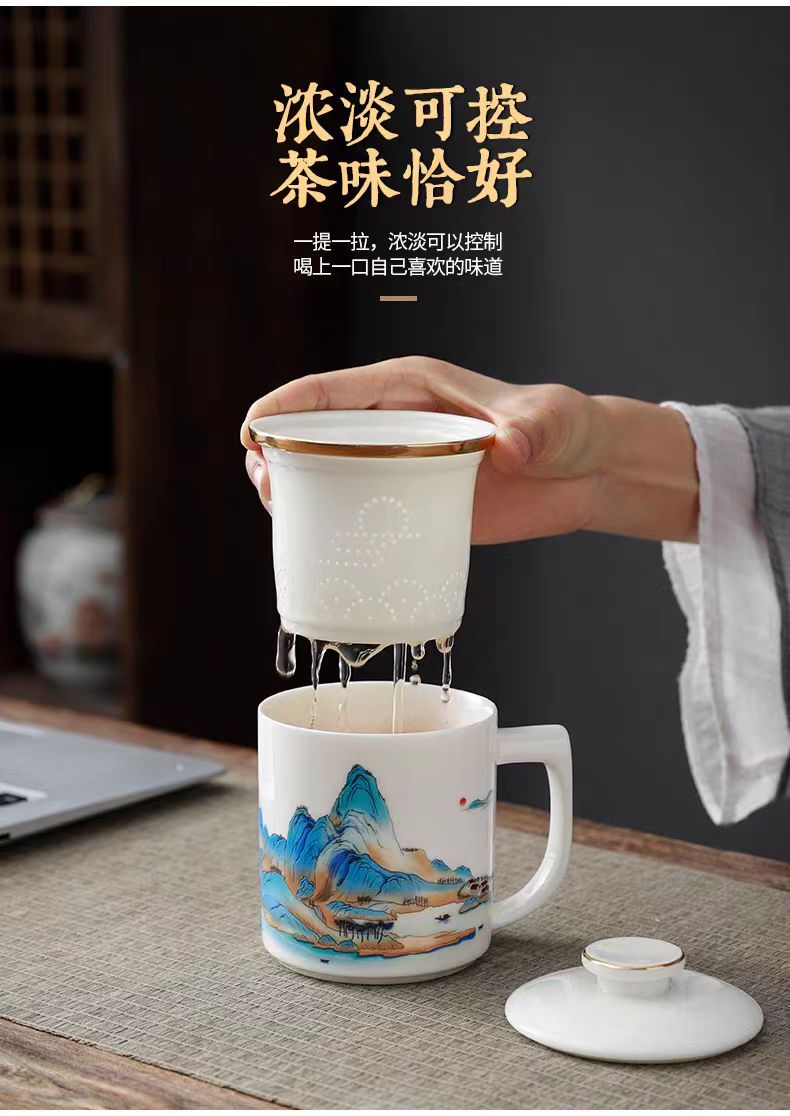 配 制: 1杯 1盖 1过滤+1合金笔筒 或 1杯 1盖 1过滤+1保温杯或 1保温杯+1合金笔筒 1礼盒手提袋 规格: 办公杯:12*11.5cm 双层保温杯:17.5*7cm 合金笔筒:12.5*9cm 材质:羊脂玉瓷 描24K真金 珐琅彩花面 合金底座笔筒 工艺:羊脂玉瓷茶具,描金装饰,做工精致,品质非凡。中国崛起,万里江山如此多娇。杯身可定制图案LOGO,盖顶可激光雕刻。