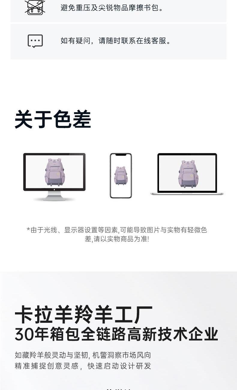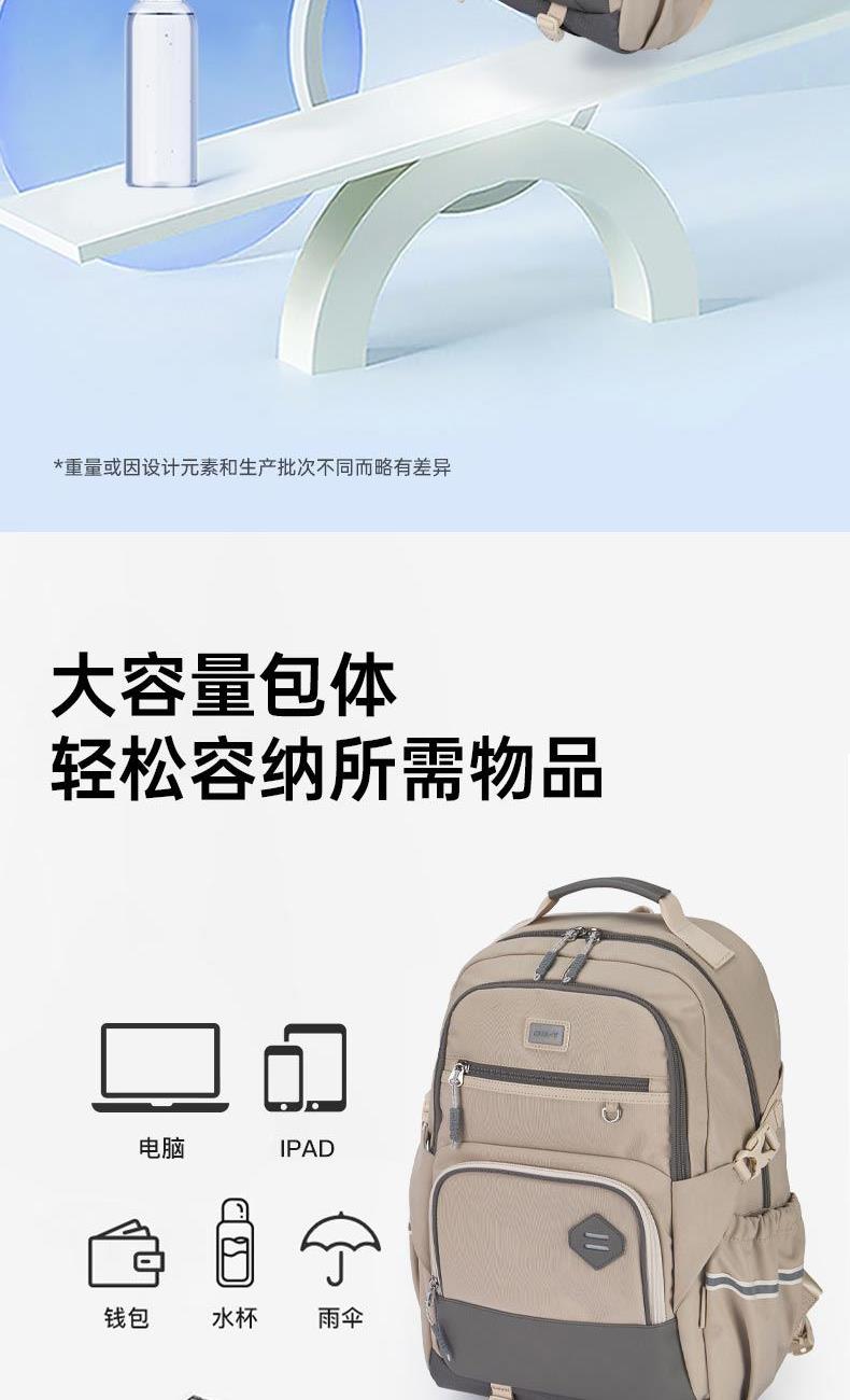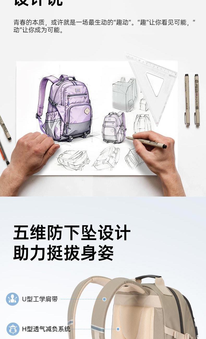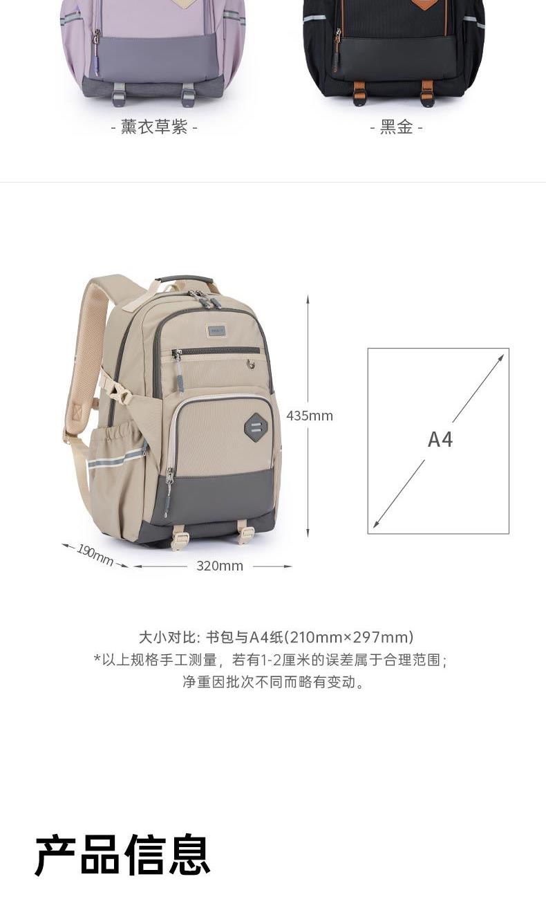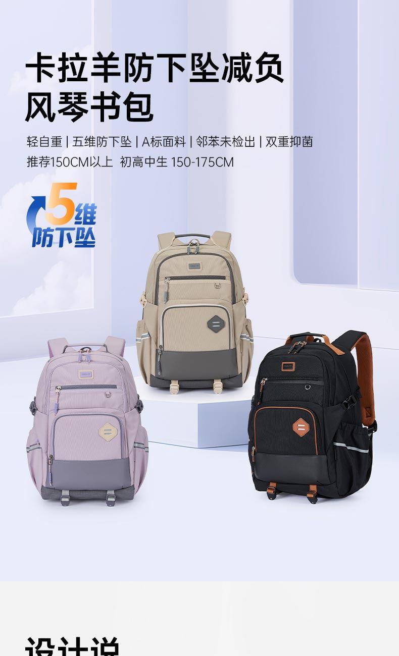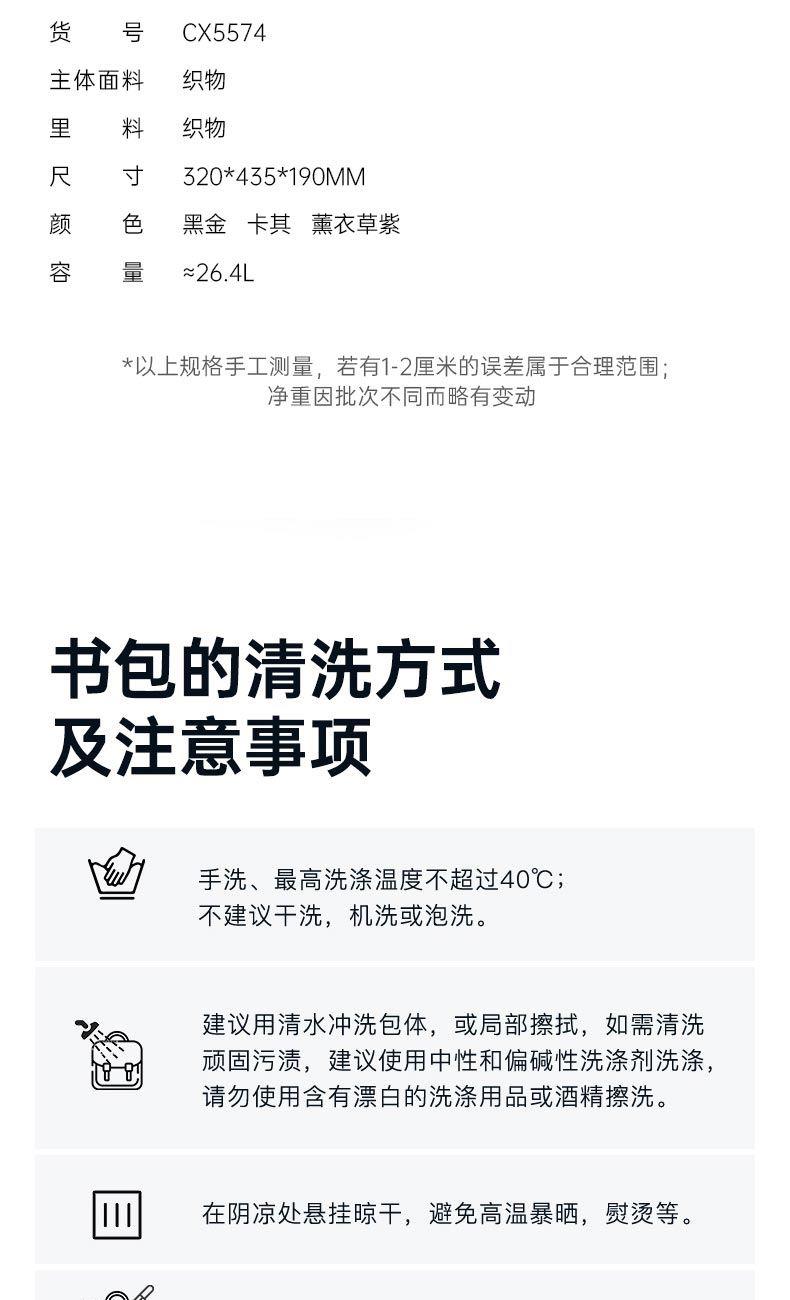 货号:CX5190 主体面料:织物;里料:织物 颜色:钢琴黑、米白、薰衣草紫 定位:150-175CM以上/ 初高中生书包 净重:0.74kg 26.2L
