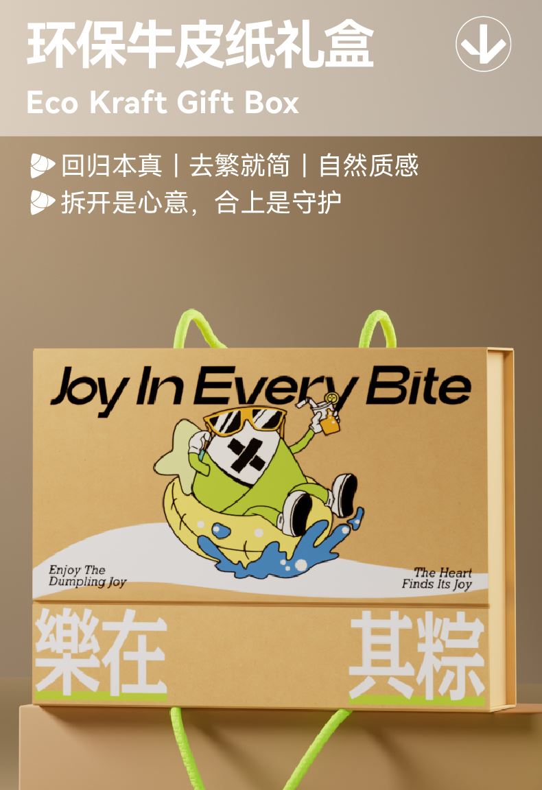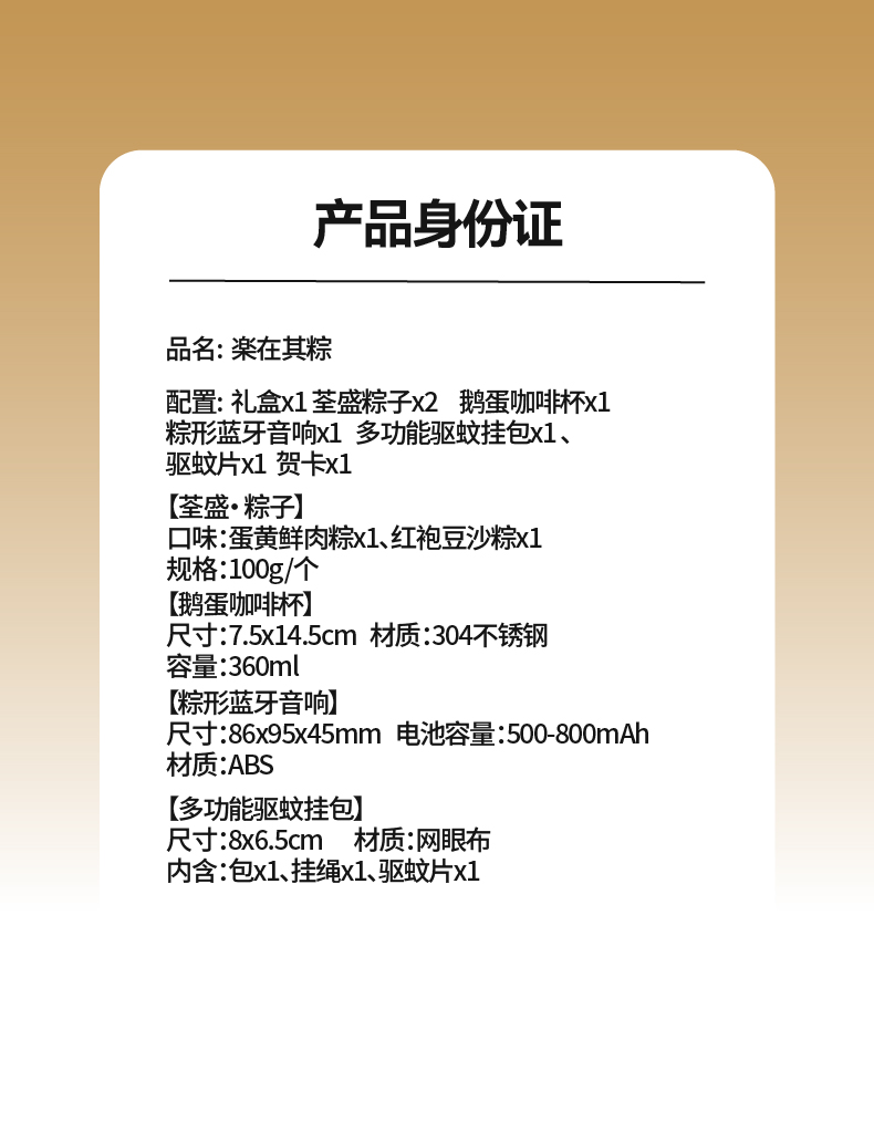 自然之纸,包裹千年粽香;素朴纹理,承载节气温情。 去繁就简,让一个环保牛皮纸盒,回归端午的本真模样 拆开是心意,合上是守护。 在自然的触感里,寻回节日的纯粹 在一抹暖黄之中,乐在其粽,也乐在自然 内配: 配置一:礼盒x1 配置二:荃盛粽子x2 配置三:鹅蛋咖啡杯x1 配置四:粽形蓝牙音响x1 配置五:多功能驱蚊挂包x1 、驱蚊片x1 配置六:贺卡x1