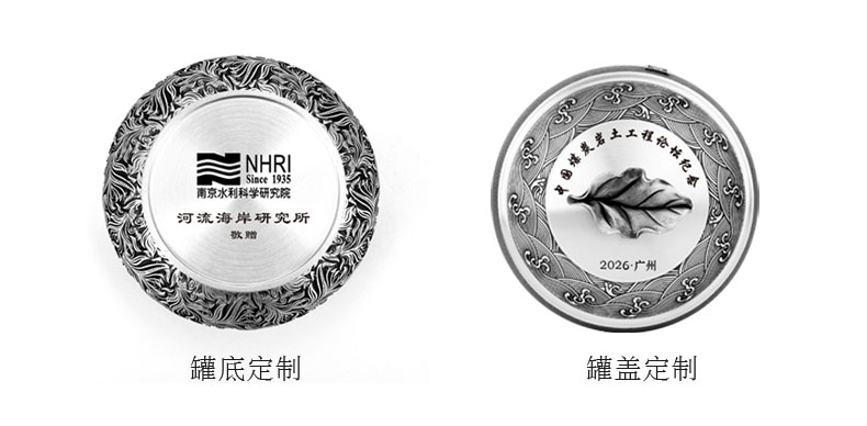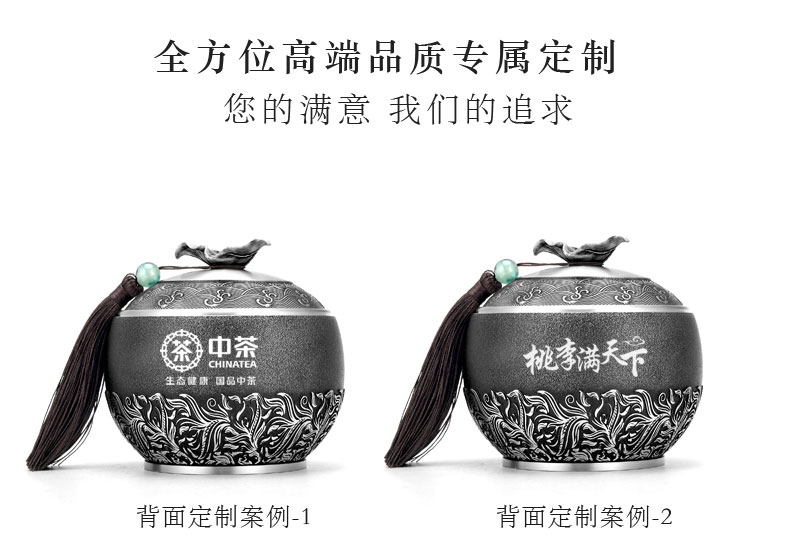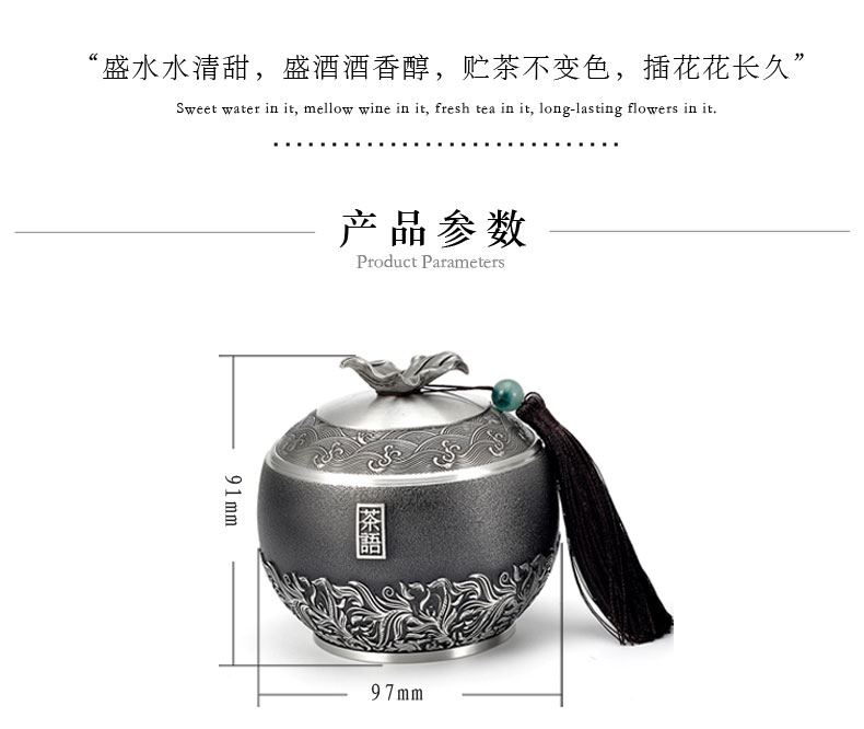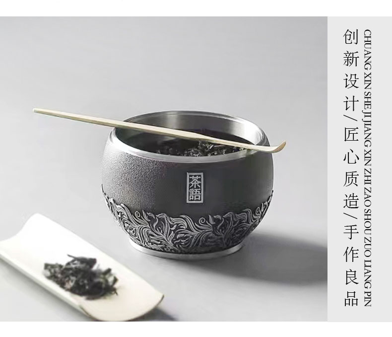产 品:茶语-纯锡茶叶罐 规 格:φ97*91mm-小号 容 量: 小号装约140g (铁观音) 重 量: 423g 左右-小号 ✅纯锡锁香:锡含量≥98.3% 高纯锡材质,防潮密封储茶,持久锁住茶叶鲜醇,越存越香。 ✅国风美学:罐身高浮雕茶叶叶片组合设计图案,罐盖外圈水纹环绕,树叶提手+流苏玉珠,还原东方雅致意境,兼具实用与观赏价值。 ✅ 匠心工艺:磨砂哑光罐身搭配亮银浮雕,触感温润,细节考究,彰显品质感。 ✅专属定制:支持罐身罐盖罐底刻字 / 印章定制,打造不一样的茶器,礼赠自藏皆相宜。 ✅实用耐用:密封结构严密,不易氧化变形,可长久陪伴茶事,成为岁月里的存茶伙伴。