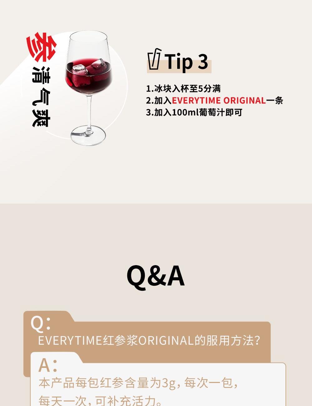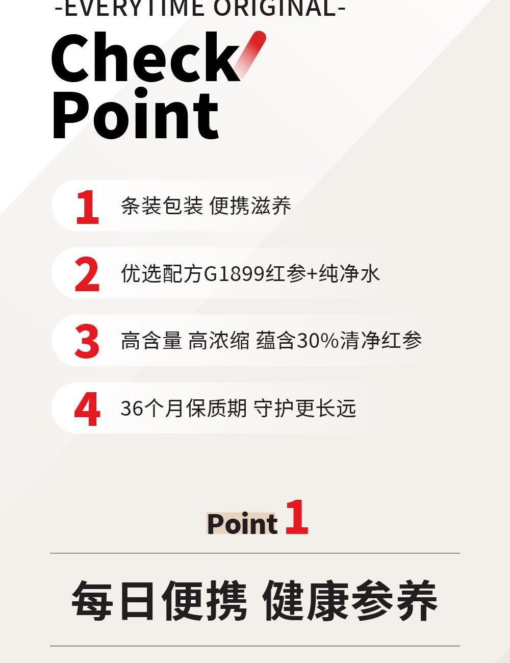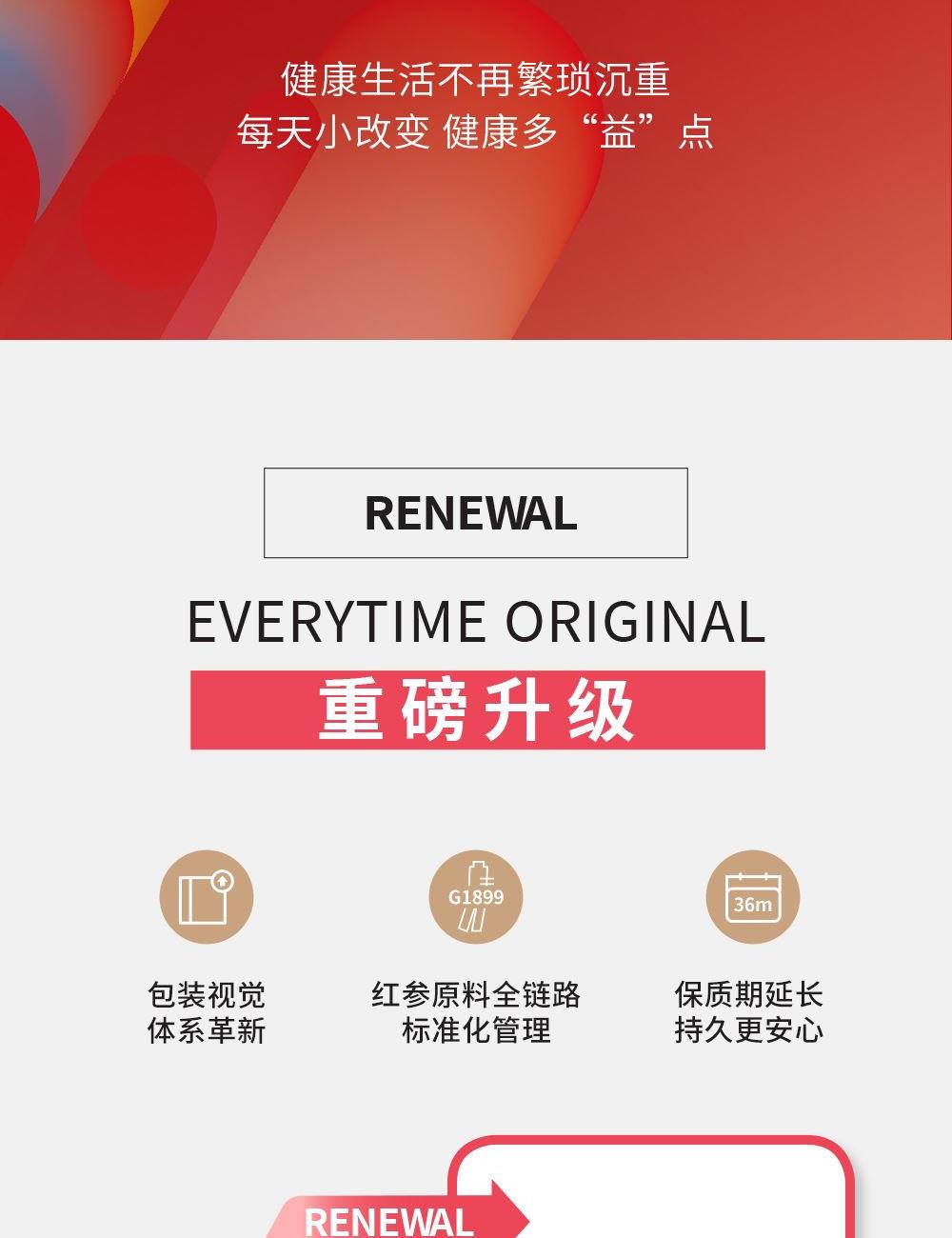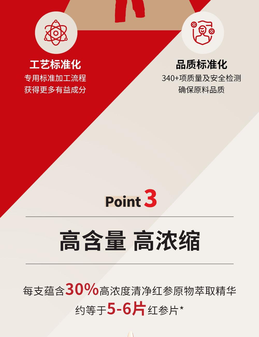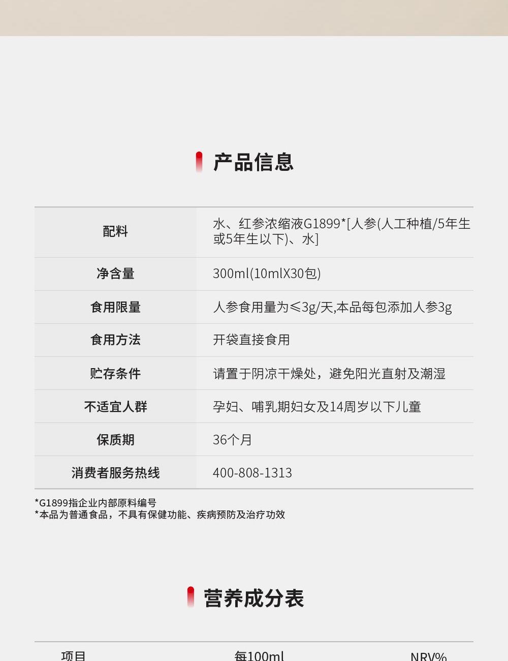 -纯净水中的红参原液,每包含量3.0g -无添加,配料表中只有红参和水 -液体剂型-方便随身携带,服用方便,帮助繁忙的生活中便捷管理健康。