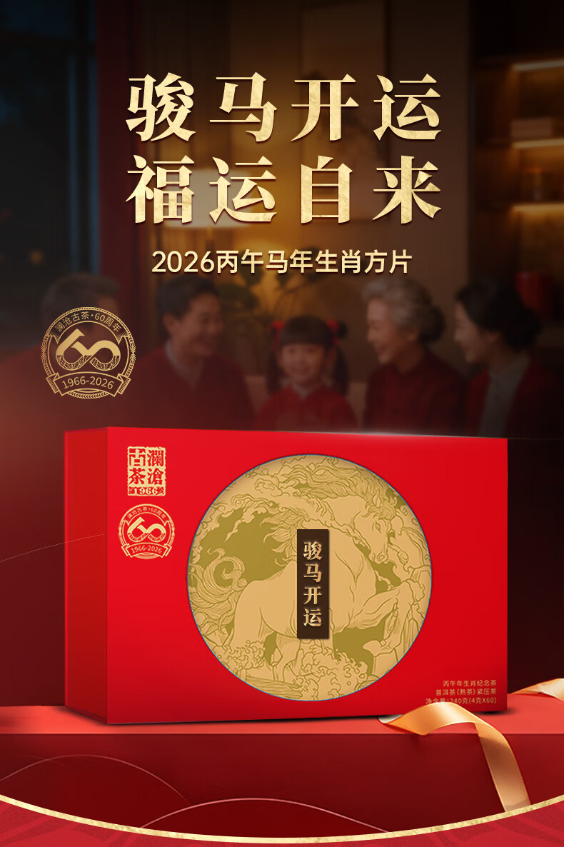 规格:357克 / 片 礼盒采用经典的红金配色,搭配精致的骏马剪纸纹样,视觉上年味十足,契合马年 “马到成功” 的吉祥寓意