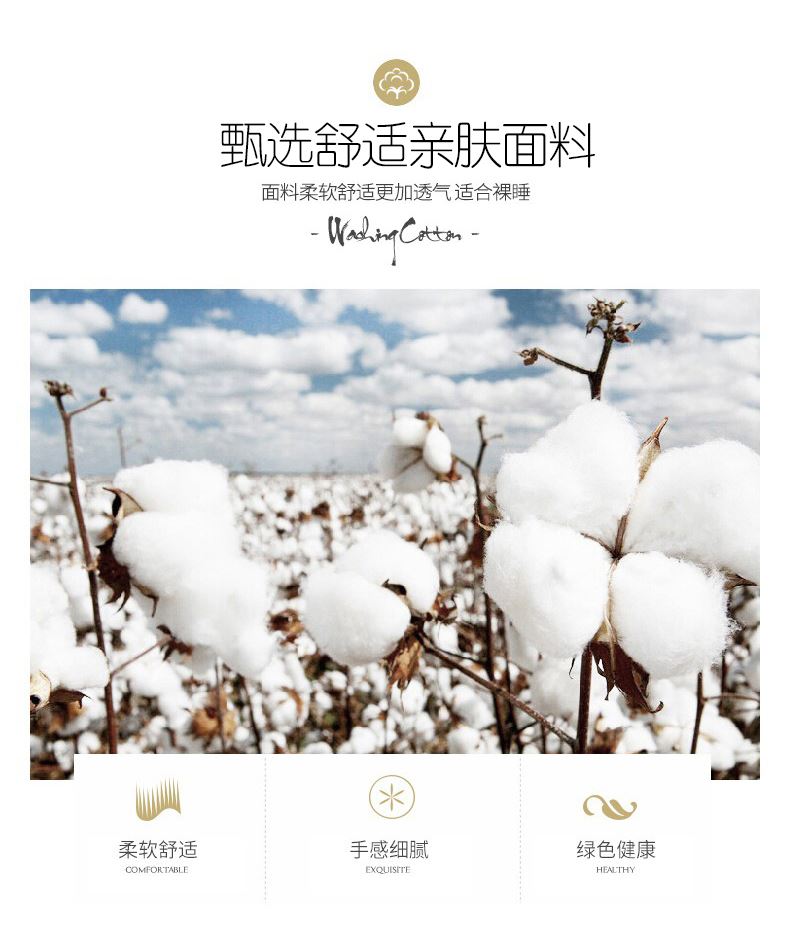 规格:150*200cm 面料:亲肤棉(聚酯纤维) 填充:羽丝棉 重量:700g 执行标准:GB/T22796-2021 安全类别:GB18401-2010 B类 1.甄选优质亲肤绒面料,亲肤磨毛织物是一种功能性织造方式,在保留面料原有性能的同时,通过再加工,使织物表面形成一层层细腻的短绒毛层的感觉,增加了贴身接触的柔软性和亲肤性。 2.采用羽丝棉填充,柔软蓬松,亲肤性佳,回弹性优,贴身覆盖且轻盈。