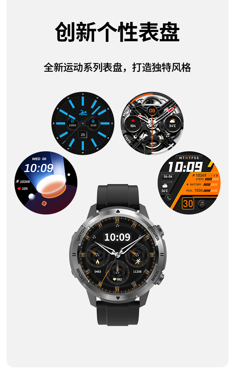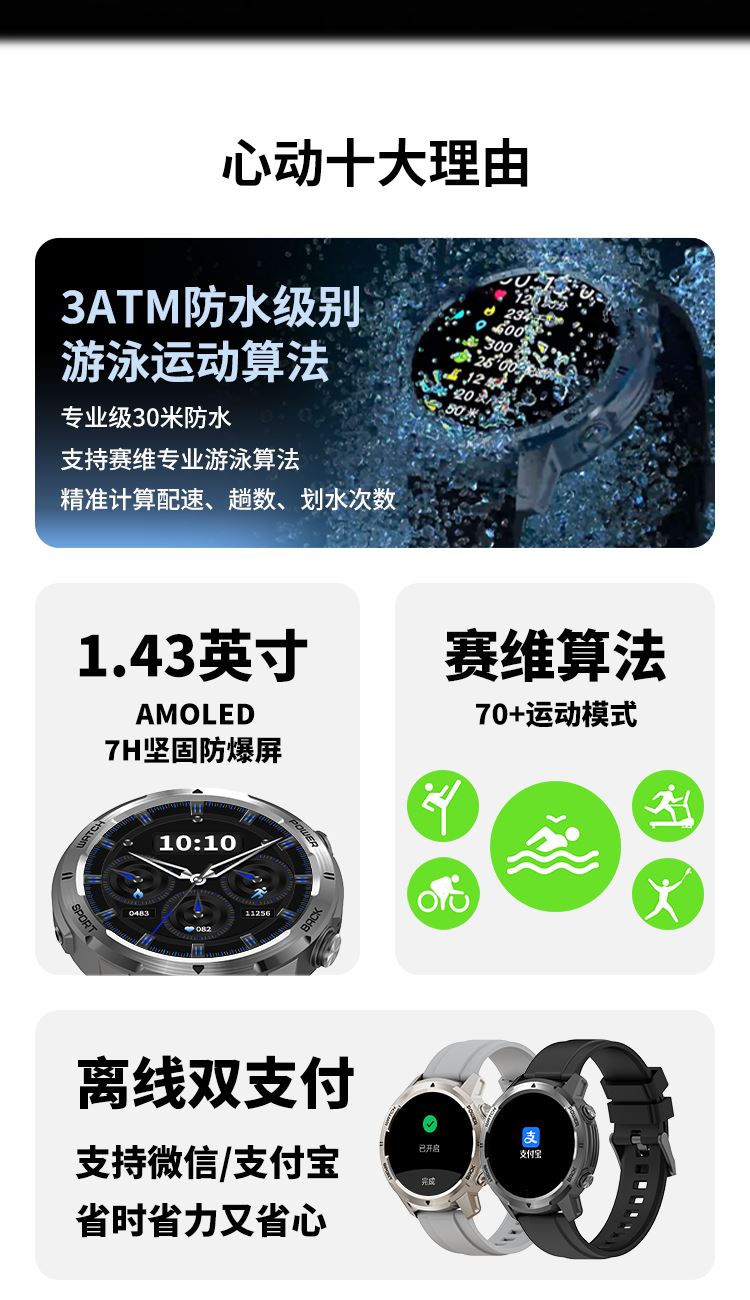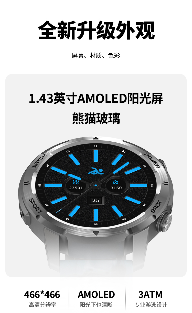 1.43英寸 AMOLED 熊猫玻璃 锌合金真空镀 尼龙+玻纤 不锈钢真空电镀 有机玻璃 热转印硅胶表带 304不锈钢 49*12.8mm IP68