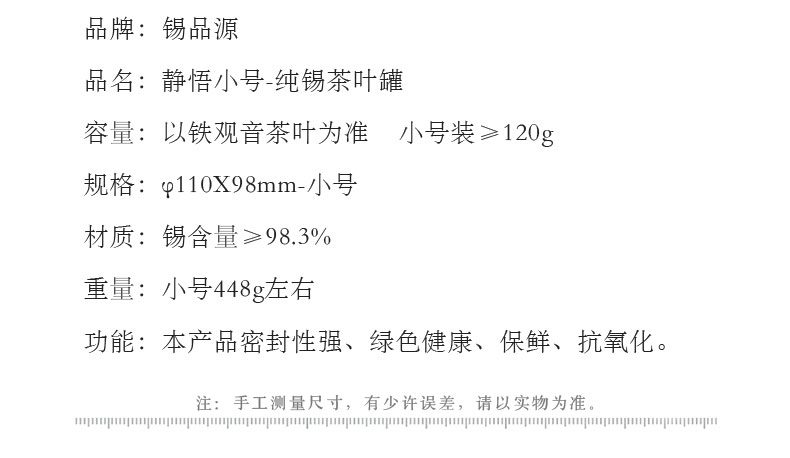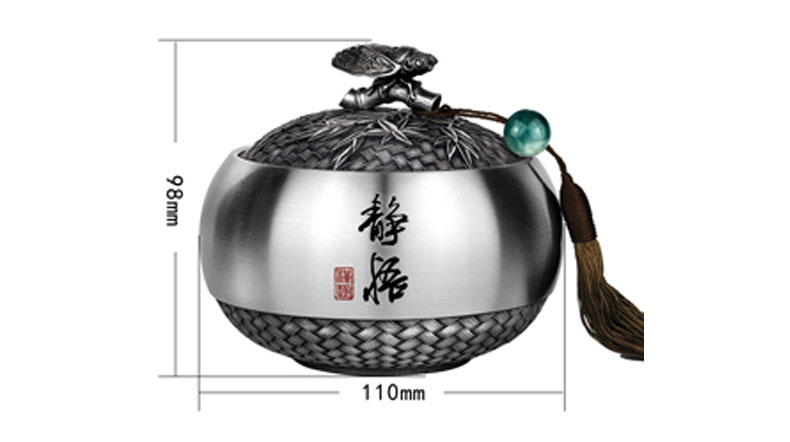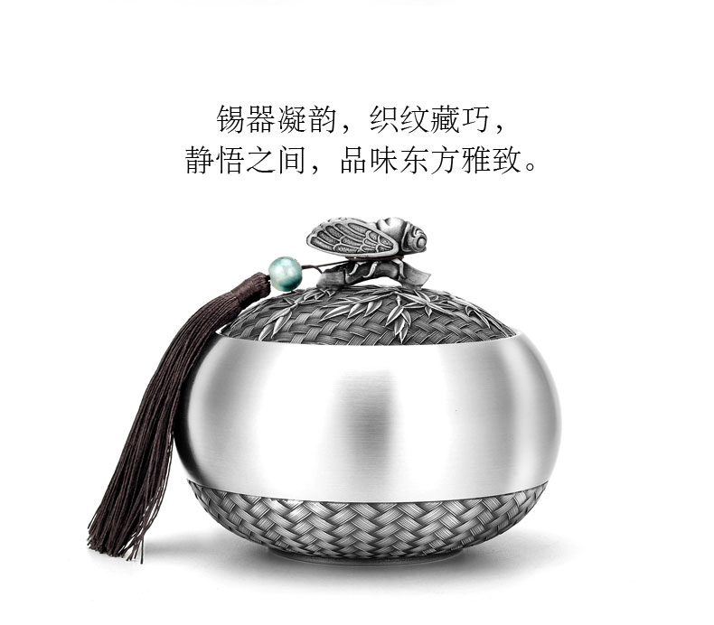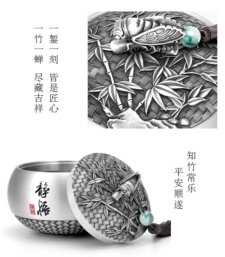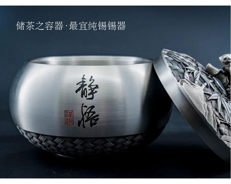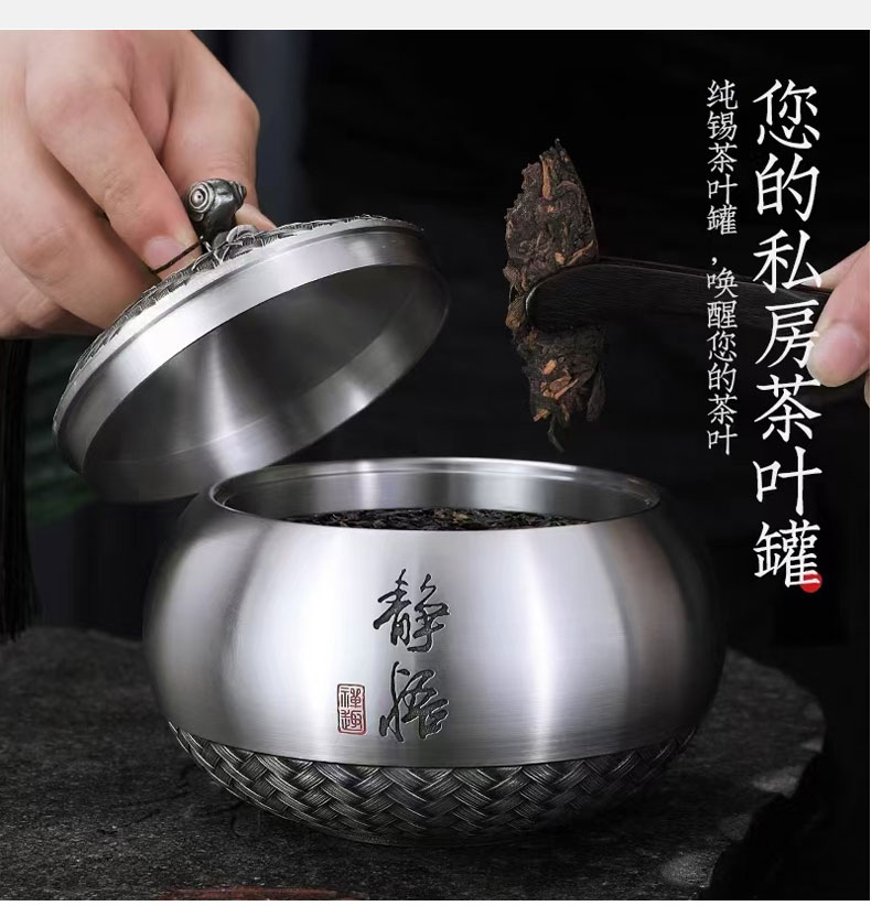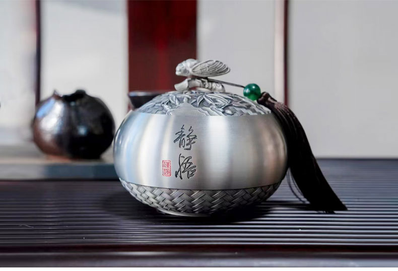 产 品:静悟小号-纯锡茶叶罐 规 格: φ 110*98-小号 容 量:小号装-120g左右 铁观音为准 重 量:约448g-小号 🌸高纯锡材,锁香储鲜:锡含量≥98.3%,防潮密封性能优异,持久锁住茶叶鲜醇,让好茶越存越香。 ✨ 国风浮雕,雅致意境:罐盖精雕竹影蝉鸣,罐身题字 “静悟” 配朱红印章,编织纹理与拉丝锡面交织,还原东方文人雅趣。 🎯匠心工艺,质感温润:手工錾刻浮雕搭配细腻拉丝工艺,触感厚重温润,细节考究,尽显品质与格调。 专属定制,礼赠皆宜:支持罐身刻字 / 印章定制,打造专属茶器,自藏彰显品味,送礼更显心意。 📦耐用耐存,长久相伴:密封结构严密,锡器不易氧化变形,可陪伴多年茶事,成为存茶赏玩的经典伙伴。