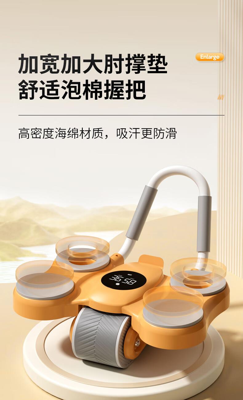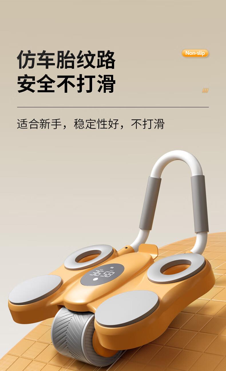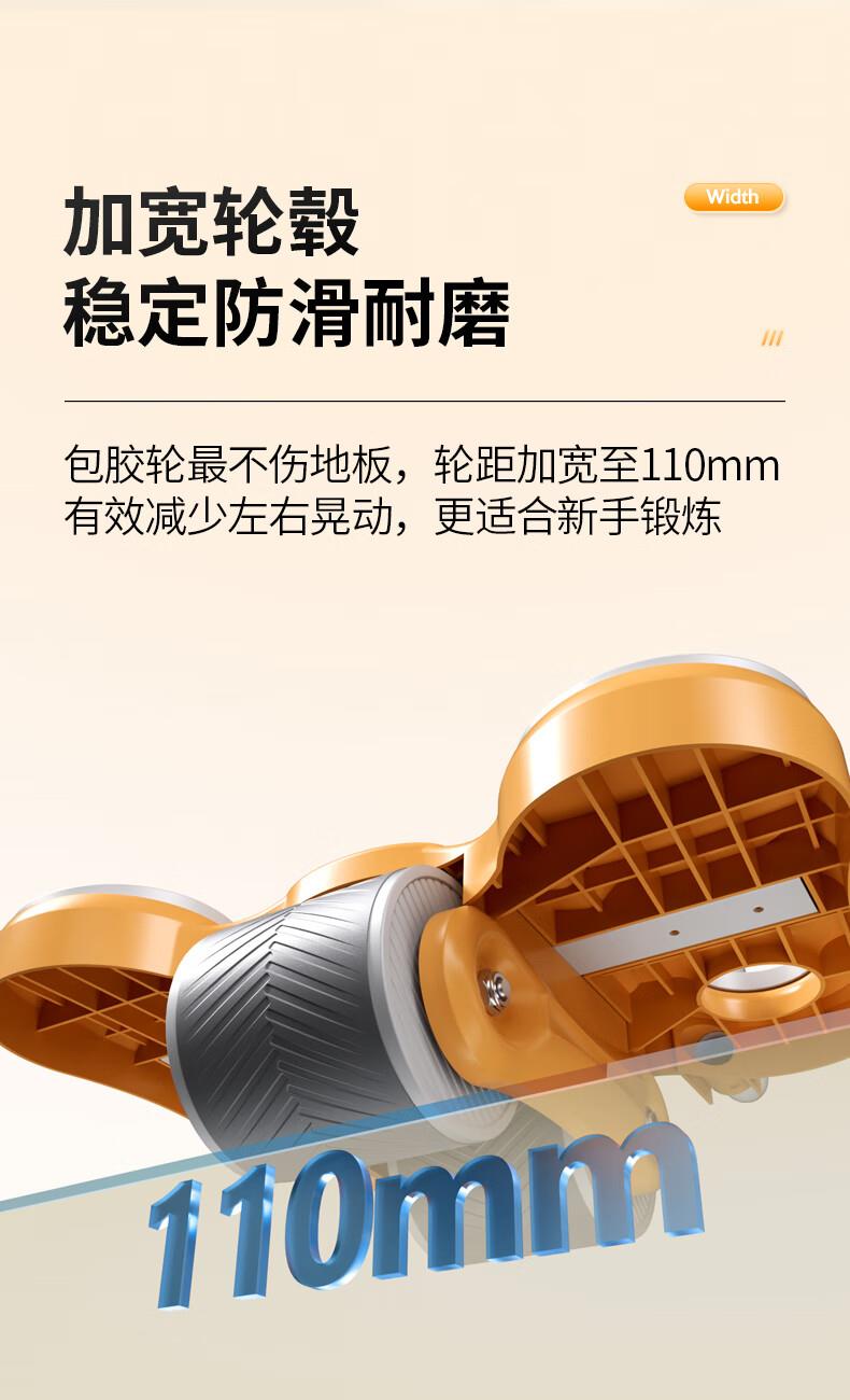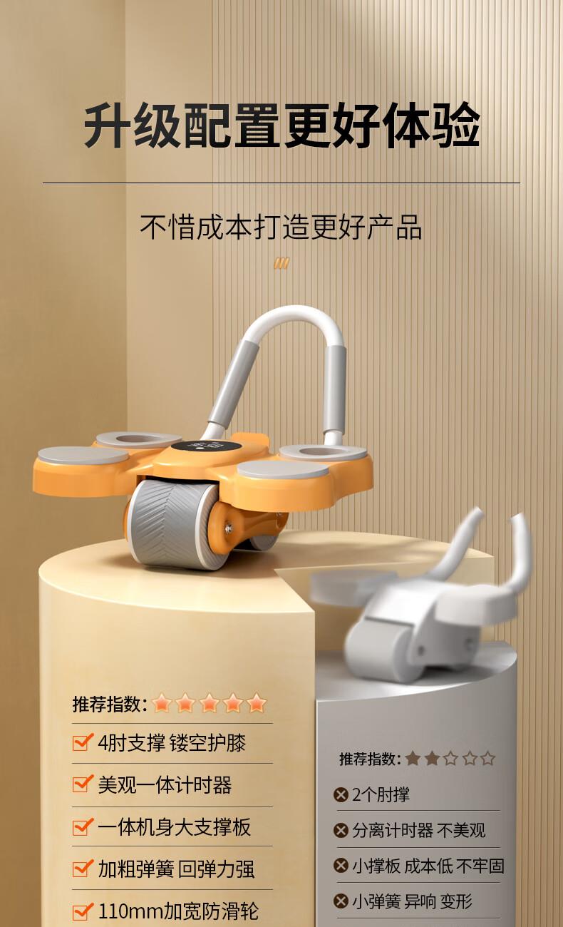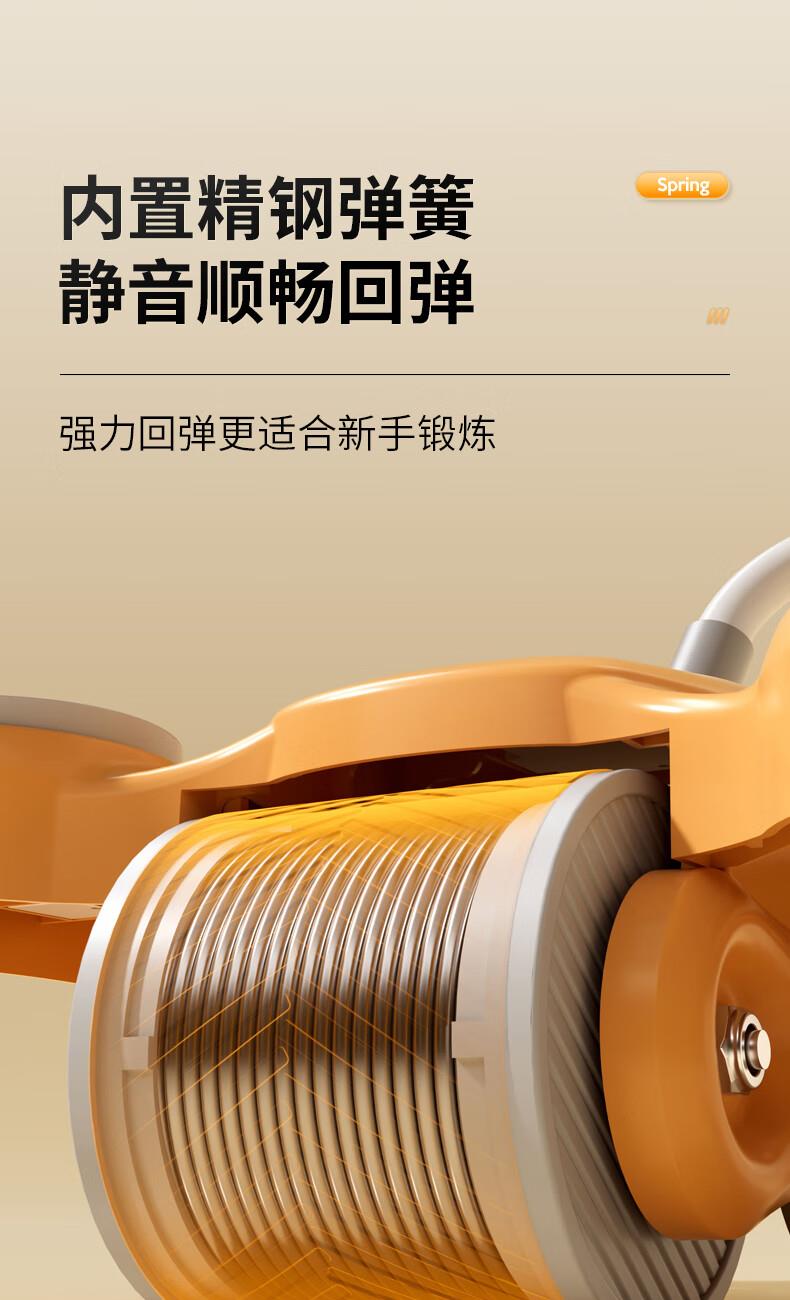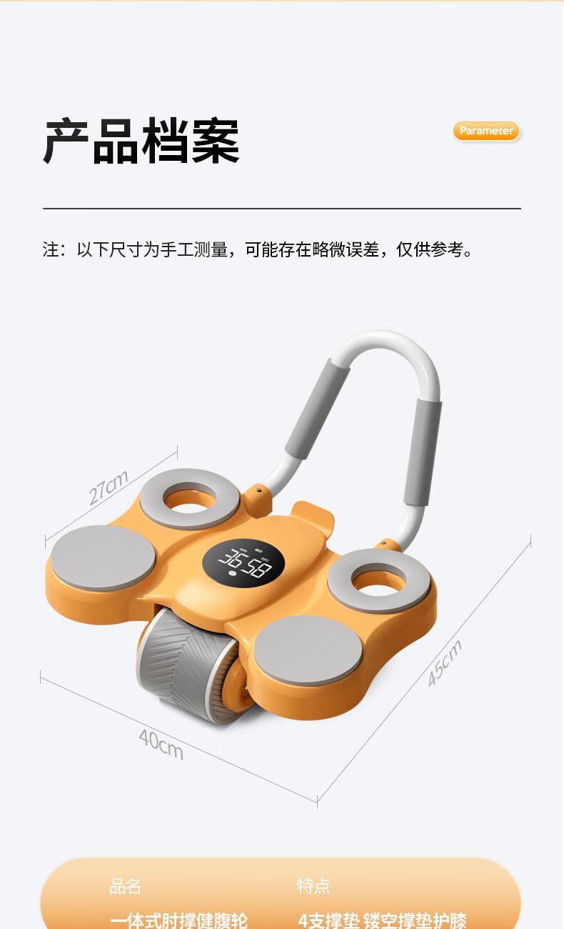 功能特点:安全刹车、智能回弹、计数 颜色:橙色 用途:健身、健腹、扩胸,瘦肚子腰腹 适用人群:男女通用 ①这款是加宽加大的,加宽了轮体宽度,轮体宽,推动的时候稳定,不晃动。②加大加宽了手肘肩距,小尺寸的手肘肩距,使用起来肩膀太窄,夹着肩膀去运动,非常难受,我们加大肩膀手肘宽度距离后推动起来感觉身体肩膀舒服,再也不需要夹着肩膀去运动了。③加厚了塑料件和主体结构,贵有贵的理由,加厚材料后,承载负重强度加大,强度高。