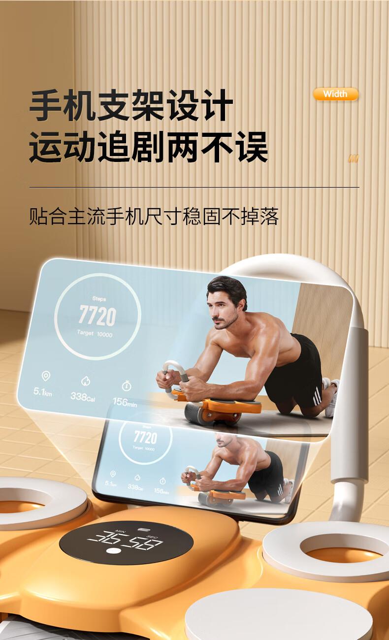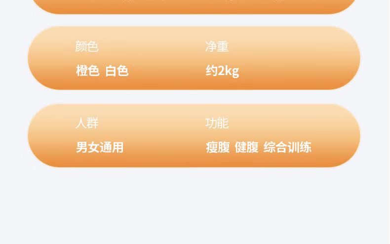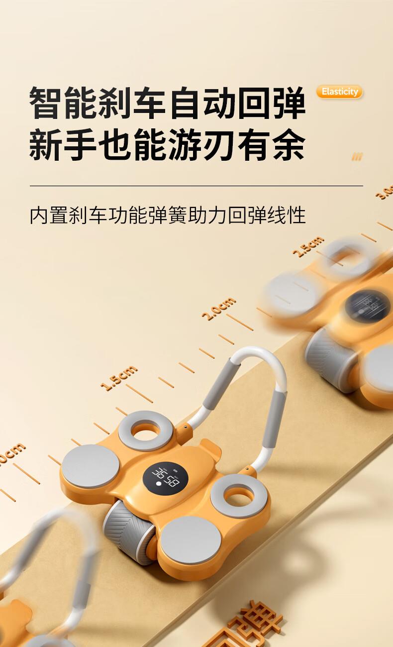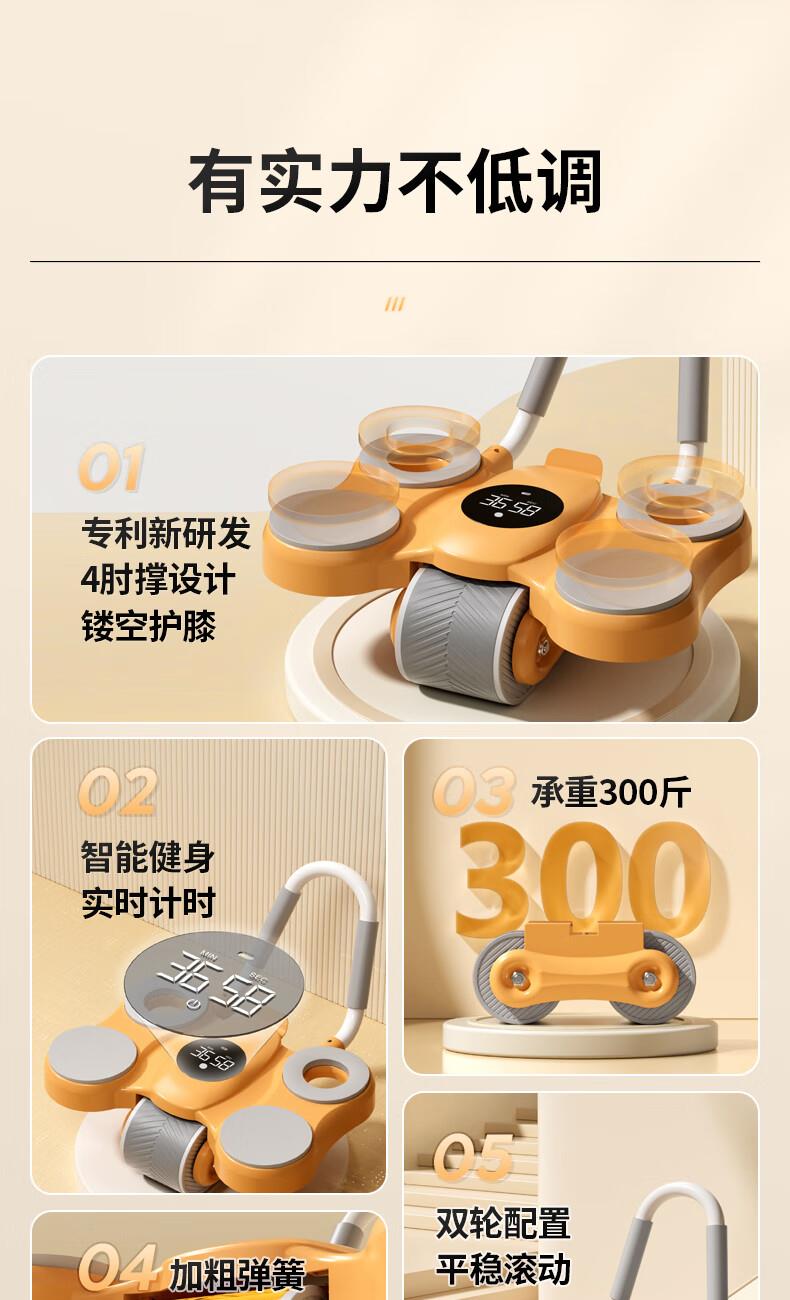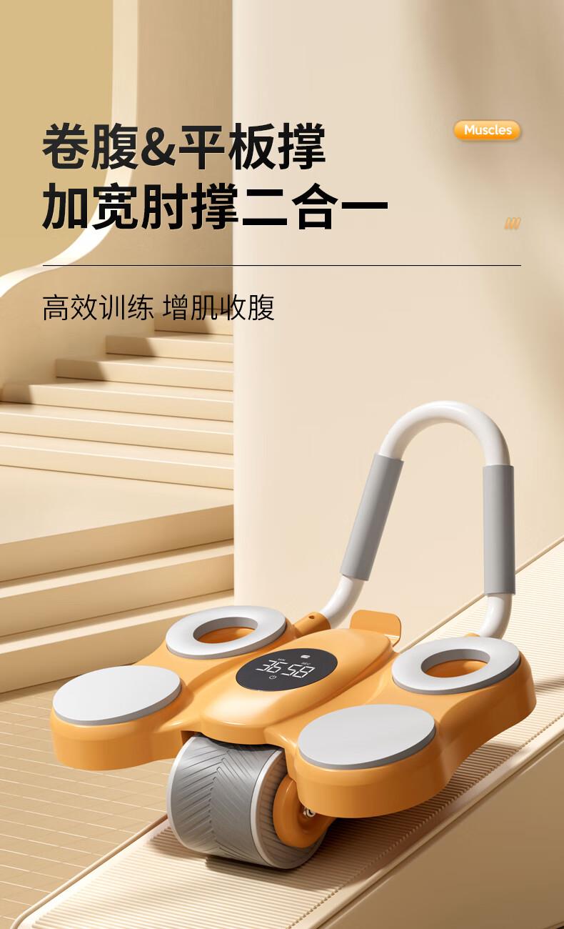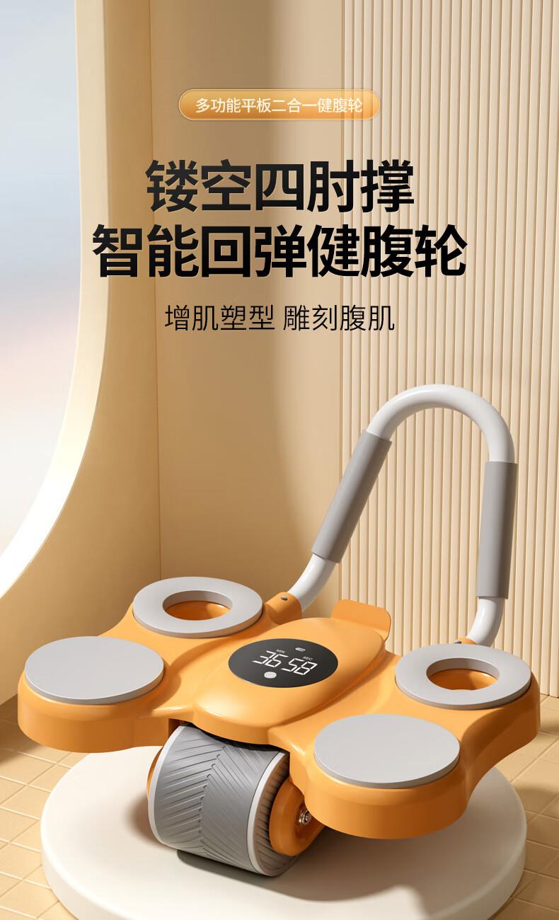功能特点:安全刹车、智能回弹、计数 颜色:橙色 用途:健身、健腹、扩胸,瘦肚子腰腹 适用人群:男女通用 ①这款是加宽加大的,加宽了轮体宽度,轮体宽,推动的时候稳定,不晃动。②加大加宽了手肘肩距,小尺寸的手肘肩距,使用起来肩膀太窄,夹着肩膀去运动,非常难受,我们加大肩膀手肘宽度距离后推动起来感觉身体肩膀舒服,再也不需要夹着肩膀去运动了。③加厚了塑料件和主体结构,贵有贵的理由,加厚材料后,承载负重强度加大,强度高。