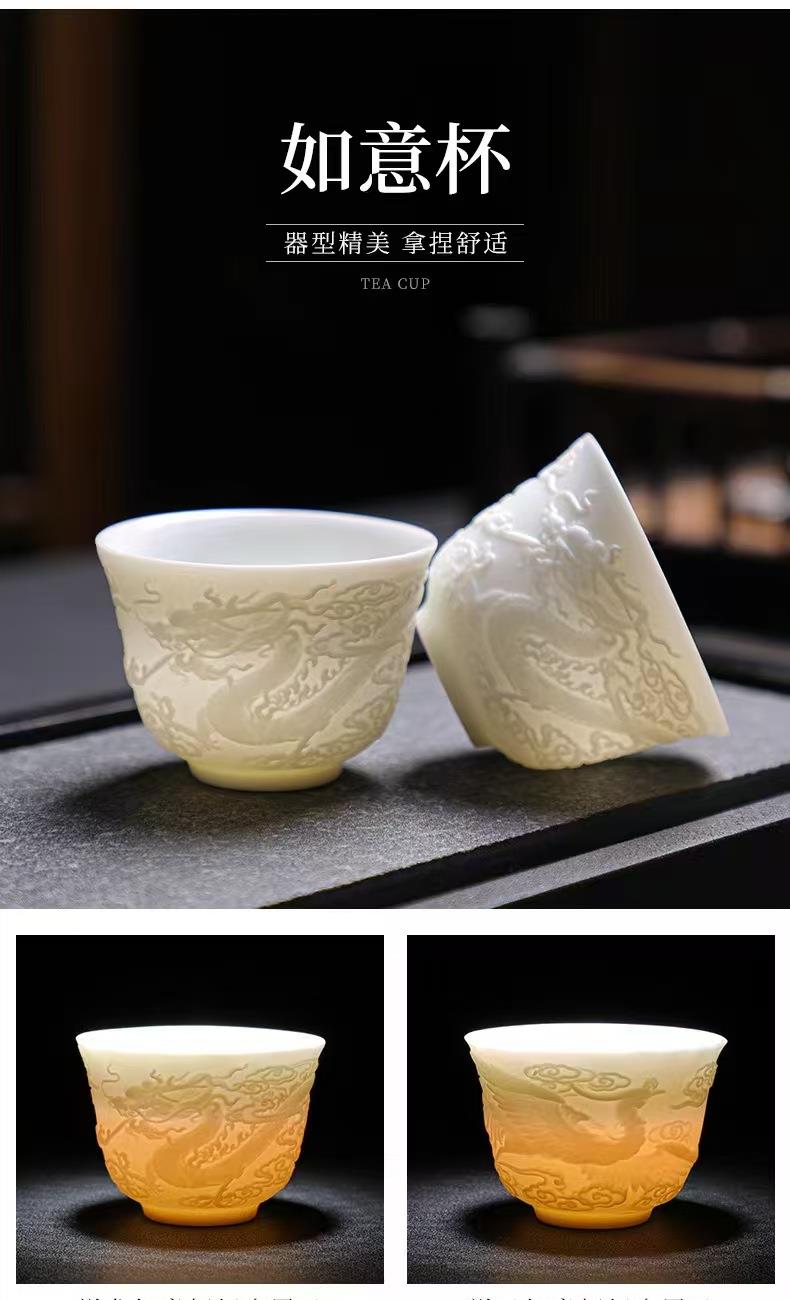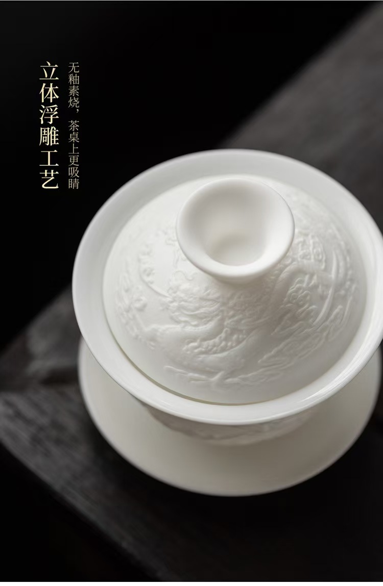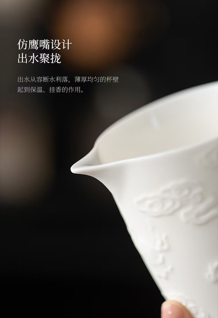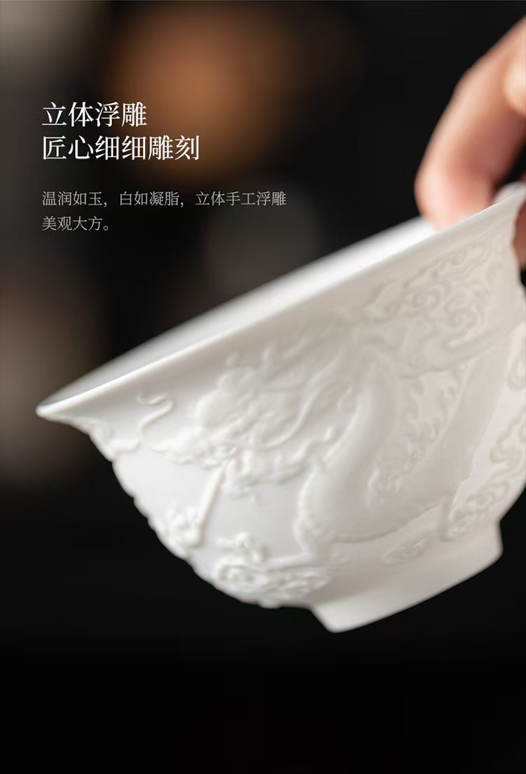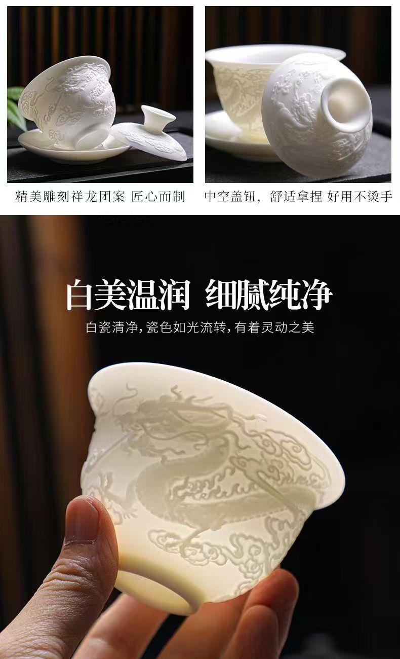 配制:1壶 6杯 1收藏证书 1公道杯1茶托1茶漏 1礼盒 规格: 盖碗:10.5*9.5cm 茶杯:6.5*5cm 公道杯:9.5*8.5cm 茶托茶漏:8*5cm 推荐说明:手工浮雕龙纹茶具,栩栩如生。羊脂玉瓷,瓷质细腻温润,触感舒适。似凝脂,如美玉。在阳光照射下,呈半透明羊油状,洁白滋润,故称羊脂玉,。锦盒装,时尚精致上档次。