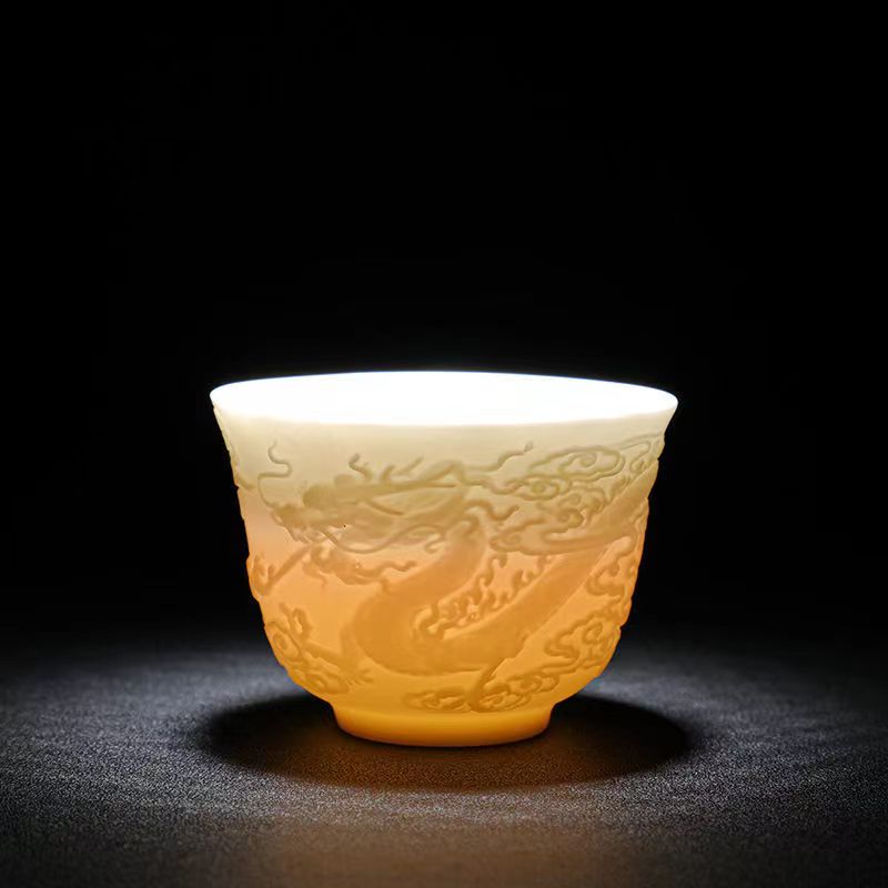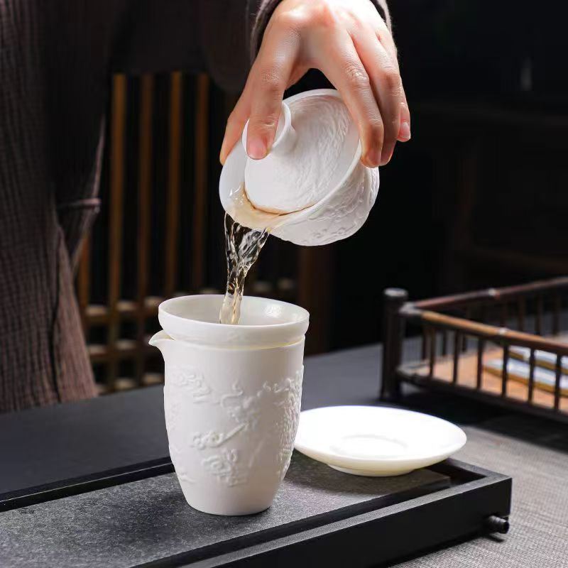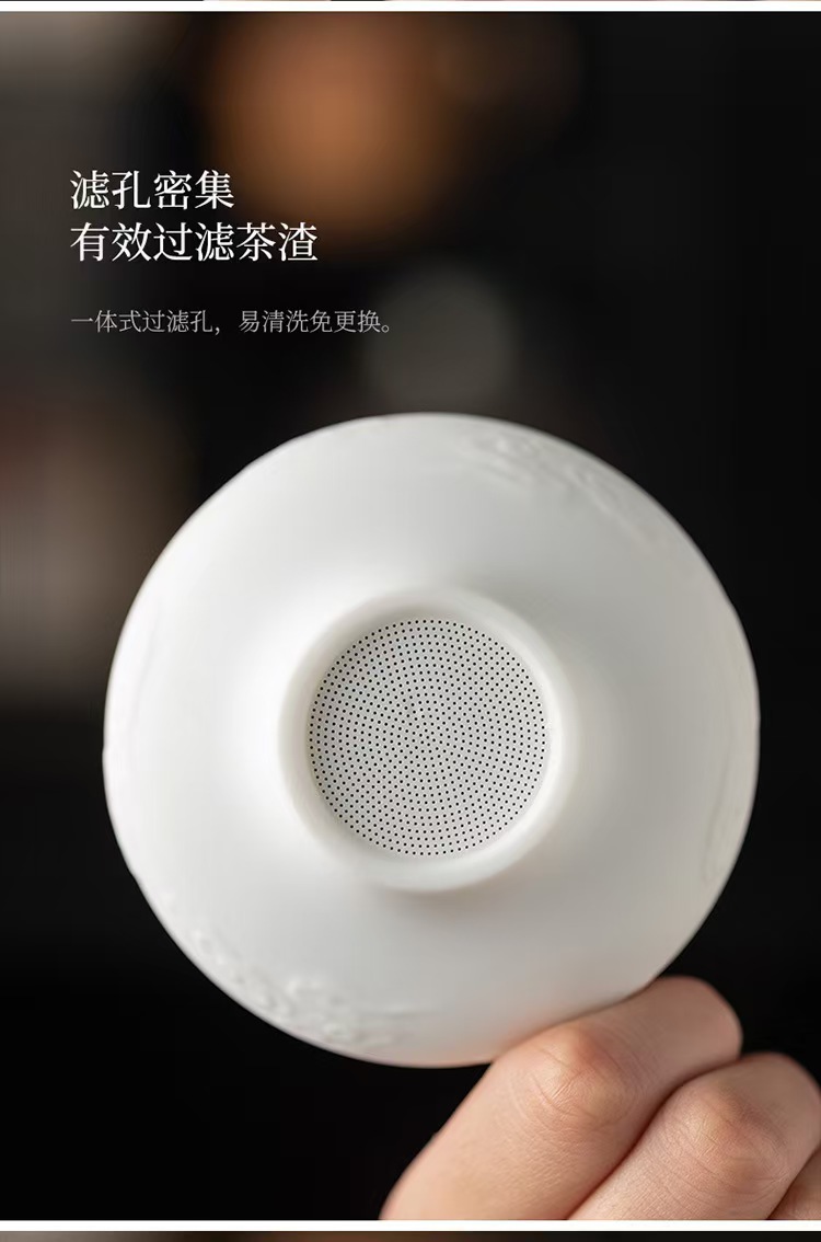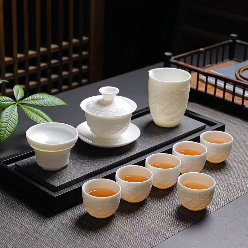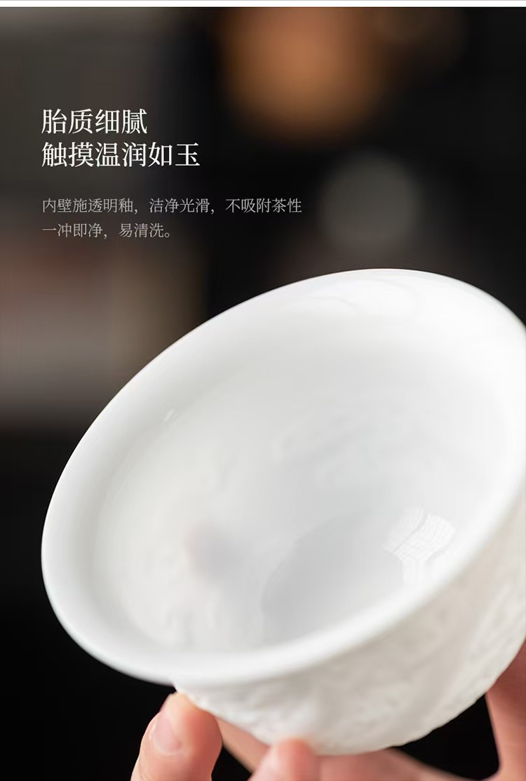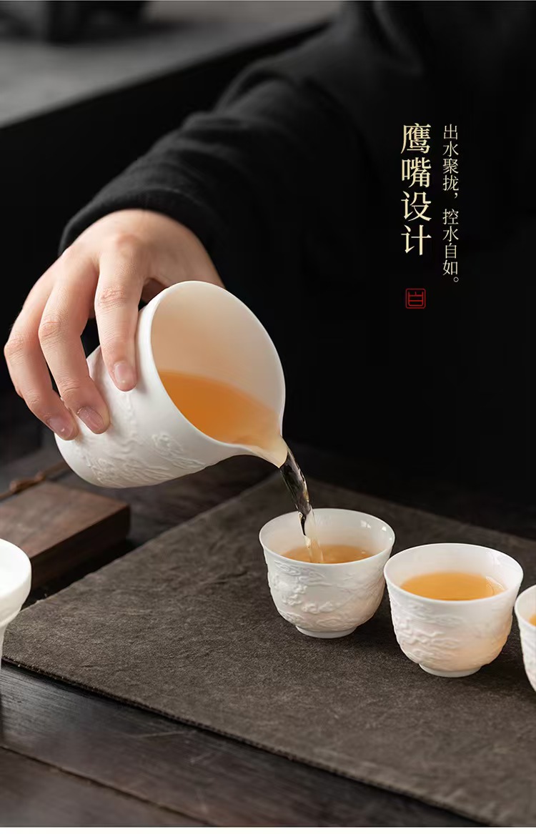 配制:1壶 6杯 1收藏证书 1公道杯1茶托1茶漏 1礼盒 规格: 盖碗:10.5*9.5cm 茶杯:6.5*5cm 公道杯:9.5*8.5cm 茶托茶漏:8*5cm 推荐说明:手工浮雕龙纹茶具,栩栩如生。羊脂玉瓷,瓷质细腻温润,触感舒适。似凝脂,如美玉。在阳光照射下,呈半透明羊油状,洁白滋润,故称羊脂玉,。锦盒装,时尚精致上档次。
