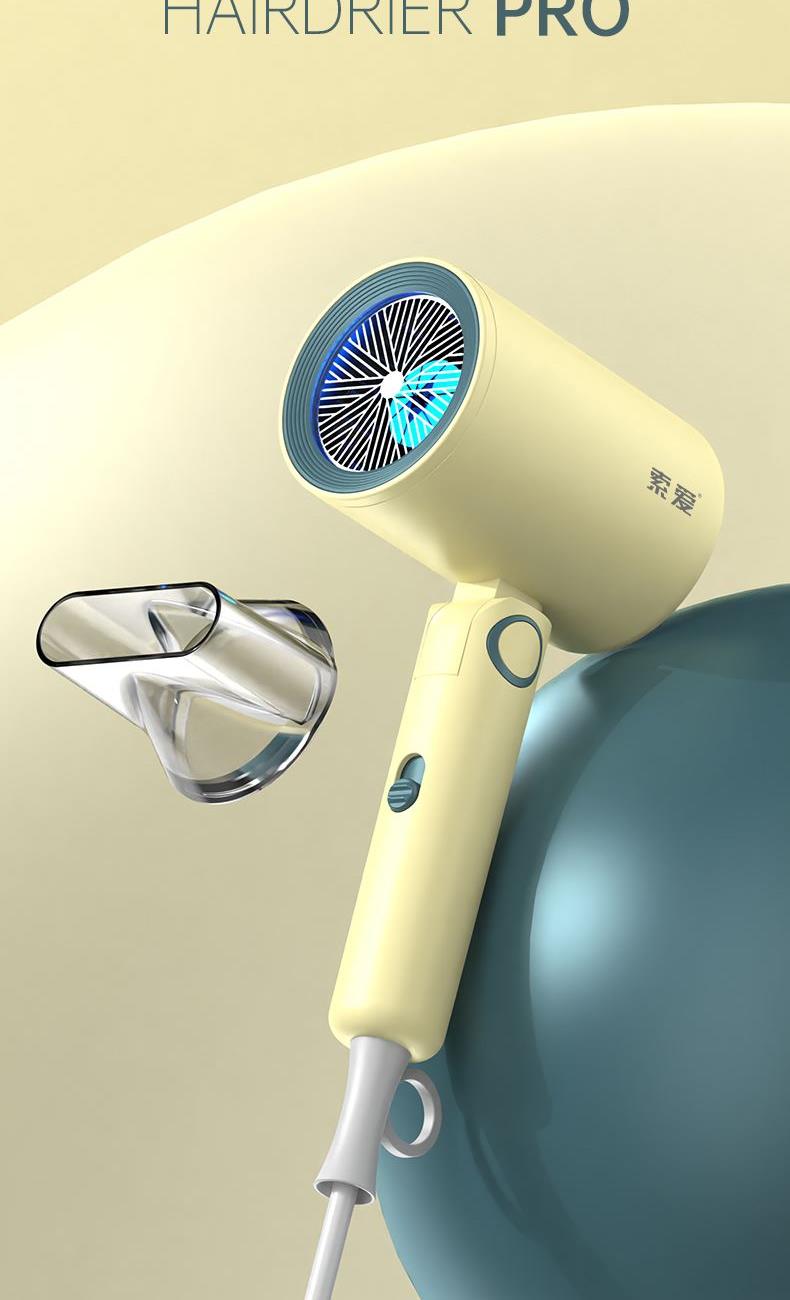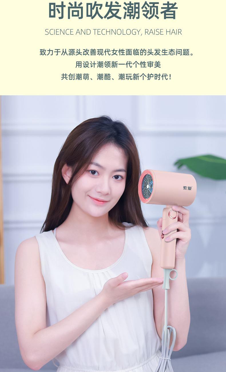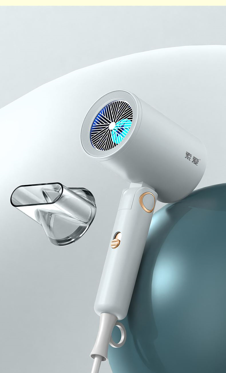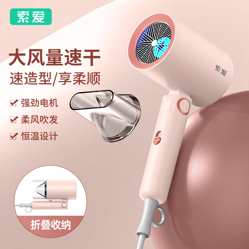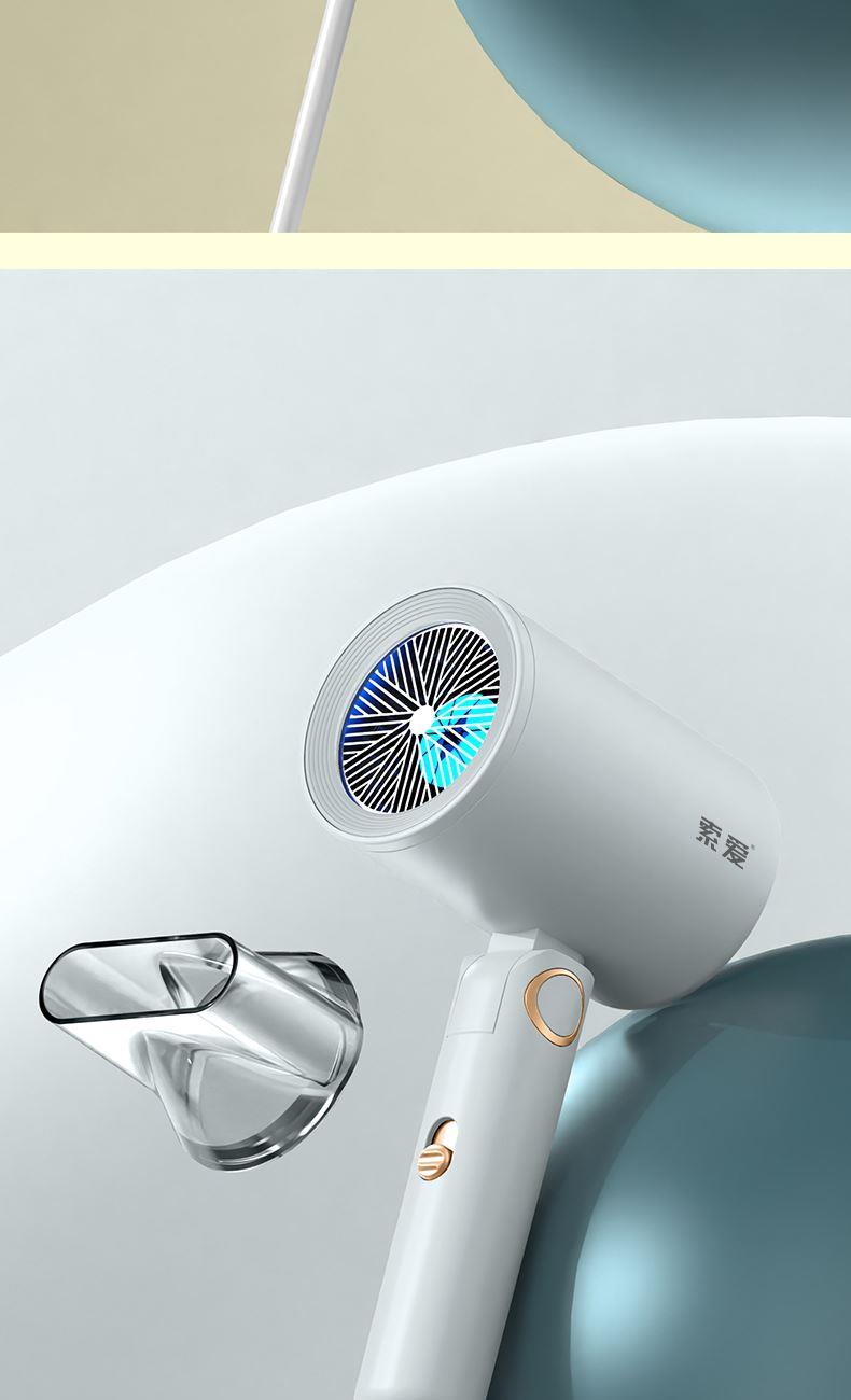【可折叠)索爱负离子智能变频速干冷热风大功率电吹风】 附加功能:功率1600W 智能变频控温,智能过热自动断电保护 2000W负离子,速干/冷热/滋养护发更柔顺 数字调温LED数字显示,金属手感漆工艺 智能无叶搭载高速2万转升级马达,送双层防烫磁吸吹风嘴,不可折叠手柄 电线外露2米,线加粗加长,三脚扁插