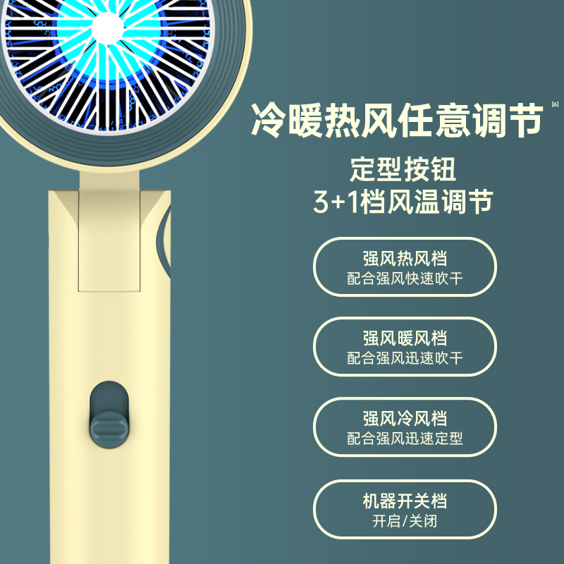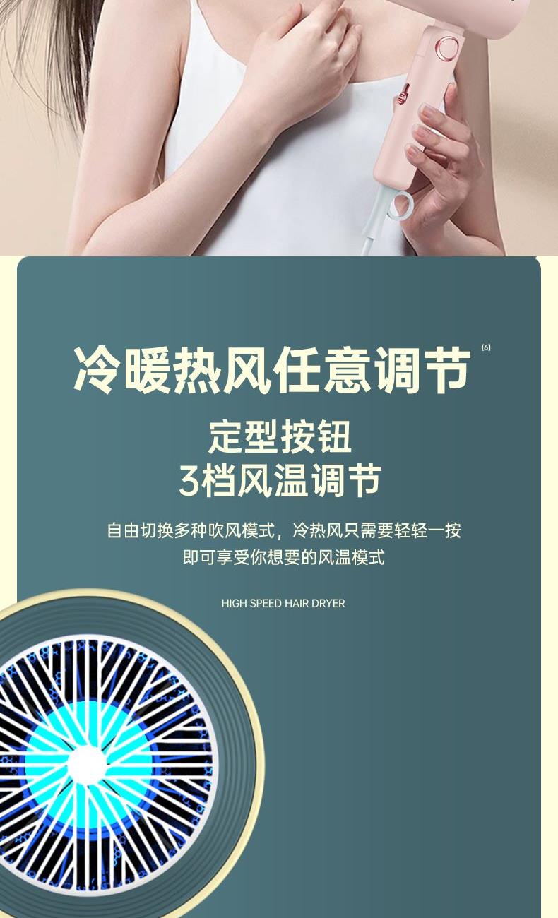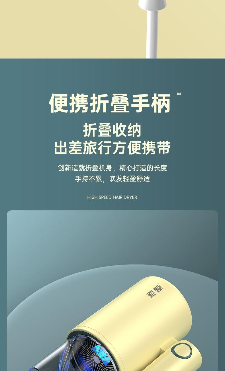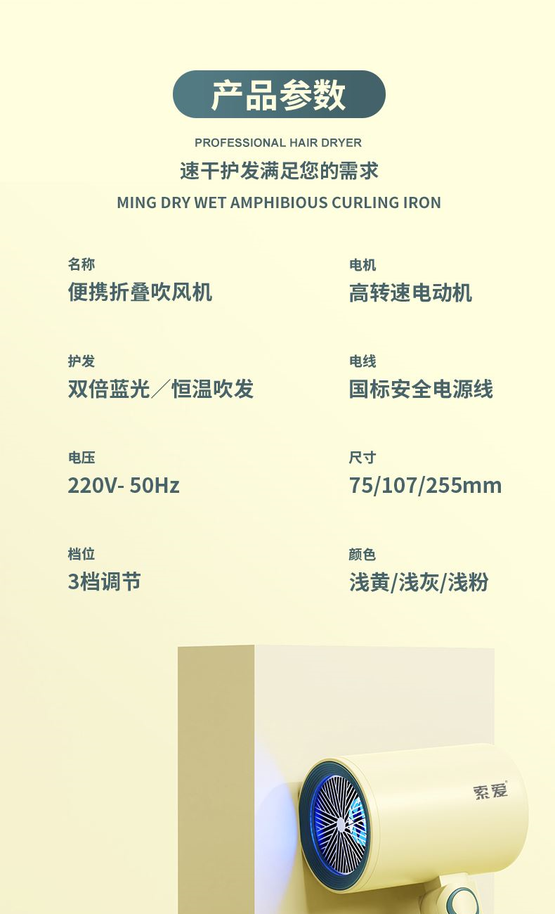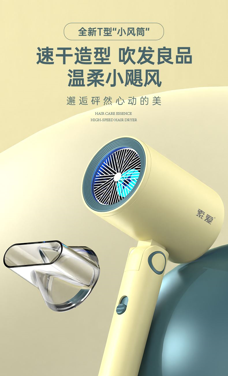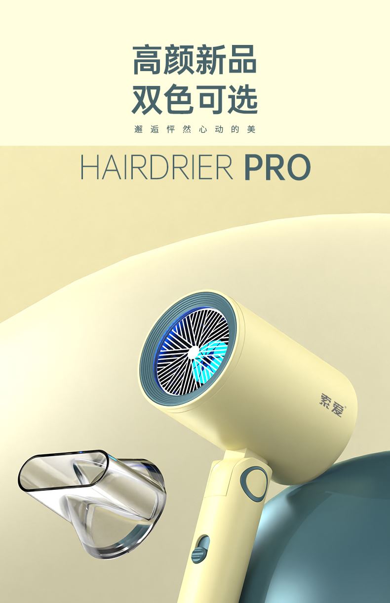 【可折叠)索爱负离子智能变频速干冷热风大功率电吹风】 附加功能:功率1600W 智能变频控温,智能过热自动断电保护 2000W负离子,速干/冷热/滋养护发更柔顺 数字调温LED数字显示,金属手感漆工艺 智能无叶搭载高速2万转升级马达,送双层防烫磁吸吹风嘴,不可折叠手柄 电线外露2米,线加粗加长,三脚扁插