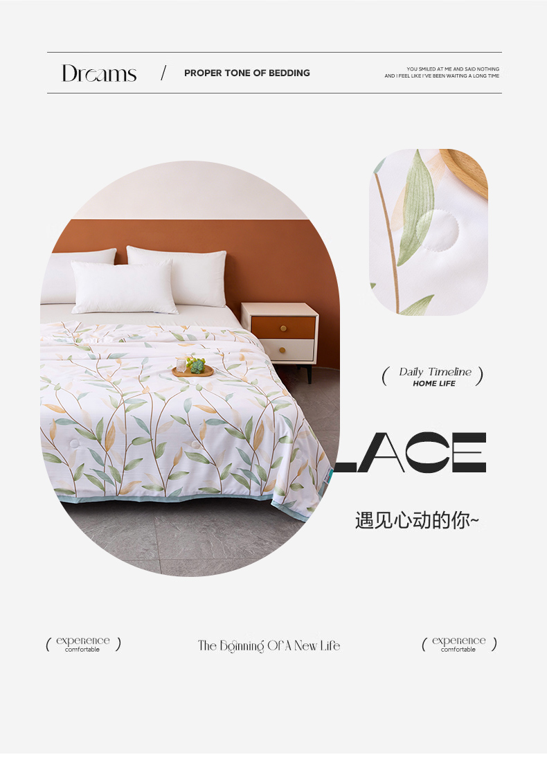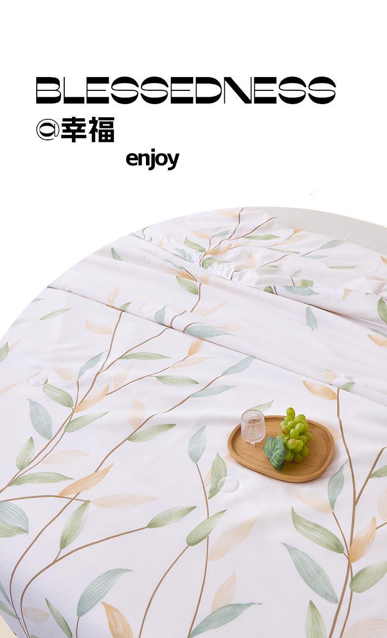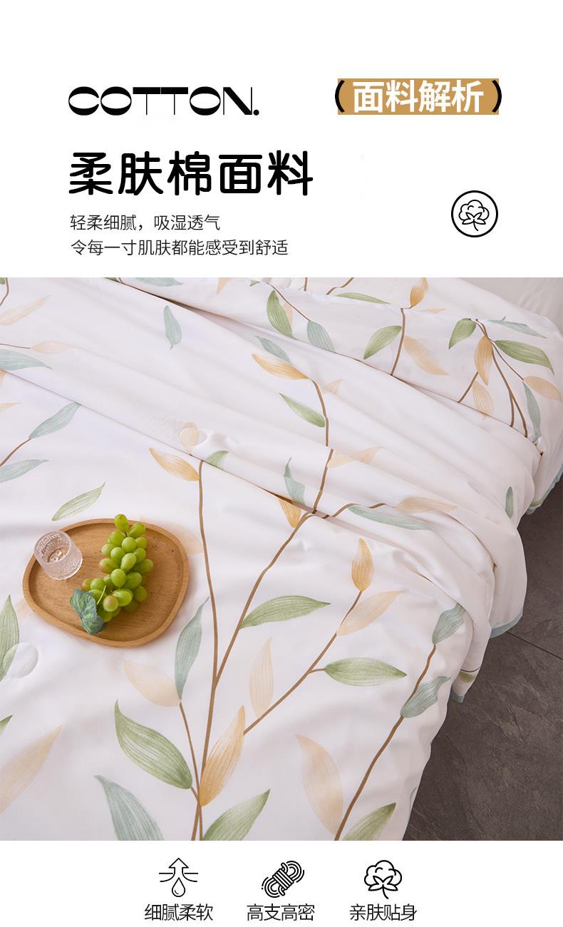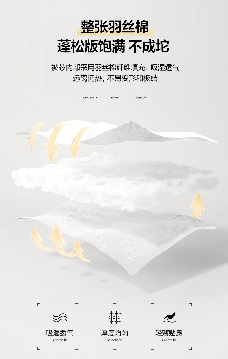 规格:200*230cm 面料:柔肤棉(聚酯纤维) 填充:羽丝棉 重量:1300g 执行标准:GB/T22796-2021 安全类别:GB18401-2010 B类 1.柔软柔肤棉面料,亲肤透气,千爽透气贴着身体,仿佛会呼吸,越睡越上瘾。 2.软软糯糯很亲肤,织造紧密,手感柔软。 3.非湿排热内芯,不再闷湿燥热,我们的水洗棉夏被,内部形成多孔的中空结构,加速排出湿气和热量。