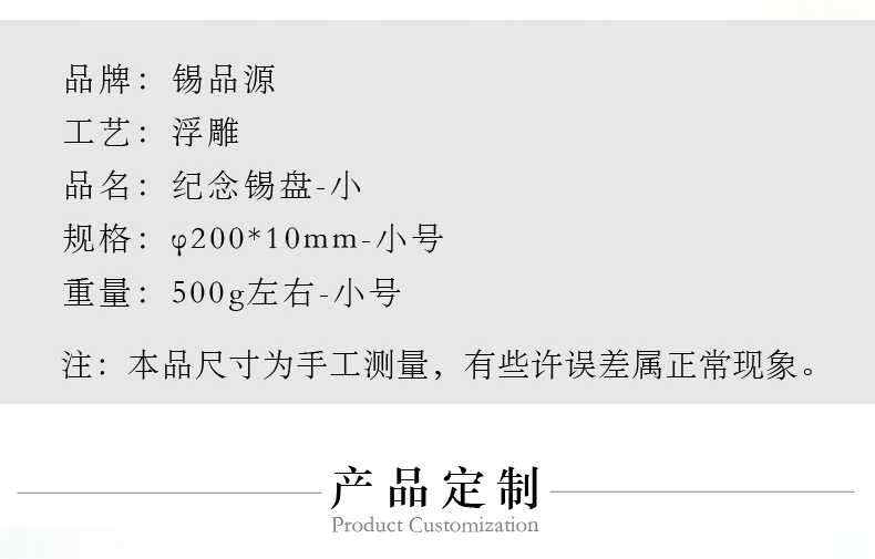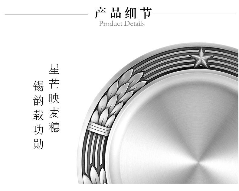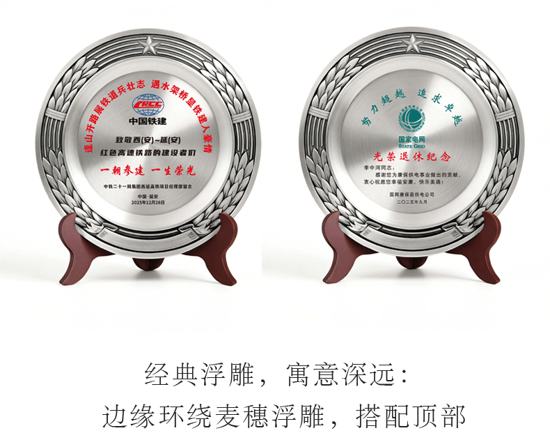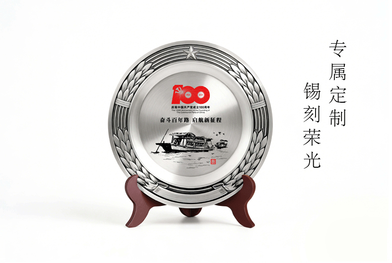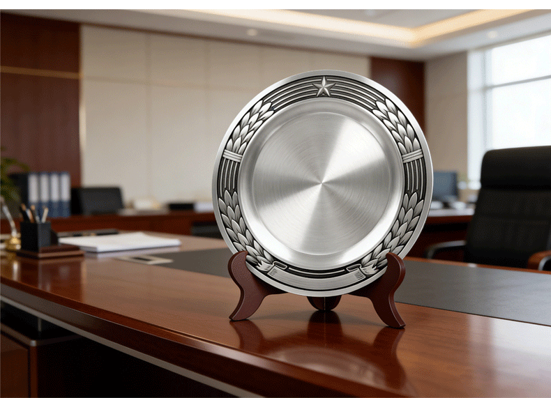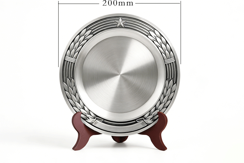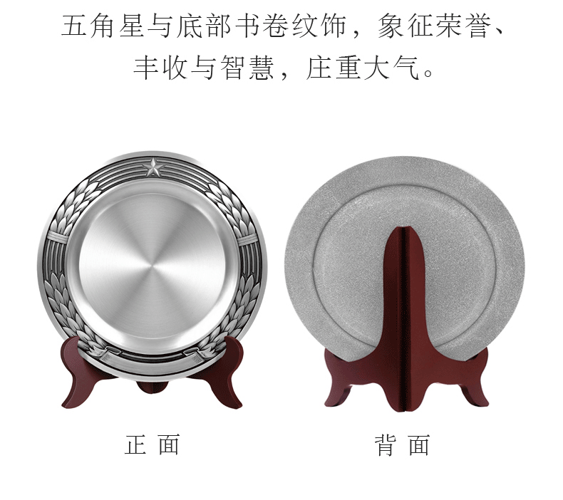 产 品:纪念盘-小 规 格:φ 200*10-小号 重 量:500g左右-小号 ✨ 锡质恒久:锡材打造,温润光泽,经久耐用不氧化,历经岁月仍熠熠生辉。 🌾 荣耀寓意:立体麦穗象征丰收成就,顶部五角星彰显信仰荣光,格调庄重大气。 🔨 匠心工艺:高浮雕工艺,细节饱满,配实木支架,摆放稳固有仪式感。 ✍️ 专属定制:中心可刻 LOGO、题词、事迹,是表彰、纪念、商务答谢等珍贵载体。 🎁 精装礼盒:配套礼盒,体面大气,送礼自用皆显诚意与格调。
