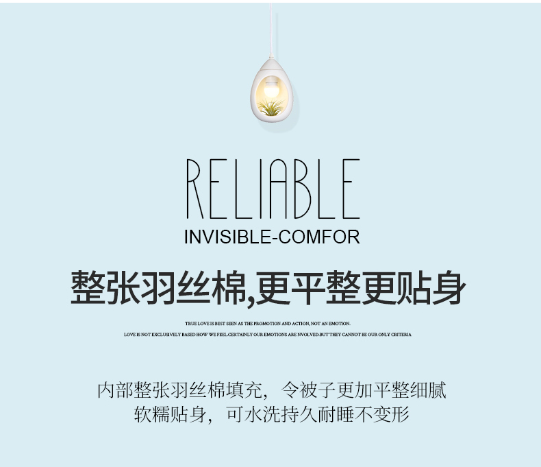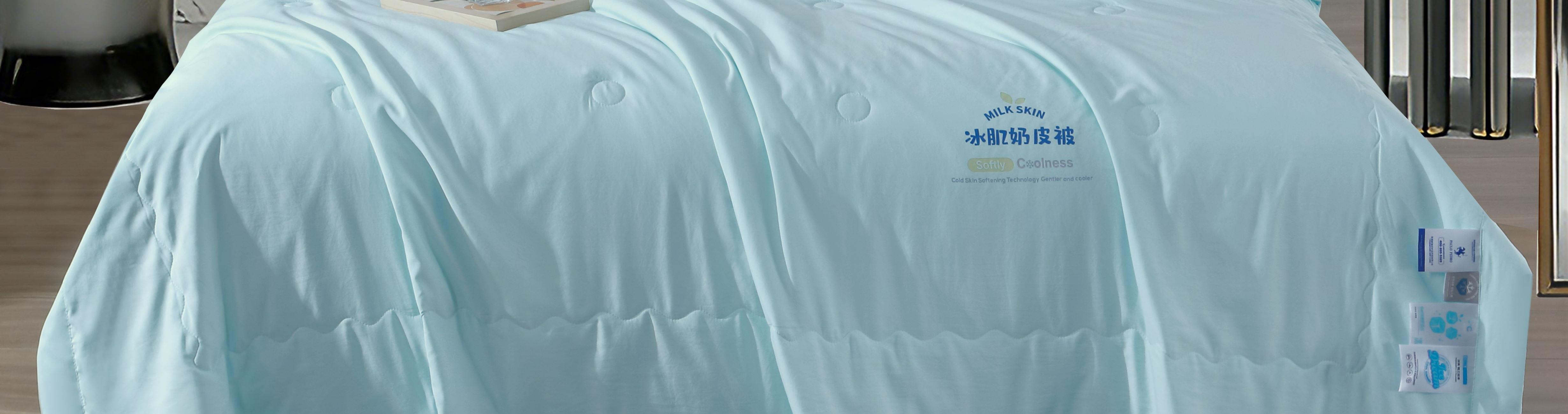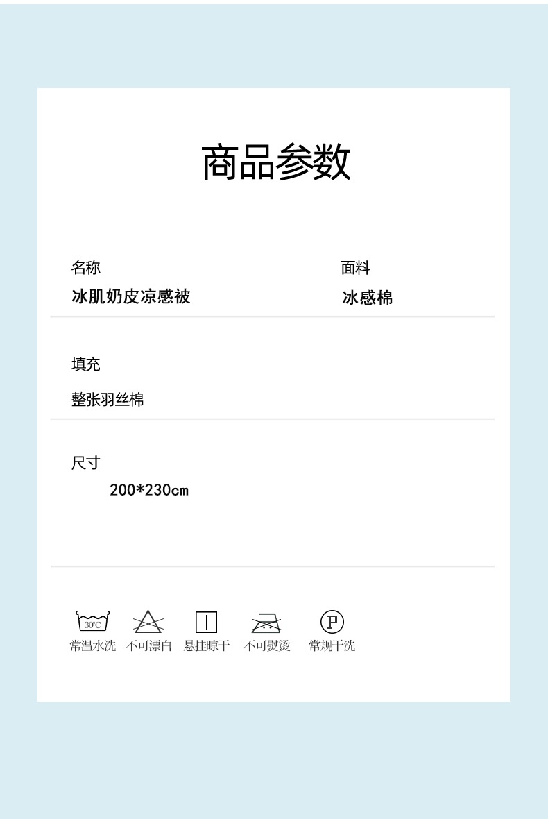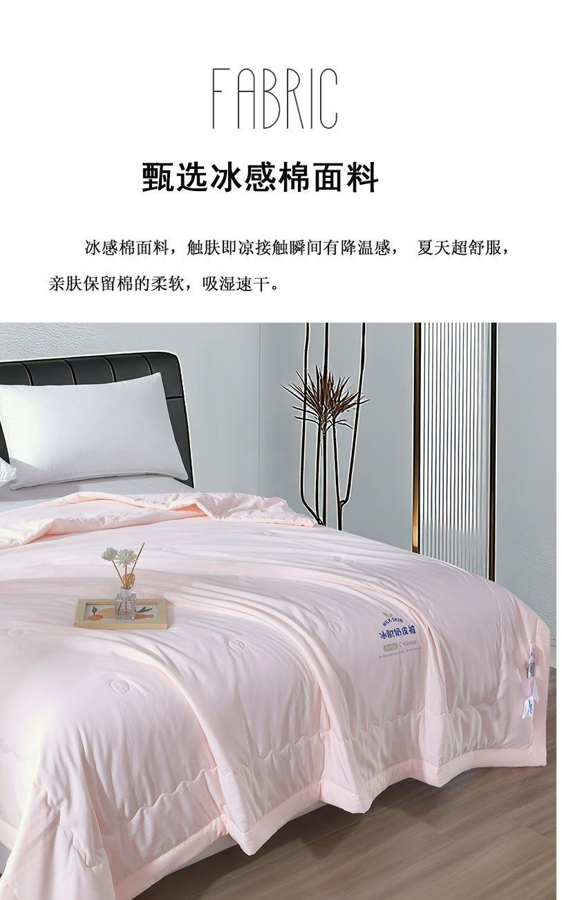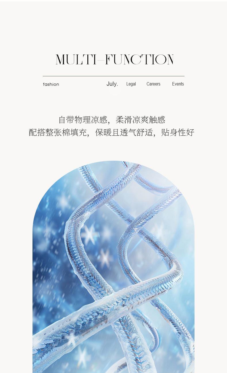 面料材质:冰感棉 填 充:羽丝棉 产品规格:200*230cm 克 重:1400g 产品包装:精美礼盒 产品特点: 采用冰感棉面料,触肤即凉接触瞬间有降温感,夏天超舒服,亲肤透气,保留棉的柔软,吸湿速干。