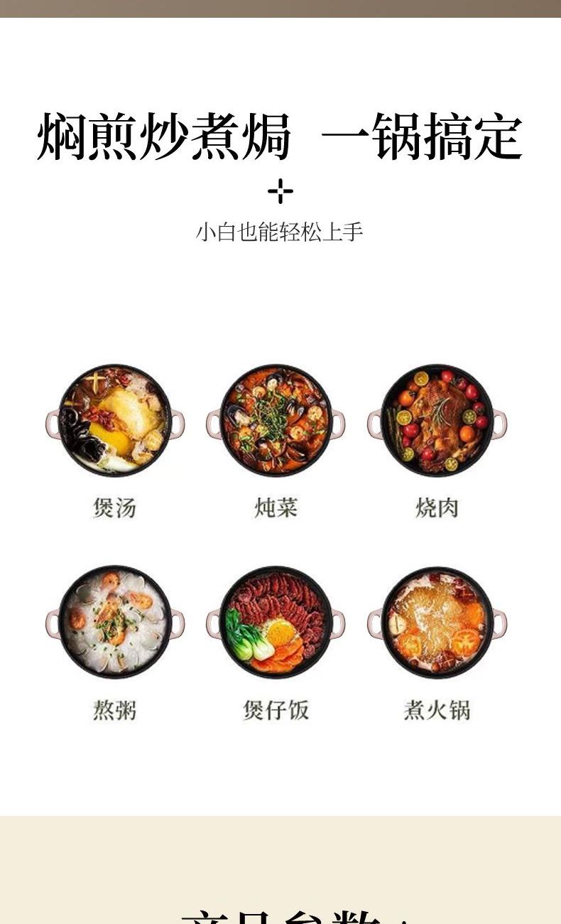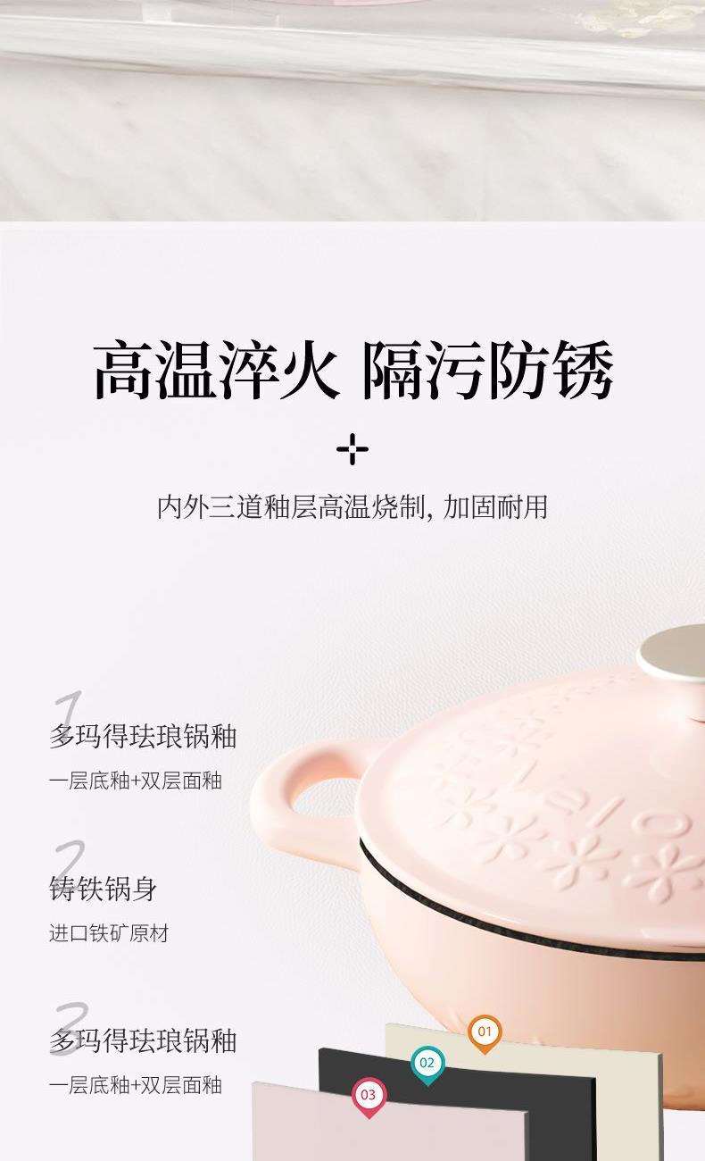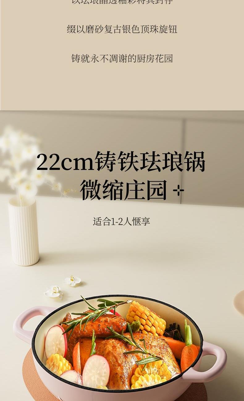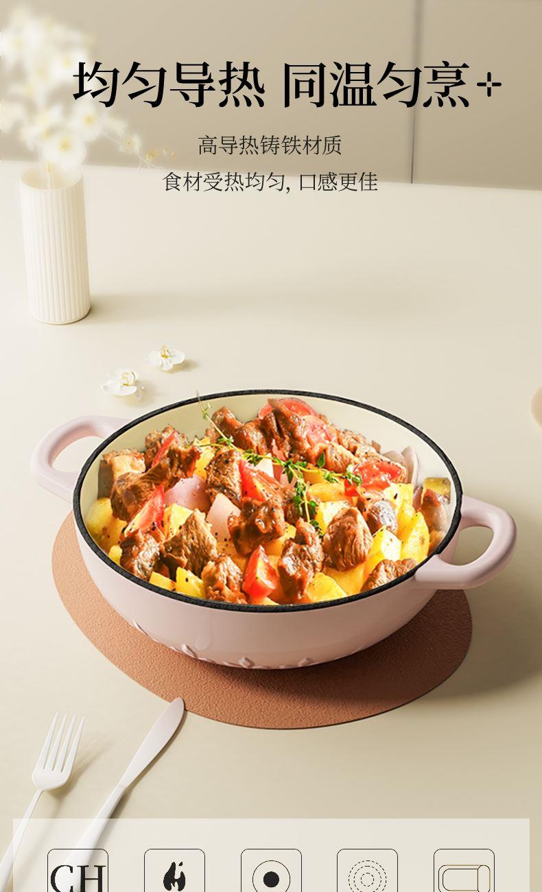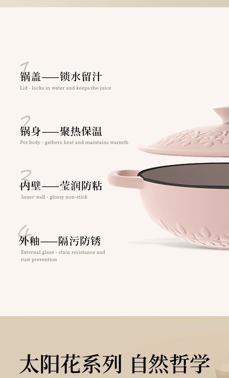【型号】A-VE022 【SKU】VE022-FL01粉 【材质】铸铁 【锅口直径】22cm 【净重/毛重】3.1kg/3.7kg 【颜色】粉色 【包装方式】邮购盒 【外箱尺寸】28.3*27.5*14.5cm 1、锅盖&锅身太阳花立体浮雕 2、聚热保温,微压设计,持续焖烧,锁水留汁; 3、高导热铸铁材质,食材受热均匀,口感更佳; 4、明火电磁炉通用,好锅不挑灶; 5、锅身圆润无死角,防滑手柄易抓取; 6、焖煎炒煮焗,一锅搞定。