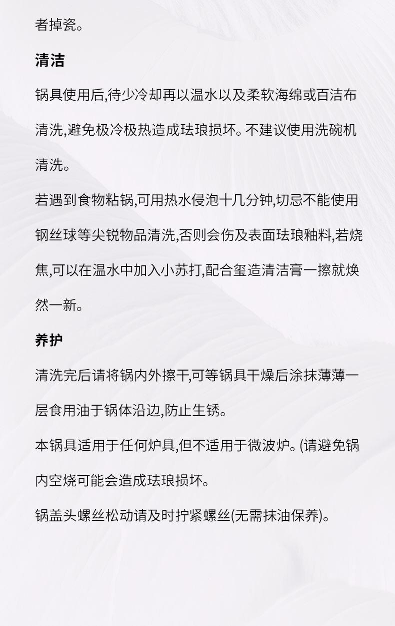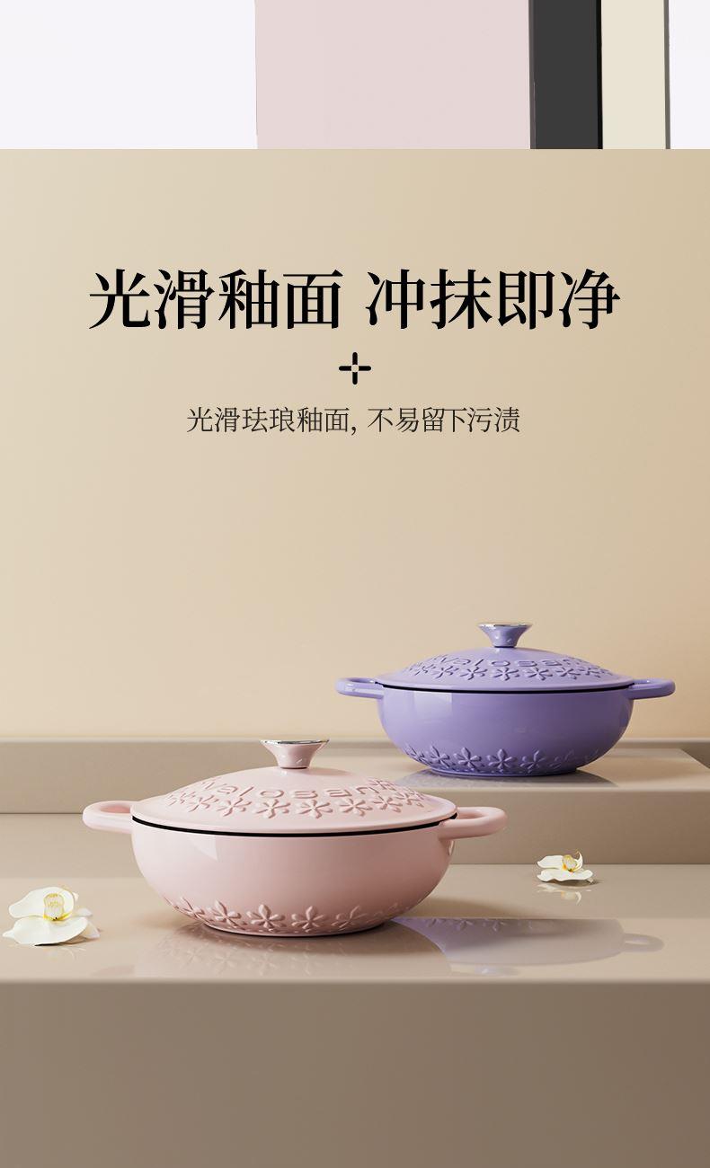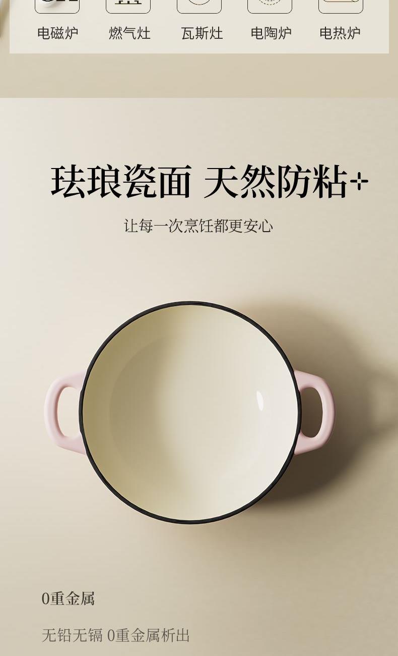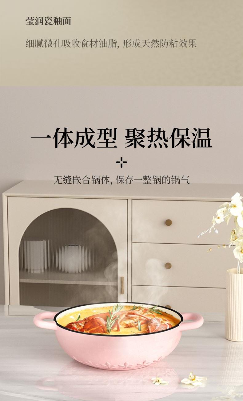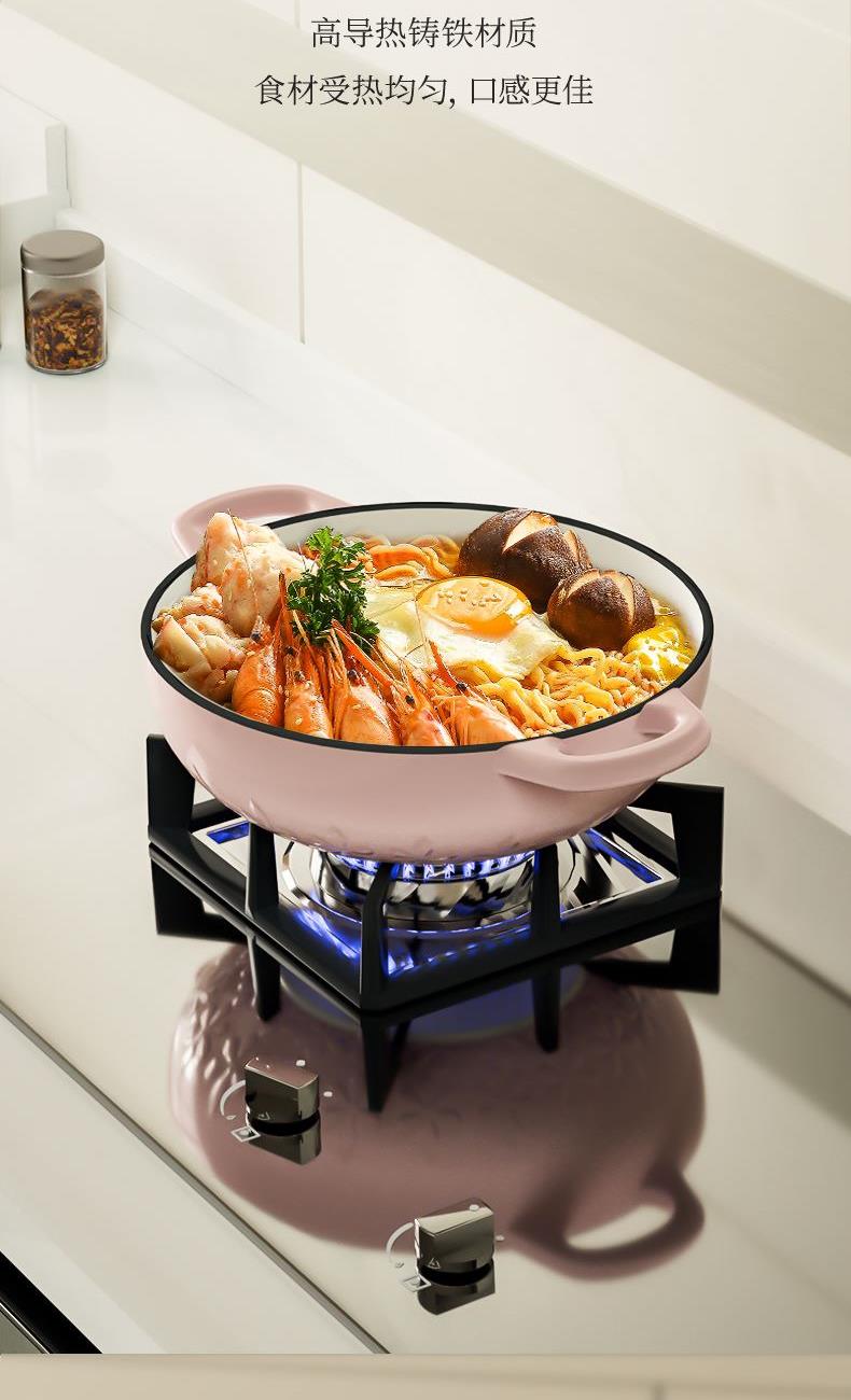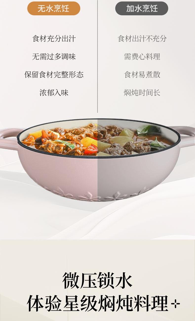 【型号】A-VE022 【SKU】VE022-FL01粉 【材质】铸铁 【锅口直径】22cm 【净重/毛重】3.1kg/3.7kg 【颜色】粉色 【包装方式】邮购盒 【外箱尺寸】28.3*27.5*14.5cm 1、锅盖&锅身太阳花立体浮雕 2、聚热保温,微压设计,持续焖烧,锁水留汁; 3、高导热铸铁材质,食材受热均匀,口感更佳; 4、明火电磁炉通用,好锅不挑灶; 5、锅身圆润无死角,防滑手柄易抓取; 6、焖煎炒煮焗,一锅搞定。