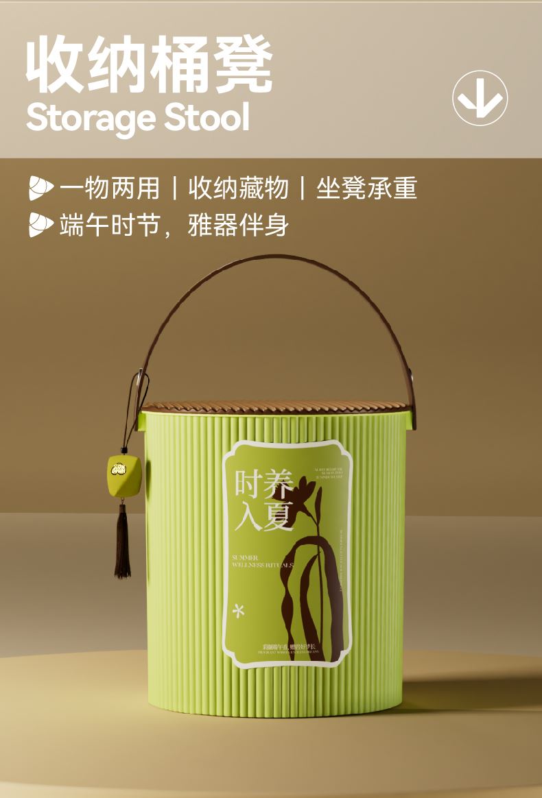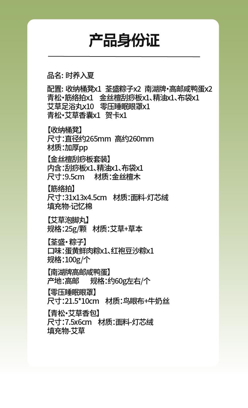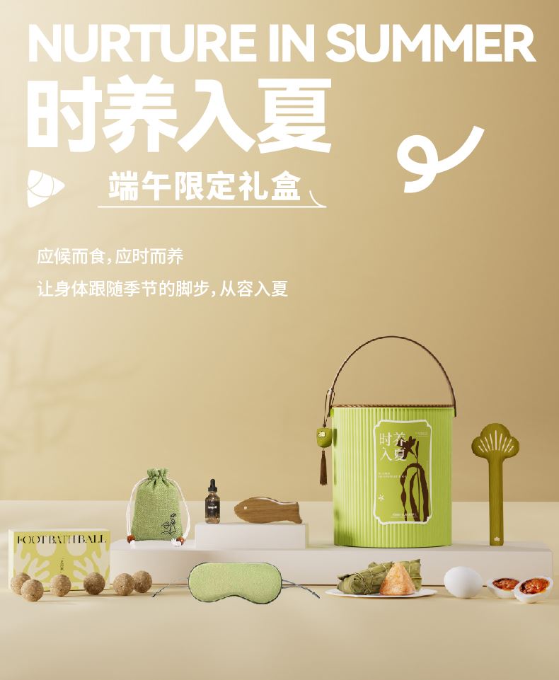 夏之将至,阳气生发 正是将身心托付给时序的好时节。 一以古法养生智慧,应候而食,应时而养 舌尖品粽香,凝神安夏;刮痧板通经络,疏解困乏; 足浴解疲乏,引火归元 三者合一,让身体跟随季节的脚步,从容入夏 内配: 配置一:收纳桶凳x1 配置二:荃盛粽子x2 配置三:南湖牌·高邮咸鸭蛋x2 配置四:青松·筋络拍x1 配置五:金丝檀刮痧板x1、精油x1、布袋x1 配置六:艾草足浴丸x10 配置七:零压睡眠眼罩x1 配置八:青松·艾草香囊x1配置九:贺卡x1