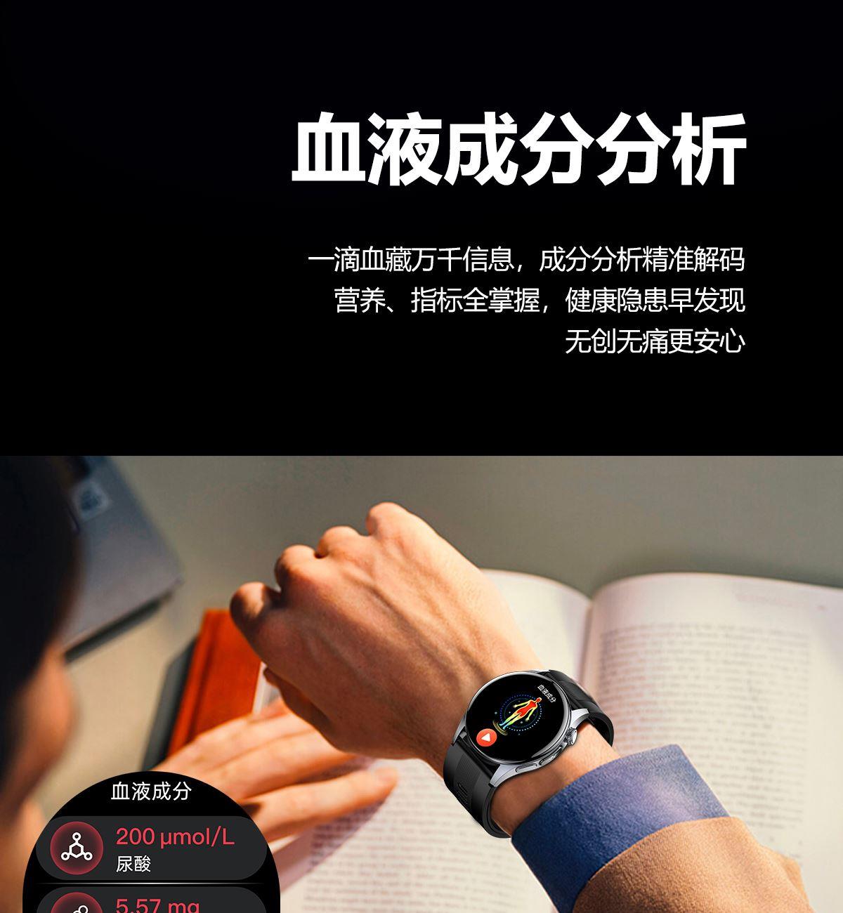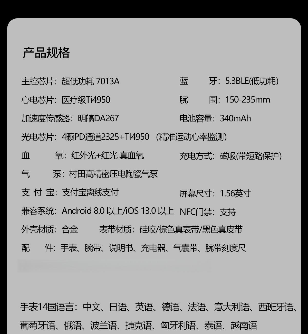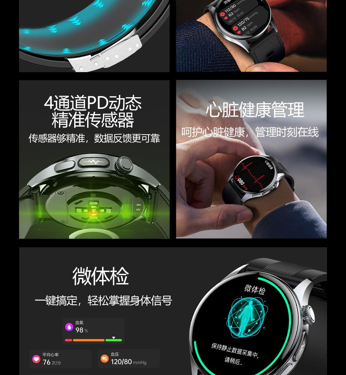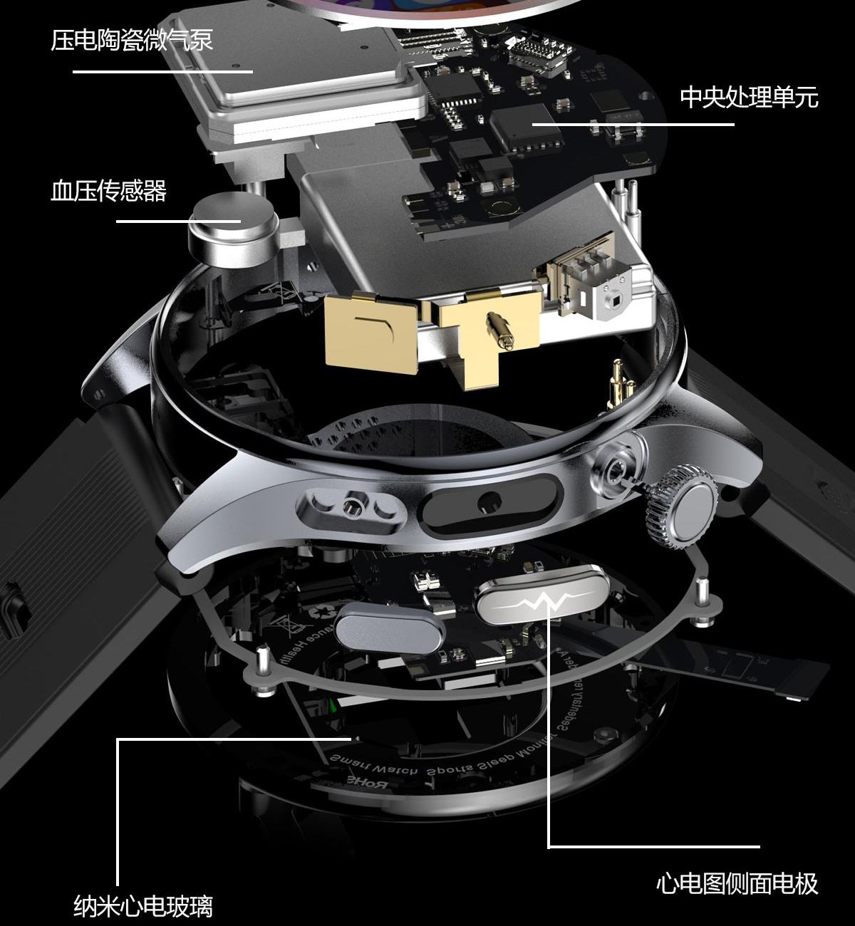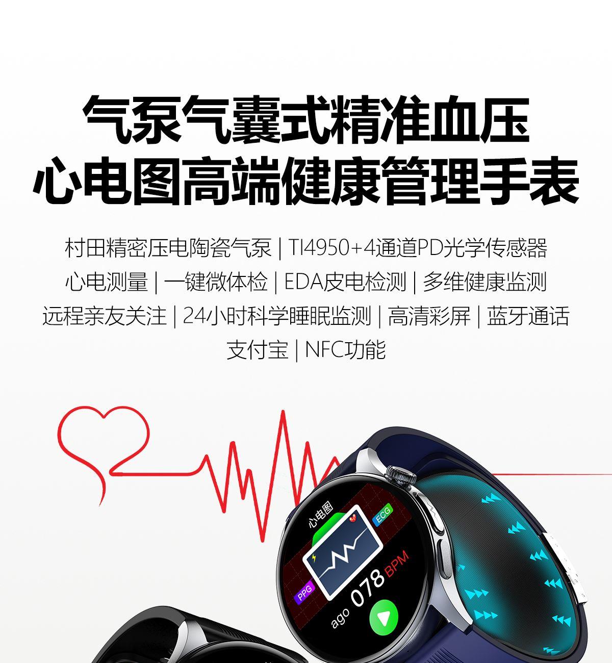 1. 采用日本村田高精密压电陶瓷气泵,血压测试稳定,一致性好,精量姿势判断、错误姿势、错误结果过滤和提醒。(密封墙体,防水性能也更好) 2. 采用Ti4950进口级芯片+纳米超导心电玻璃,采集心电图更 3. 4PD多通道动态心率血氧监测,采集心率血氧更 4. 一键微tijian功能,情绪检测,疲劳度检测 5. EDA皮电功能(测试情绪和交感神经活跃度、抑郁症风险等) 6. 科学睡眠(24小时睡眠监测) 其他:智能语音助手,蓝牙通话,支付宝离线支付,NFC门禁,SOS紧急呼叫功能,身体成分(体脂BMI)、无创xuetang评估,血液成分评估(尿酸血脂功能),梅脱功能,血氧监测,血压监测,呼吸训练,女性健康,心率监测,体温监测,手电筒,计步/卡路里/距离,多运动模式,闹钟,息屏显示功能,天气预报,游戏,音乐播放和控制。