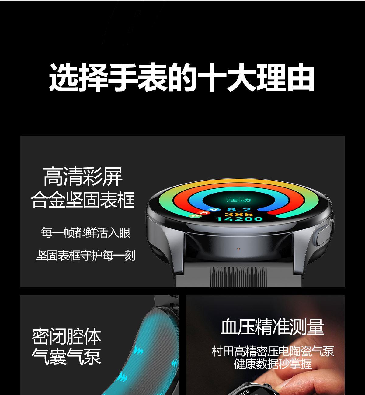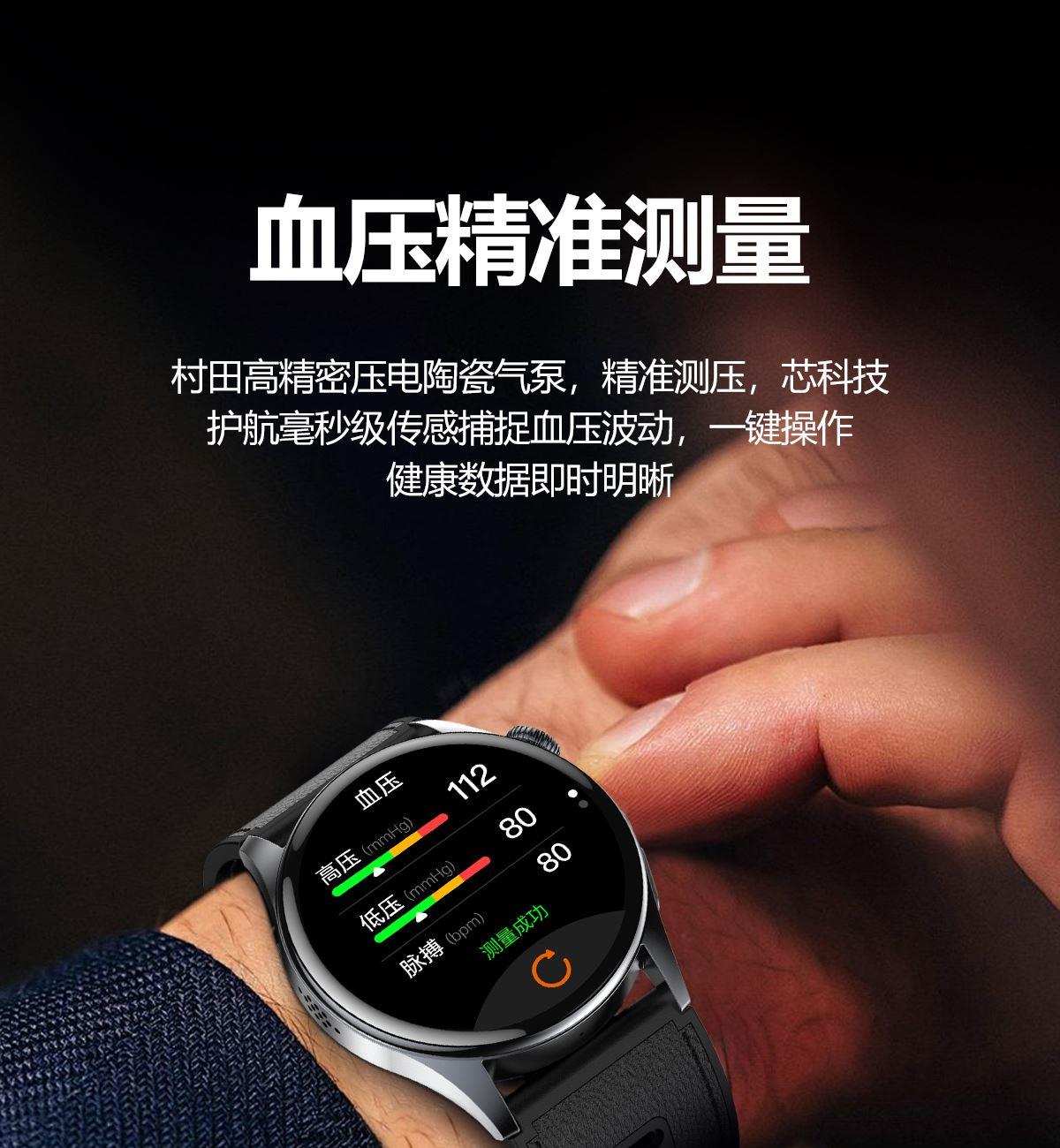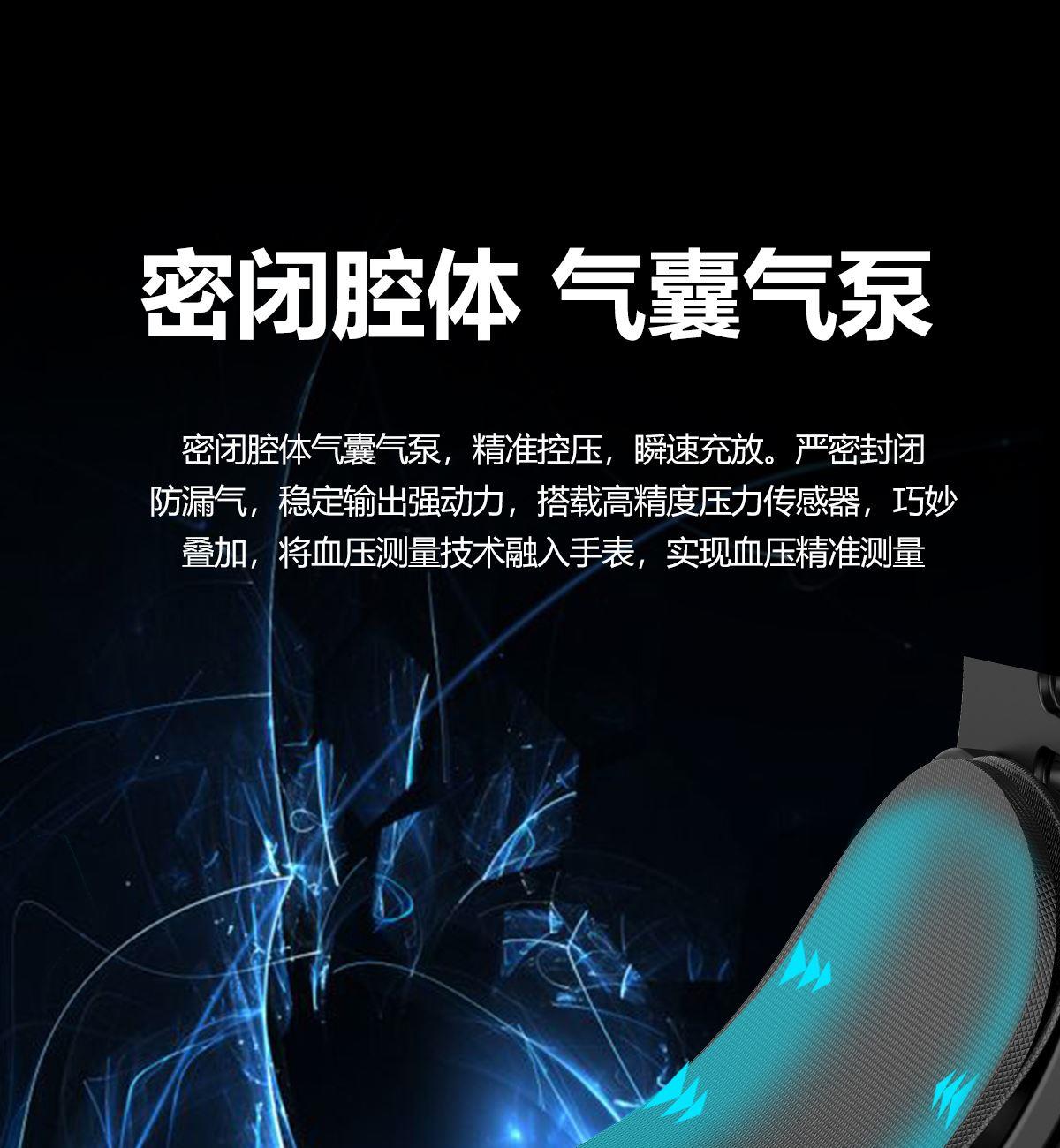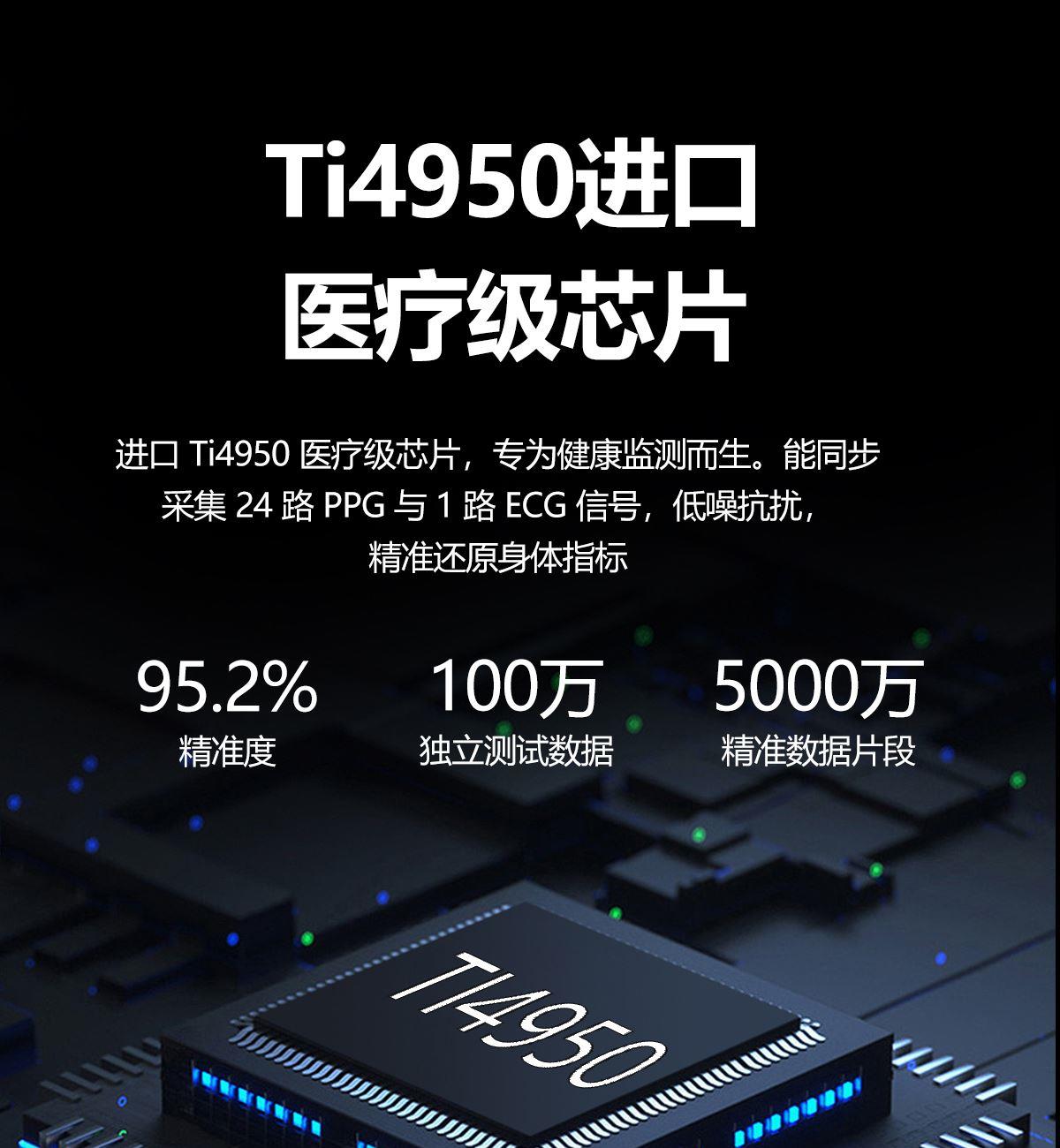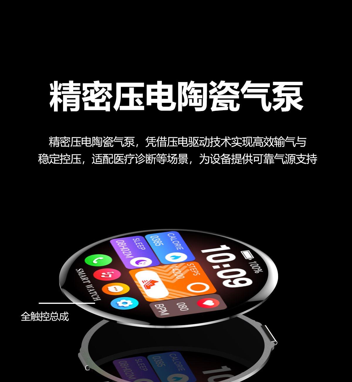 1. 采用日本村田高精密压电陶瓷气泵,血压测试稳定,一致性好,精量姿势判断、错误姿势、错误结果过滤和提醒。(密封墙体,防水性能也更好) 2. 采用Ti4950进口级芯片+纳米超导心电玻璃,采集心电图更 3. 4PD多通道动态心率血氧监测,采集心率血氧更 4. 一键微tijian功能,情绪检测,疲劳度检测 5. EDA皮电功能(测试情绪和交感神经活跃度、抑郁症风险等) 6. 科学睡眠(24小时睡眠监测) 其他:智能语音助手,蓝牙通话,支付宝离线支付,NFC门禁,SOS紧急呼叫功能,身体成分(体脂BMI)、无创xuetang评估,血液成分评估(尿酸血脂功能),梅脱功能,血氧监测,血压监测,呼吸训练,女性健康,心率监测,体温监测,手电筒,计步/卡路里/距离,多运动模式,闹钟,息屏显示功能,天气预报,游戏,音乐播放和控制。
