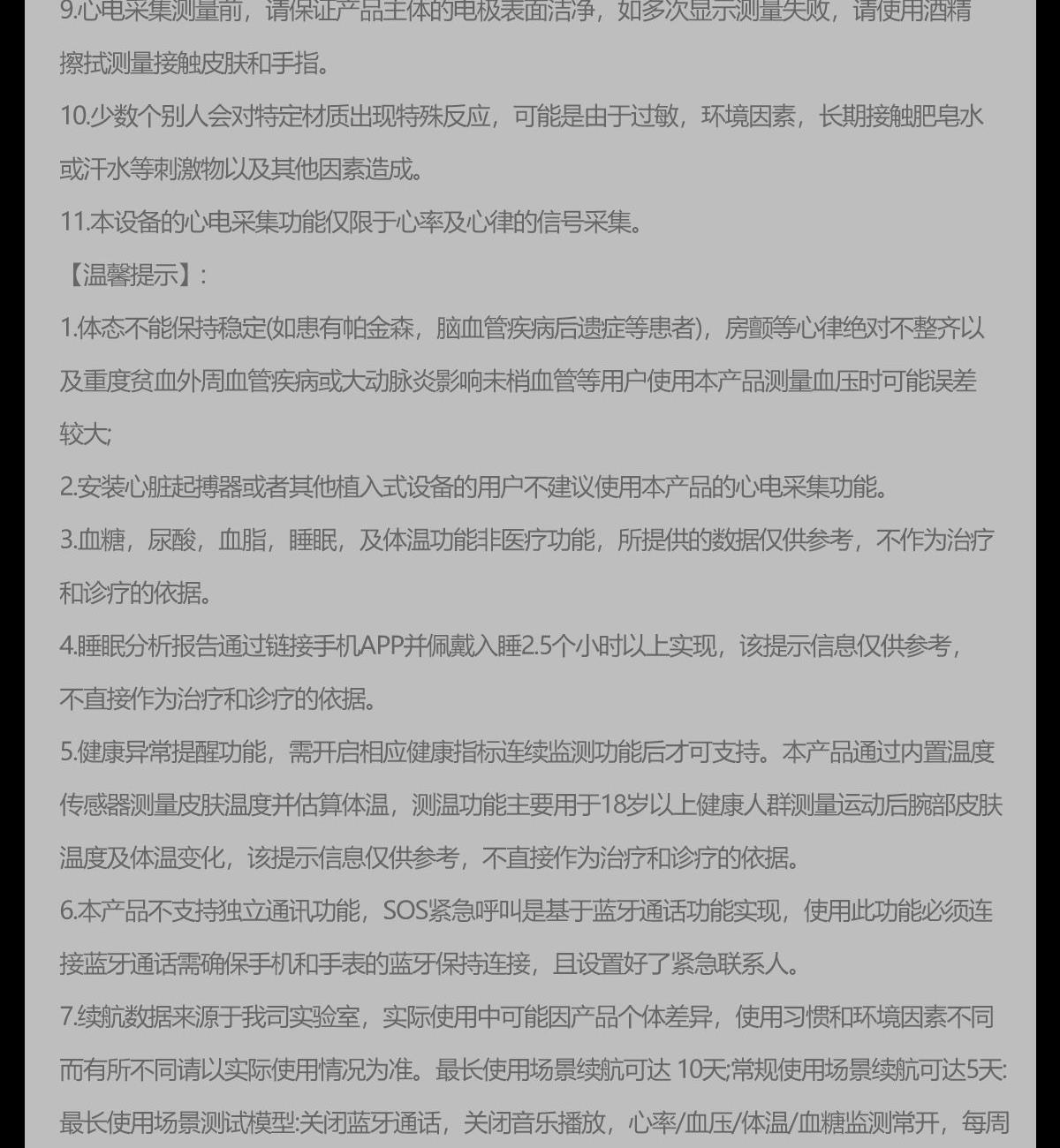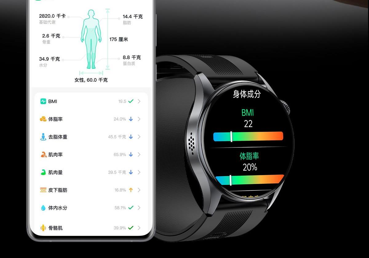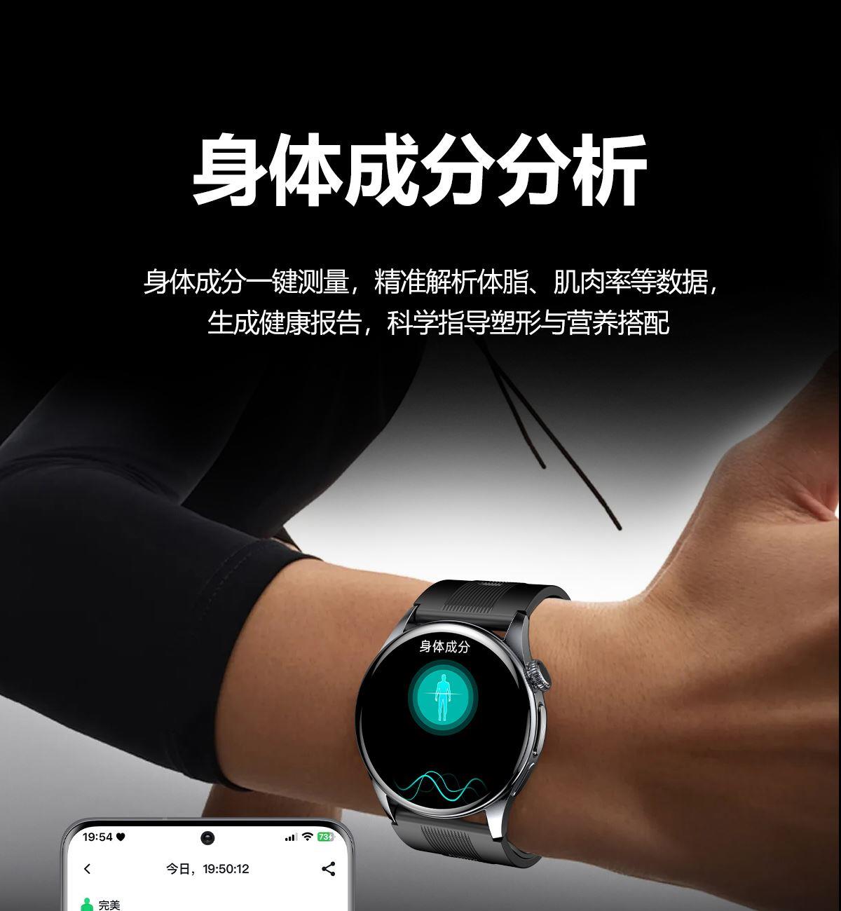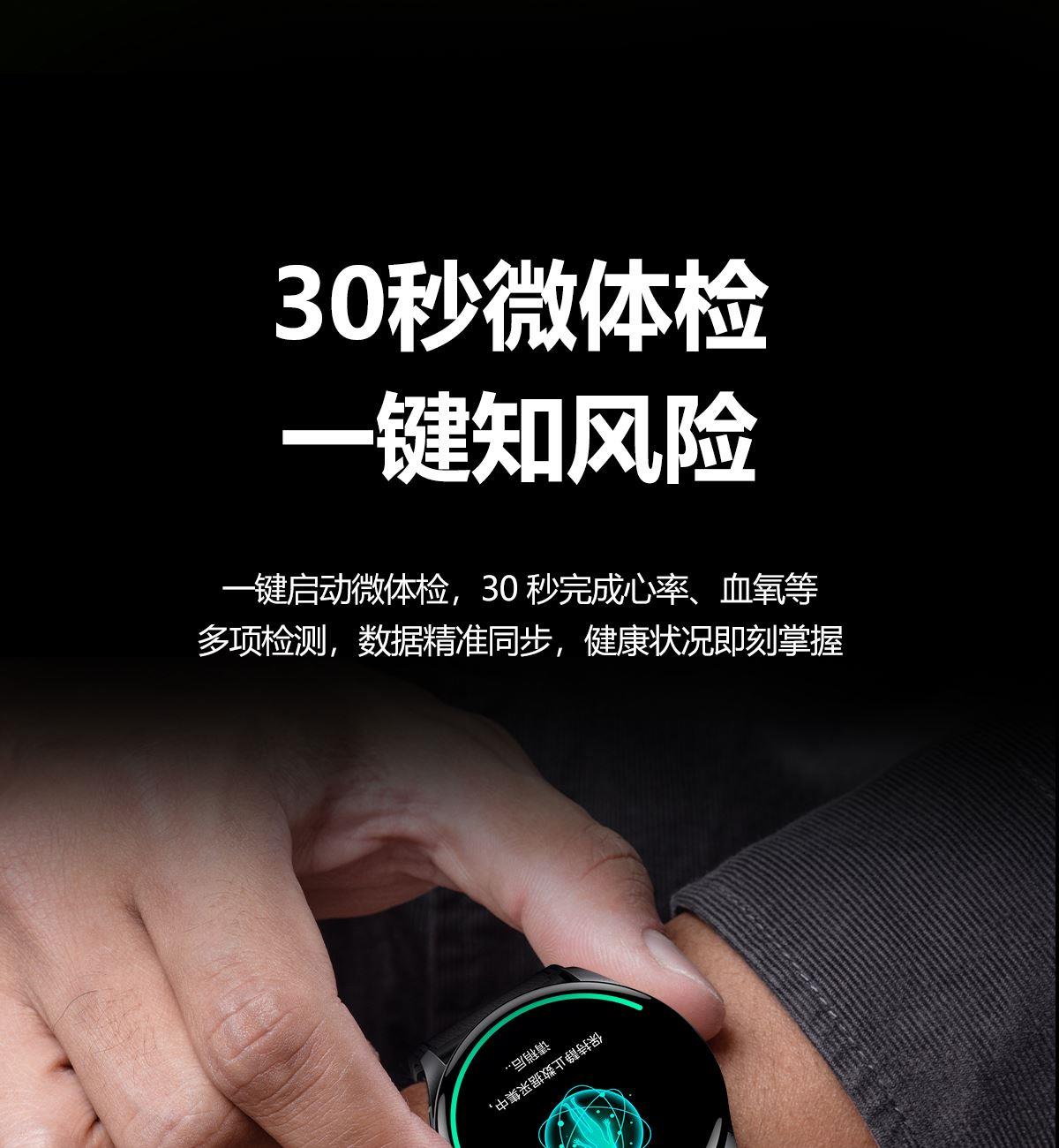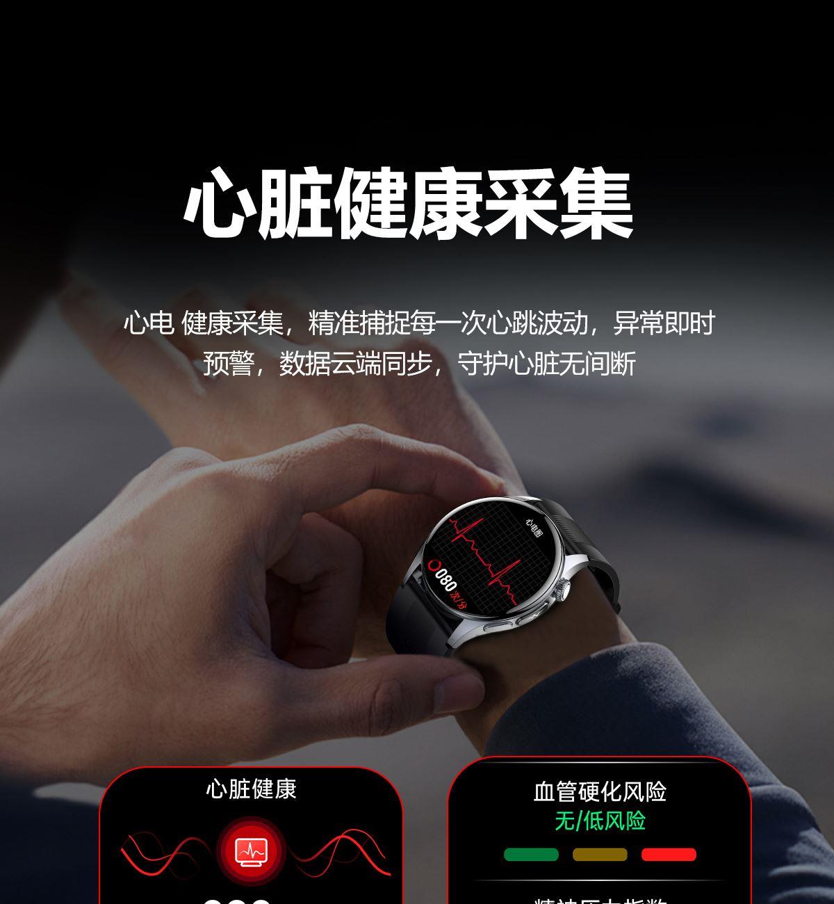1. 采用日本村田高精密压电陶瓷气泵,血压测试稳定,一致性好,精量姿势判断、错误姿势、错误结果过滤和提醒。(密封墙体,防水性能也更好) 2. 采用Ti4950进口级芯片+纳米超导心电玻璃,采集心电图更 3. 4PD多通道动态心率血氧监测,采集心率血氧更 4. 一键微tijian功能,情绪检测,疲劳度检测 5. EDA皮电功能(测试情绪和交感神经活跃度、抑郁症风险等) 6. 科学睡眠(24小时睡眠监测) 其他:智能语音助手,蓝牙通话,支付宝离线支付,NFC门禁,SOS紧急呼叫功能,身体成分(体脂BMI)、无创xuetang评估,血液成分评估(尿酸血脂功能),梅脱功能,血氧监测,血压监测,呼吸训练,女性健康,心率监测,体温监测,手电筒,计步/卡路里/距离,多运动模式,闹钟,息屏显示功能,天气预报,游戏,音乐播放和控制。