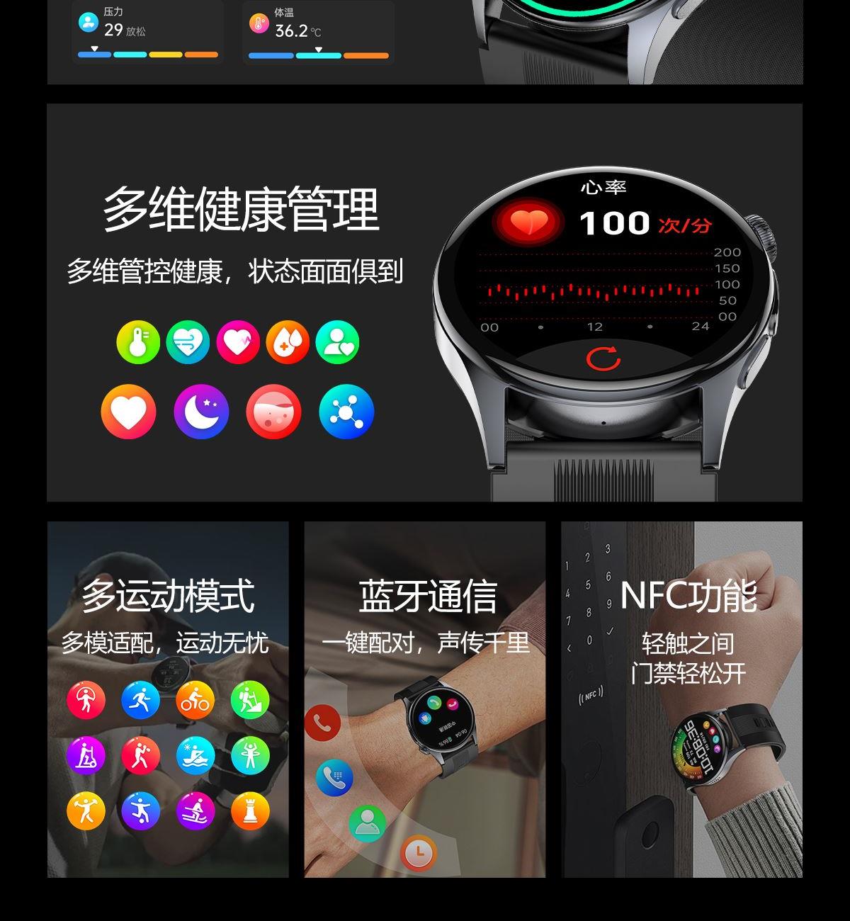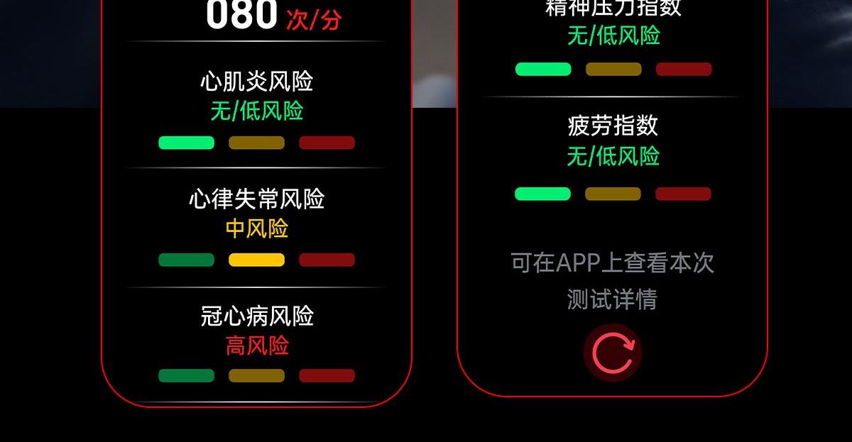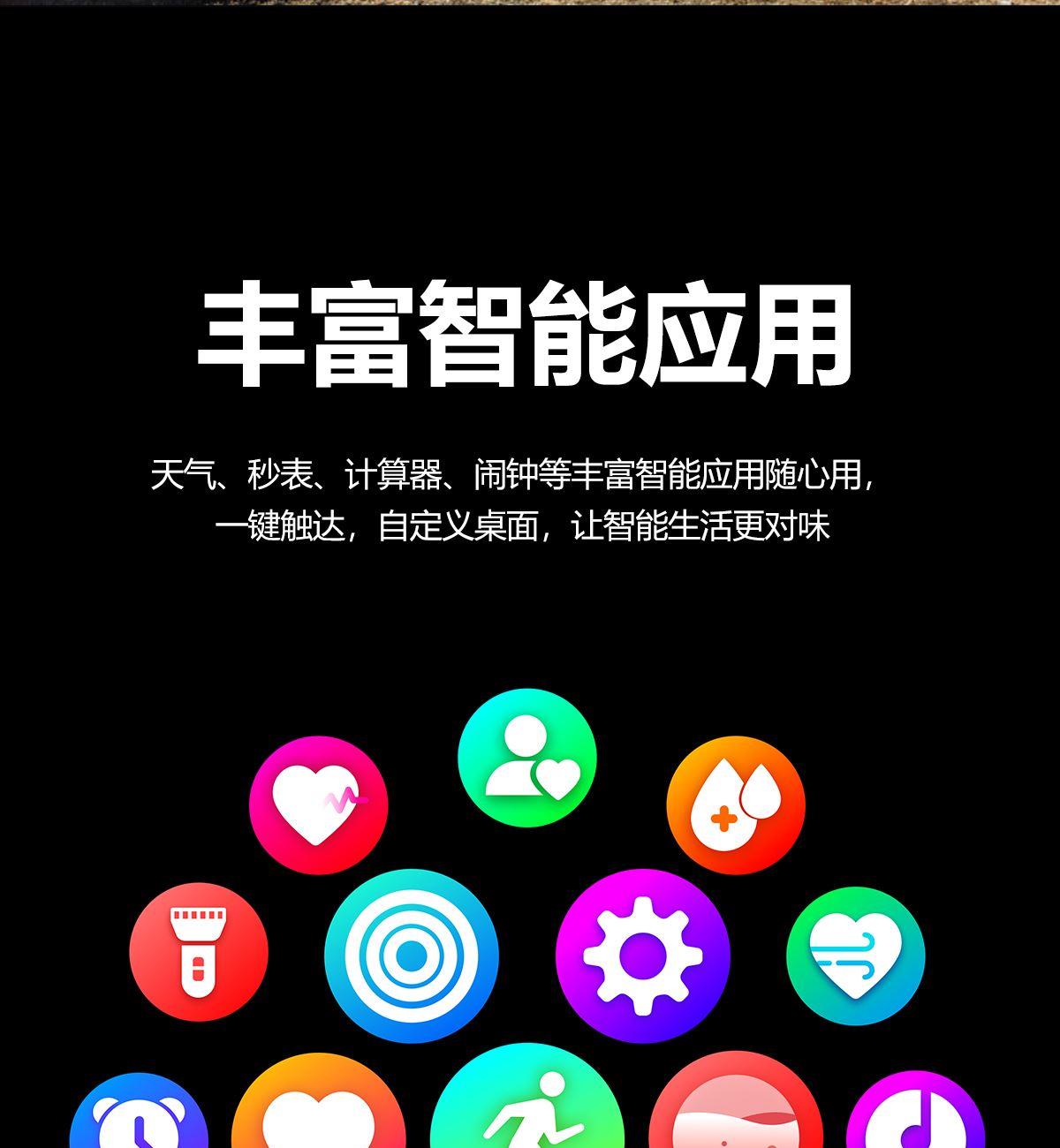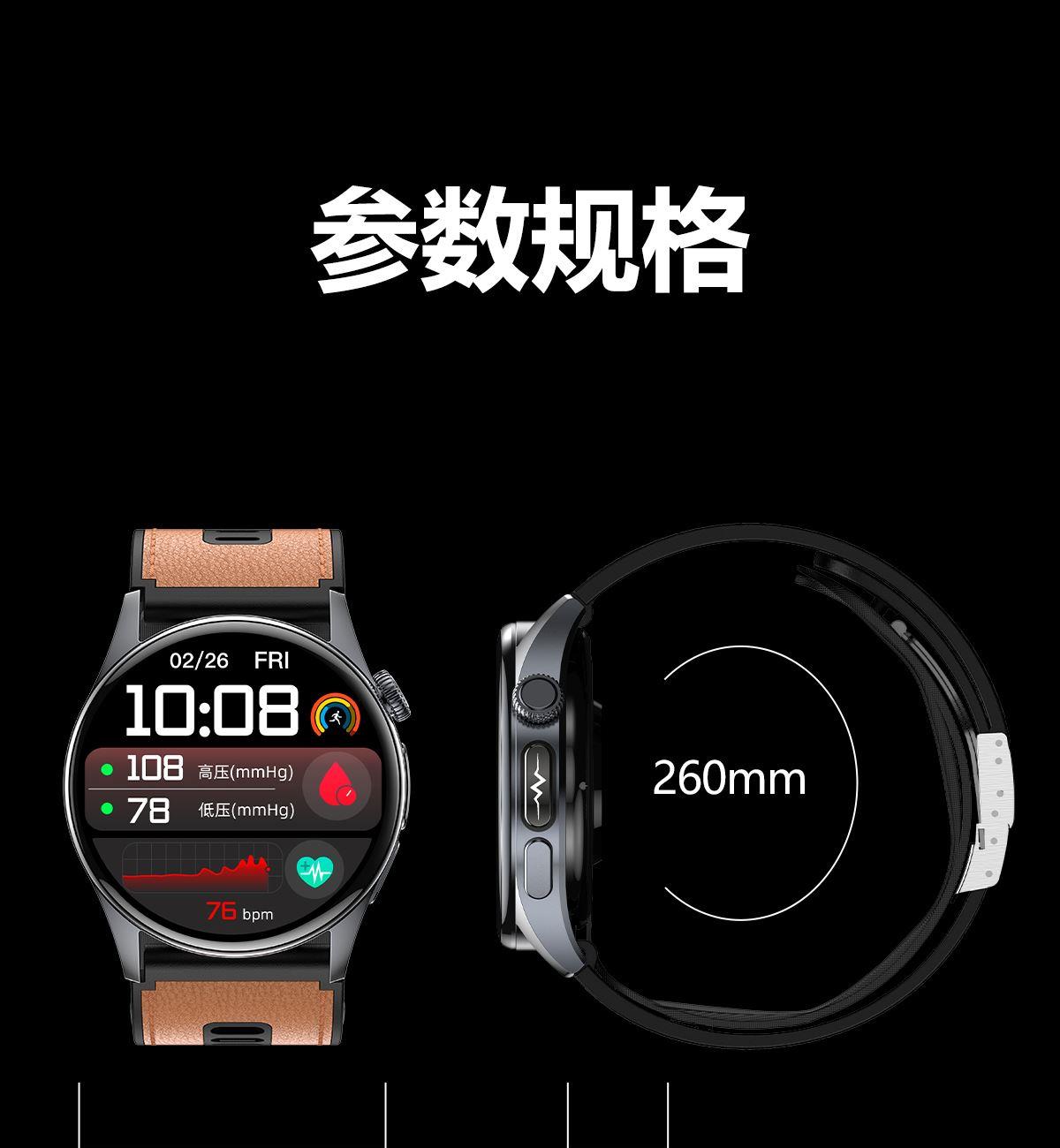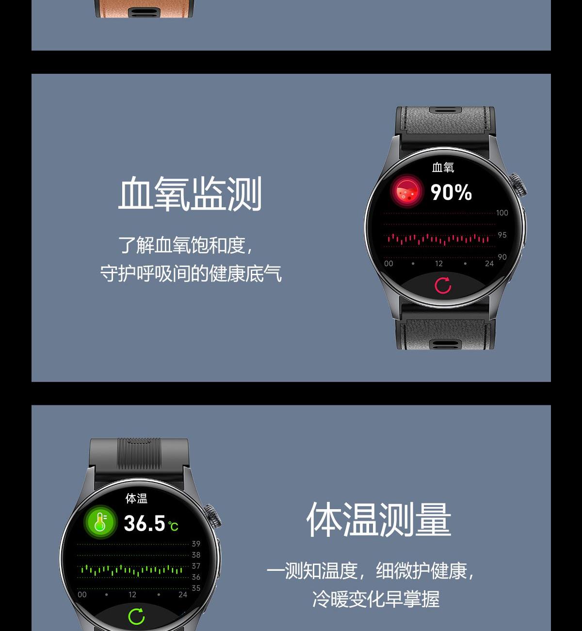 1. 采用日本村田高精密压电陶瓷气泵,血压测试稳定,一致性好,精量姿势判断、错误姿势、错误结果过滤和提醒。(密封墙体,防水性能也更好) 2. 采用Ti4950进口级芯片+纳米超导心电玻璃,采集心电图更 3. 4PD多通道动态心率血氧监测,采集心率血氧更 4. 一键微tijian功能,情绪检测,疲劳度检测 5. EDA皮电功能(测试情绪和交感神经活跃度、抑郁症风险等) 6. 科学睡眠(24小时睡眠监测) 其他:智能语音助手,蓝牙通话,支付宝离线支付,NFC门禁,SOS紧急呼叫功能,身体成分(体脂BMI)、无创xuetang评估,血液成分评估(尿酸血脂功能),梅脱功能,血氧监测,血压监测,呼吸训练,女性健康,心率监测,体温监测,手电筒,计步/卡路里/距离,多运动模式,闹钟,息屏显示功能,天气预报,游戏,音乐播放和控制。