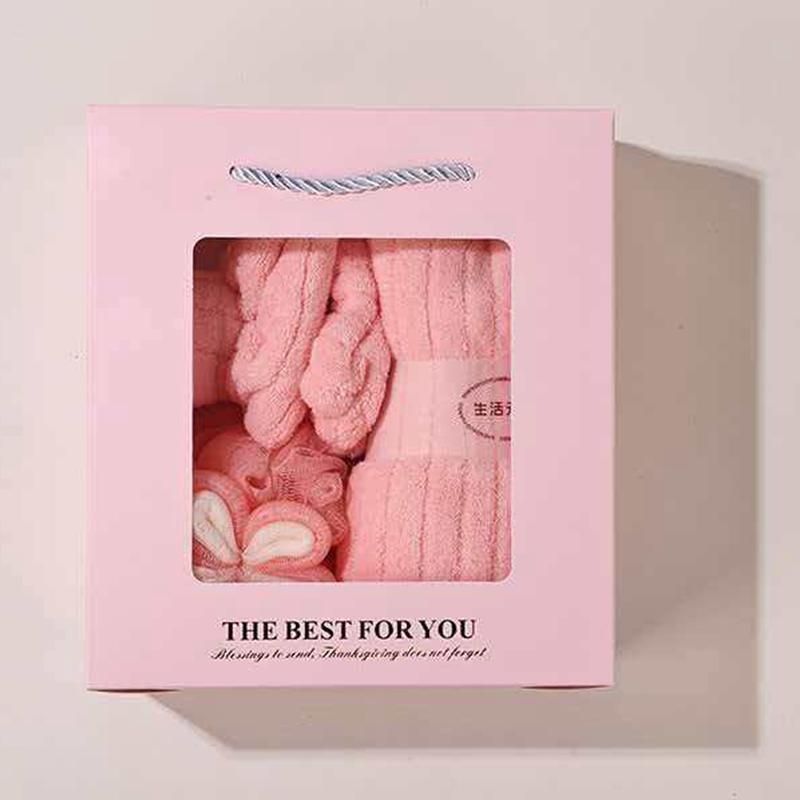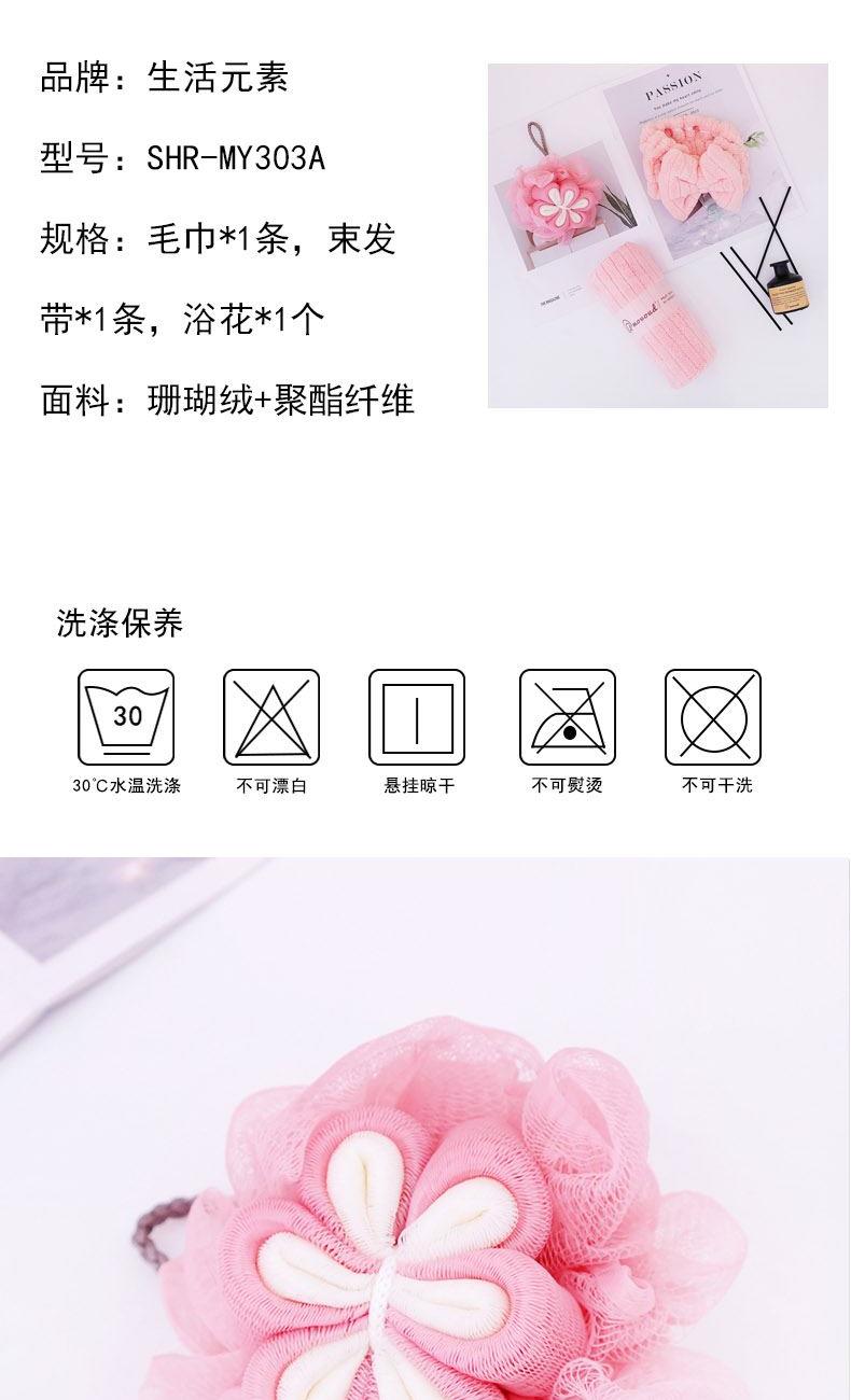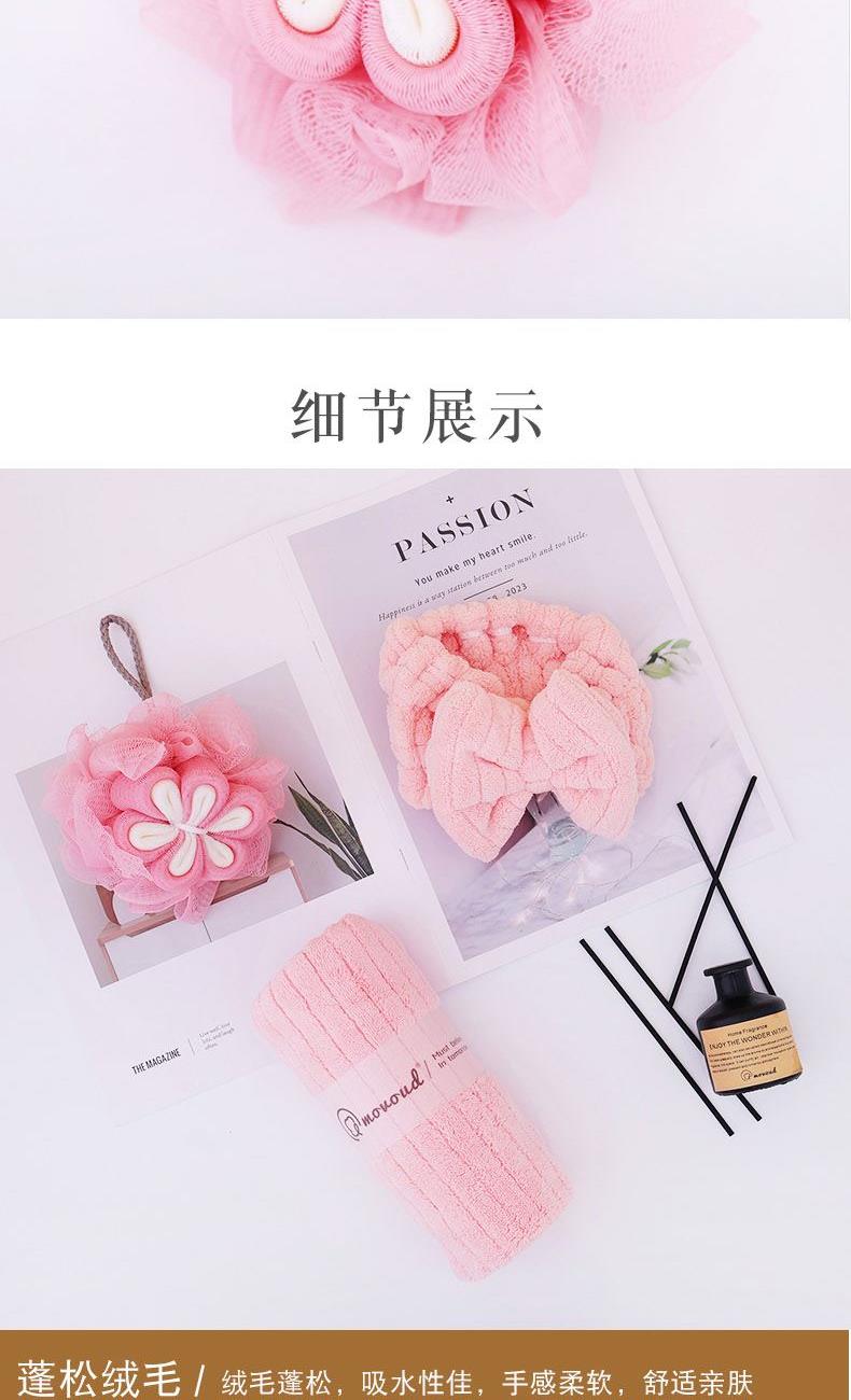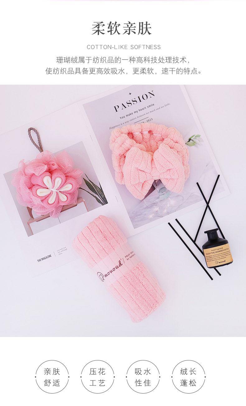 规格:毛巾*1条,束发带*1条,浴花*1个 尺寸: 毛巾:35*75CM 面料:珊瑚绒+聚酯纤维 包装方式:礼盒装 包装尺寸: 200*200*9mm 质地细腻、手感柔软、不易掉毛、不起球、不掉色,对皮肤无任何刺激,不过敏。外形美观,颜色丰富。
