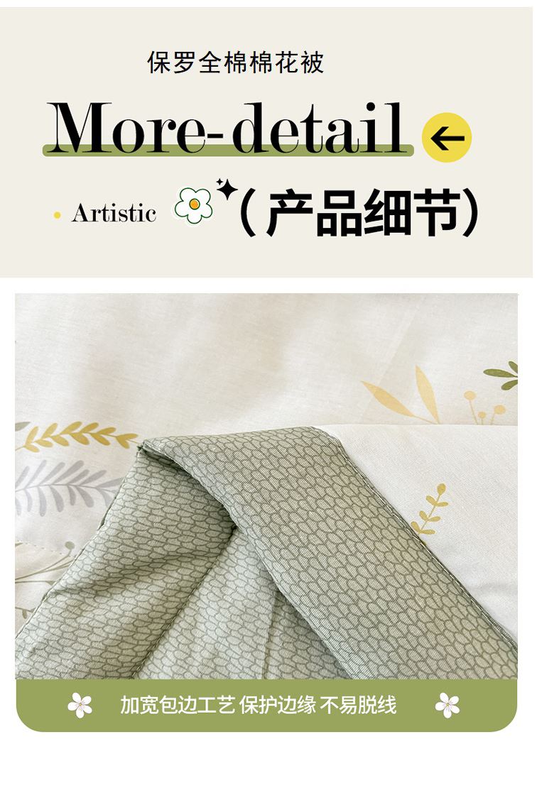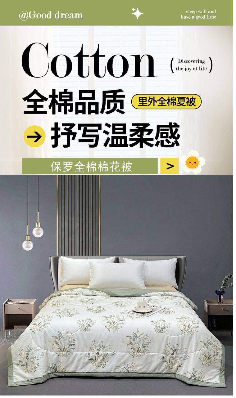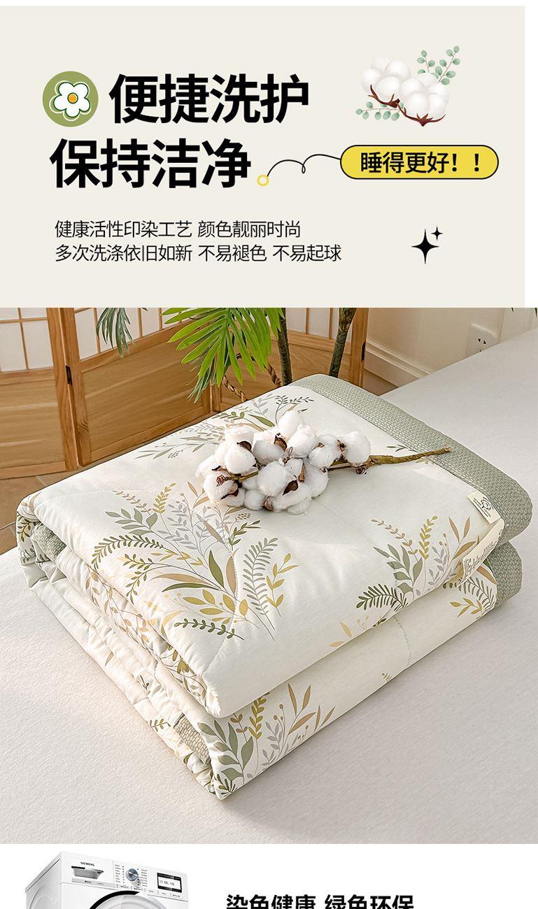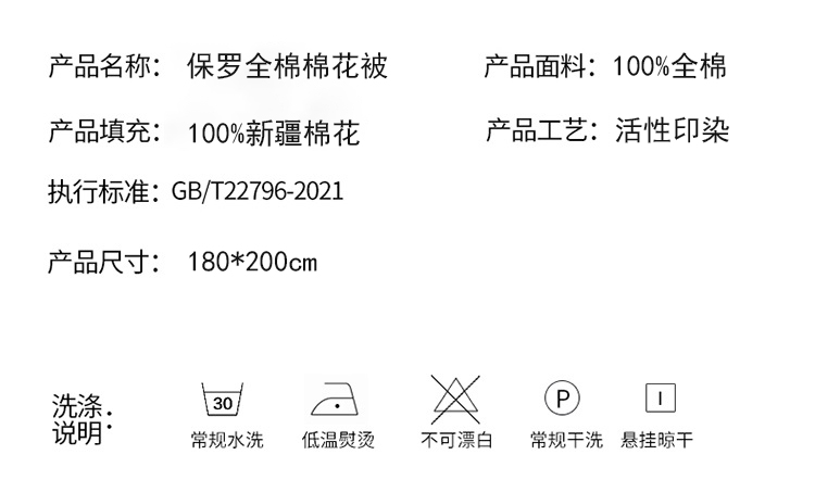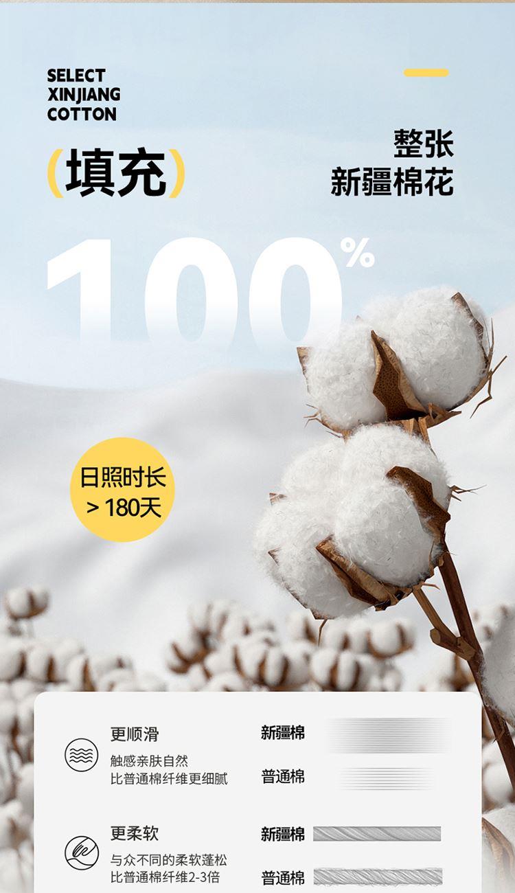 面料材质:全棉 填 充:新疆棉花 产品规格:180*200cm 克 重:1150g 产品包装:精美礼盒 产品特点: 全棉面料舒适、温度平衡,接受皮肤时感到柔软而不僵硬。棉纤维是天然纤维。纯棉织品与肌肤接触无任何刺激,对人体有益无害。