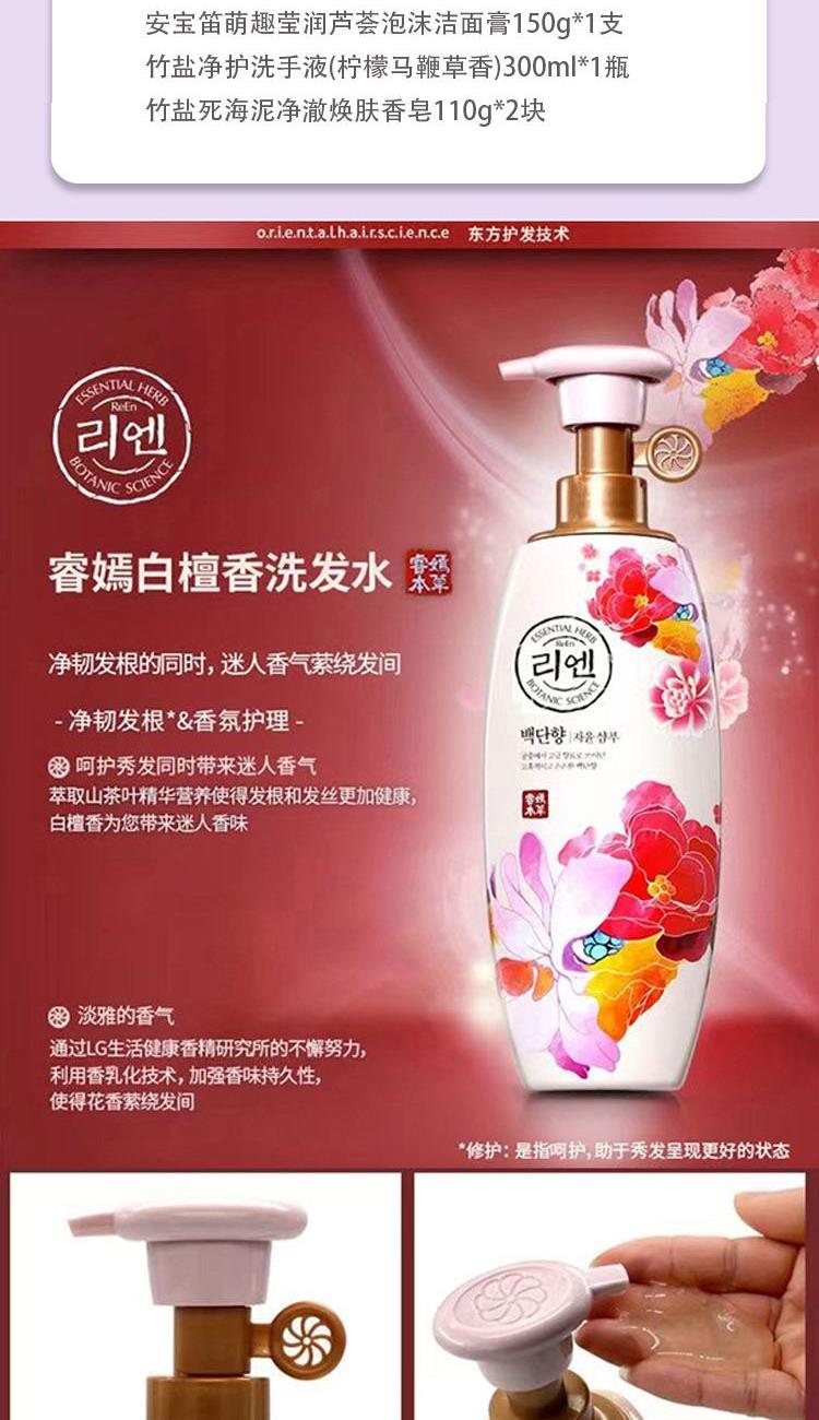 睿嫣馥郁白檀香洗发水500ml*2瓶 安宝笛自然椰子香保湿护手霜75ml*1支 蓓安洁天然矿物质洗洁精(温和型)385ml*1瓶 舒福蓝花丹醋纤维除味剂(茉莉花香)400ml*1瓶 霏丝佳柔润保湿霜50ml*1支 安宝笛萌趣莹润芦荟泡沫洁面膏150g*1支 竹盐净护洗手液(柠檬马鞭草香)300ml*1瓶 竹盐死海泥净澈焕肤香皂110g*2块